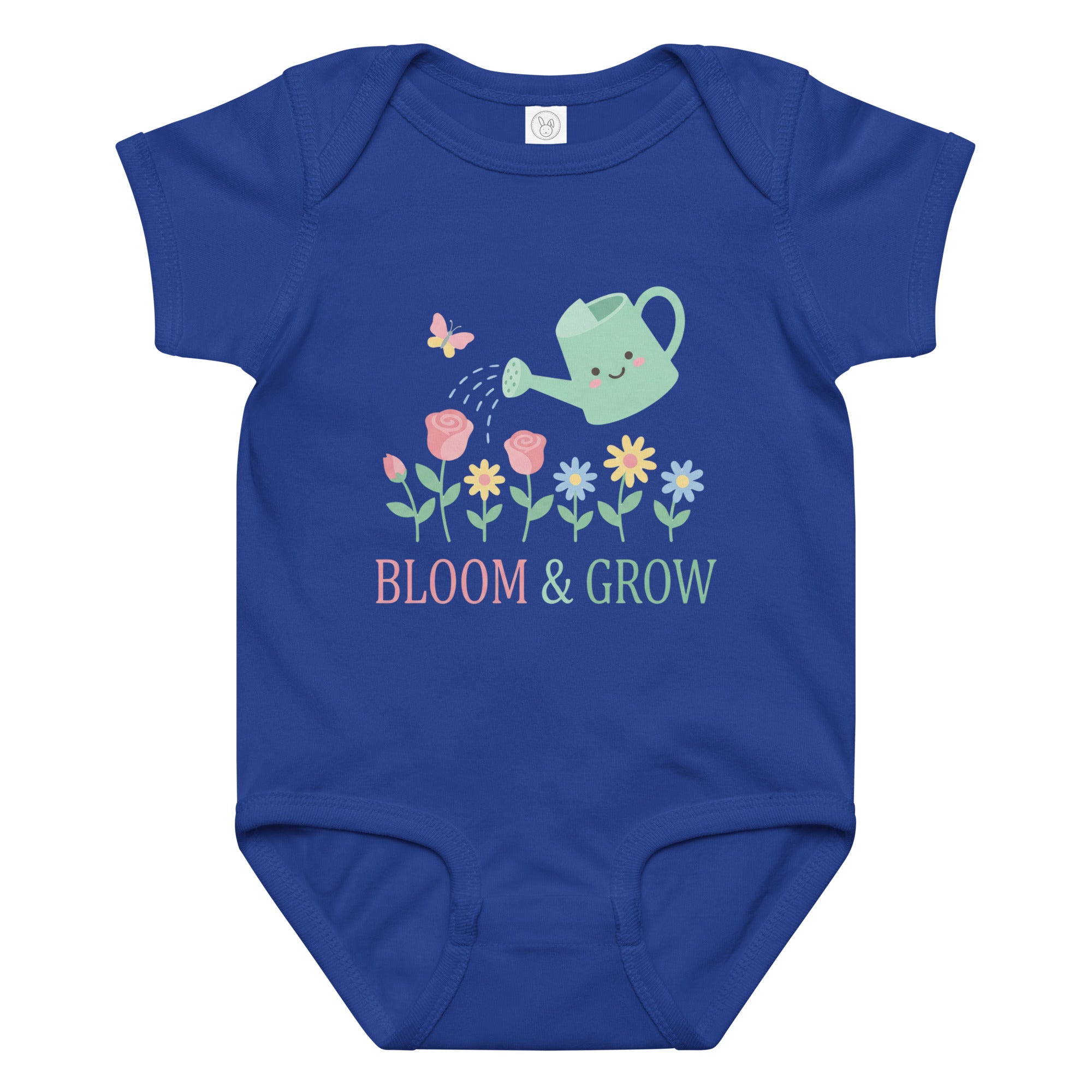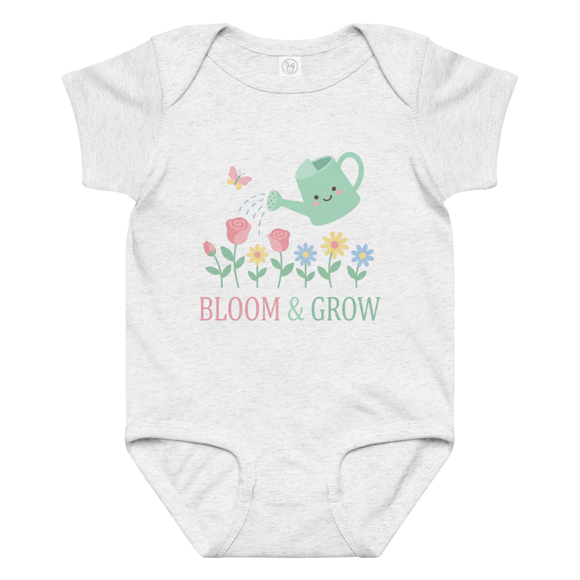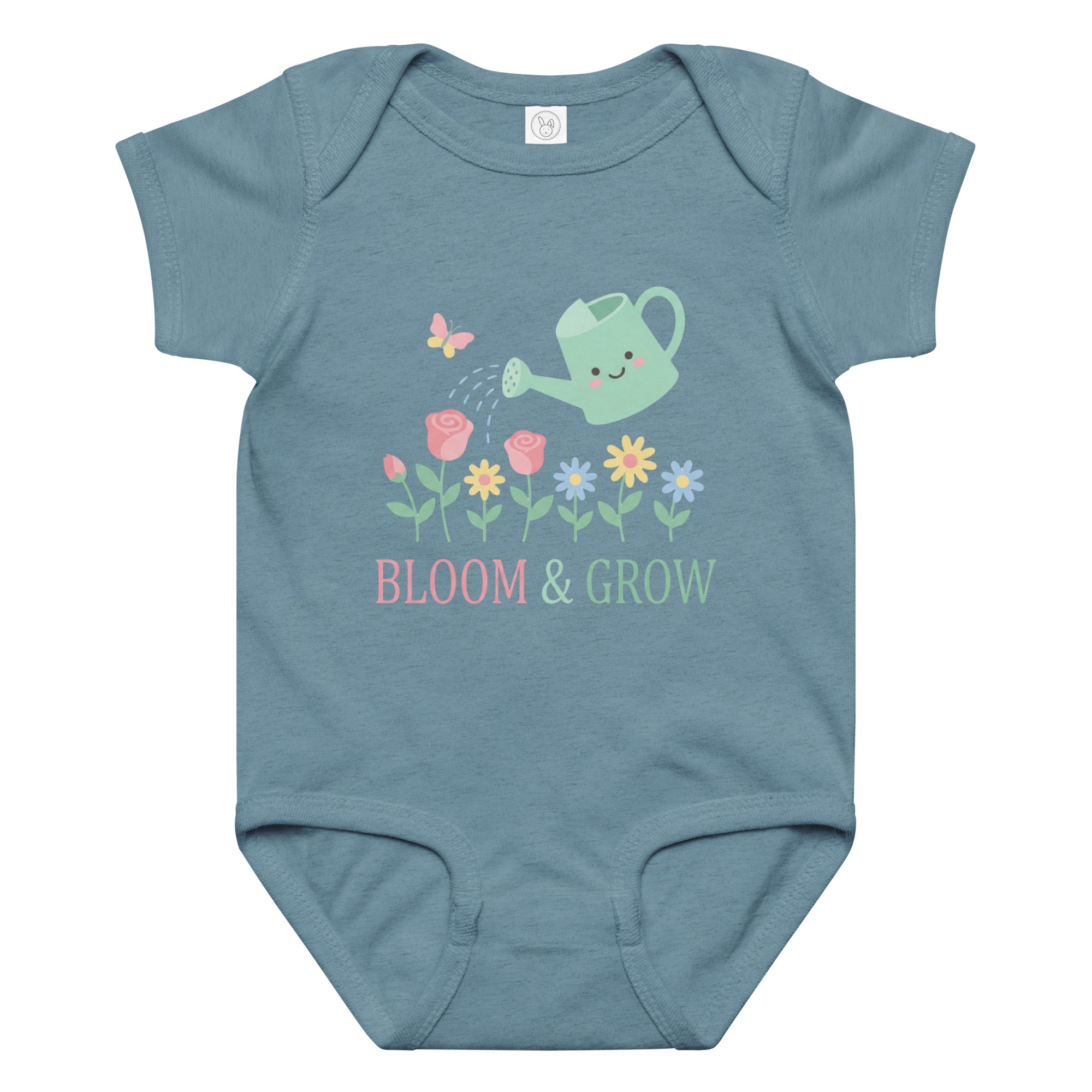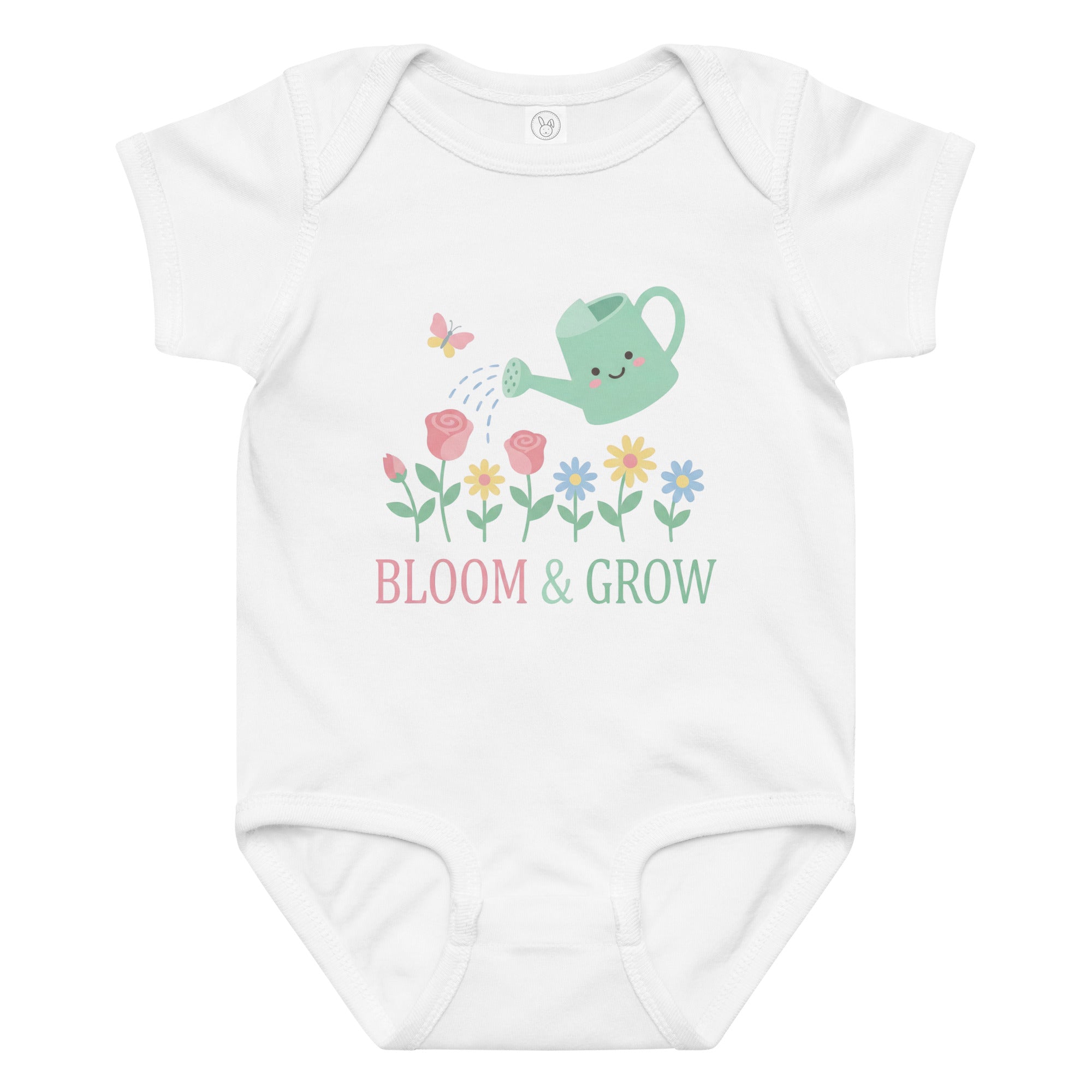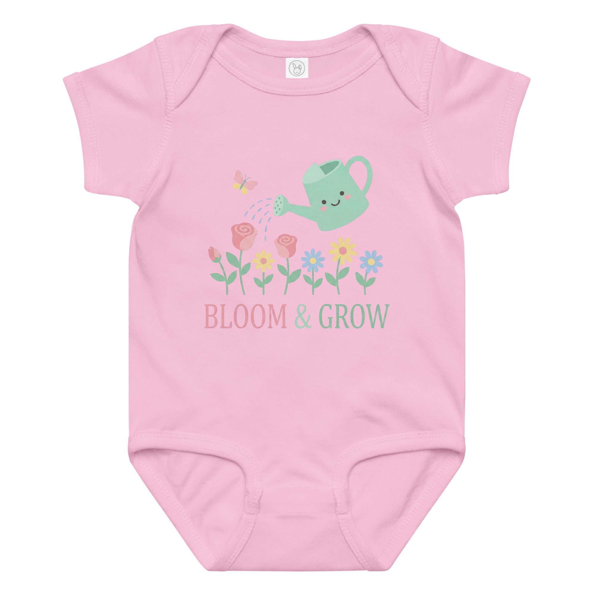 This adorable baby bodysuit features a charming illustration of a happy mint green watering can sprinkling water over a delightful garden of pastel pink roses, sunny yellow daisies, and calming blue flowers, accompanied by a small pink butterfly. The sweet design is accented with the encouraging phrase 'BLOOM & GROW' in complementary soft pink and green typography. Designed for little ones, this bodysuit offers a gentle feel for all-day comfort, making it an ideal choice for everyday wear, ensuring your baby stays cozy and cute in this soft Baby Jersey Bodysuit.