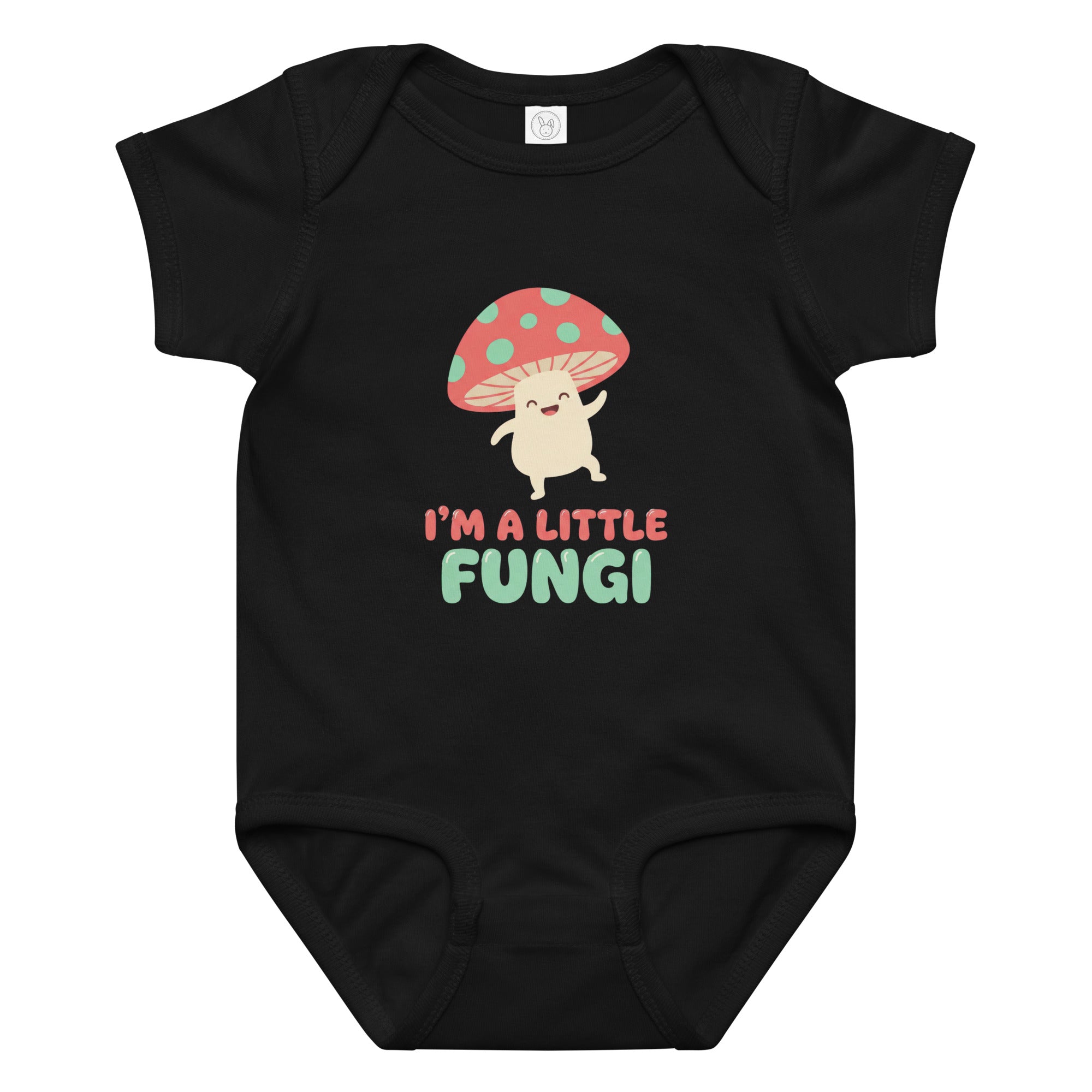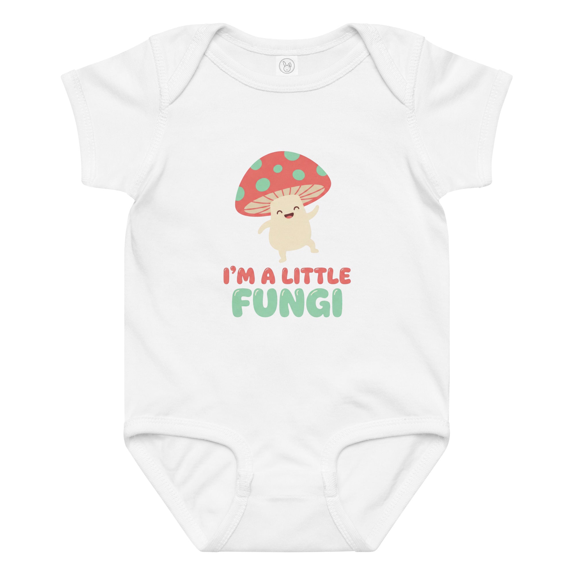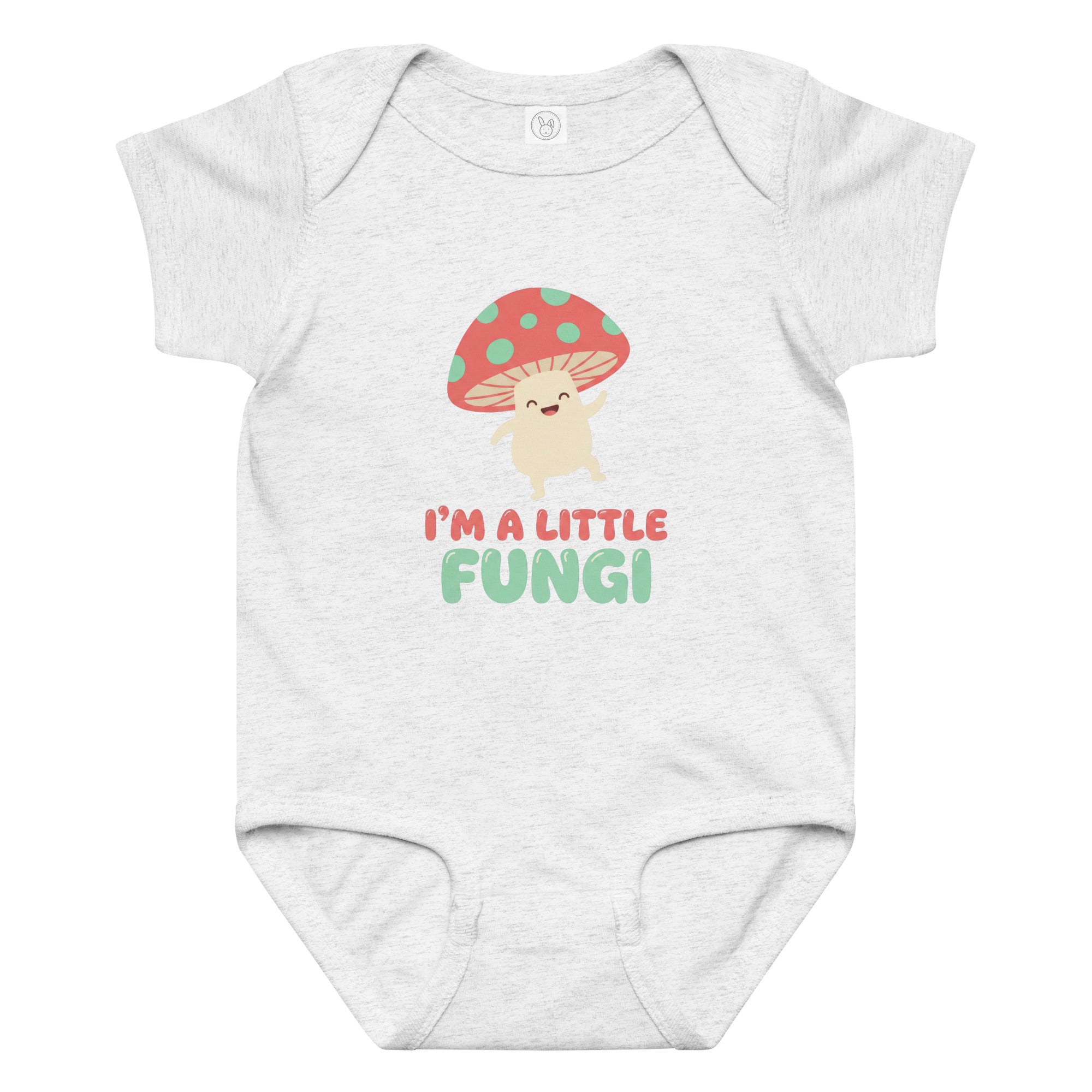 This adorable baby bodysuit features a charming illustration of a smiling mushroom with a red and green spotted cap, joyfully waving its hand. Below the cheerful fungi, the playful phrase 'I'M A LITTLE FUNGI' is printed in contrasting red and green text. This sweet design is perfect for bringing a smile to everyone's face, offering a cute and clever play on words. Made for your little one's comfort and everyday adventures, this baby jersey bodysuit is a perfect addition to their wardrobe.