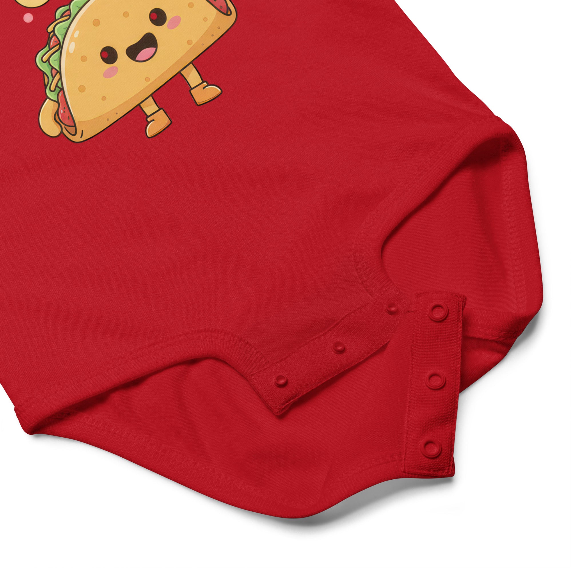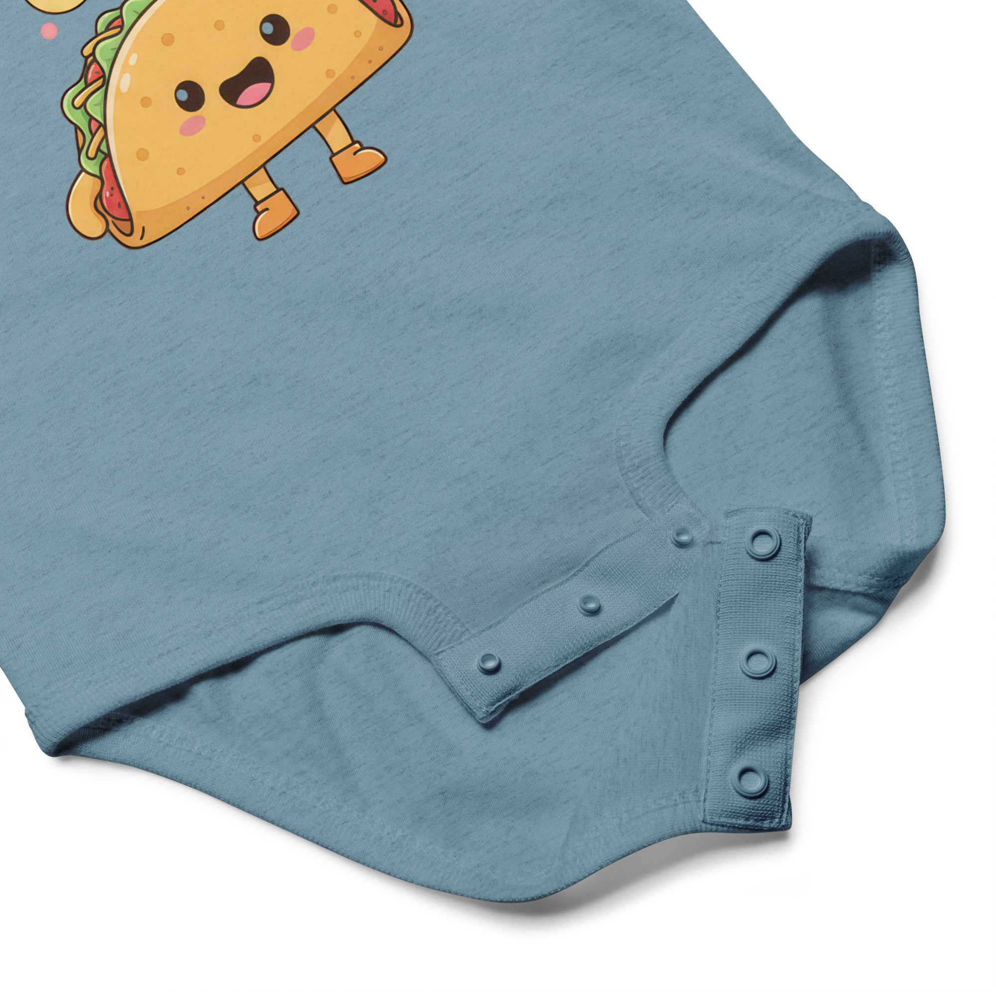 This adorable baby bodysuit features a cheerful cartoon taco illustration with a friendly smile, waving its hand. Above the taco, the playful phrase 'TACO 'BOUT CUTE' is printed in vibrant, multi-colored bubbly letters, accented with little stars and dots. It’s perfect for little ones who are as cute as a taco! This comfortable bodysuit is ideal for everyday wear, offering a soft feel against delicate skin.