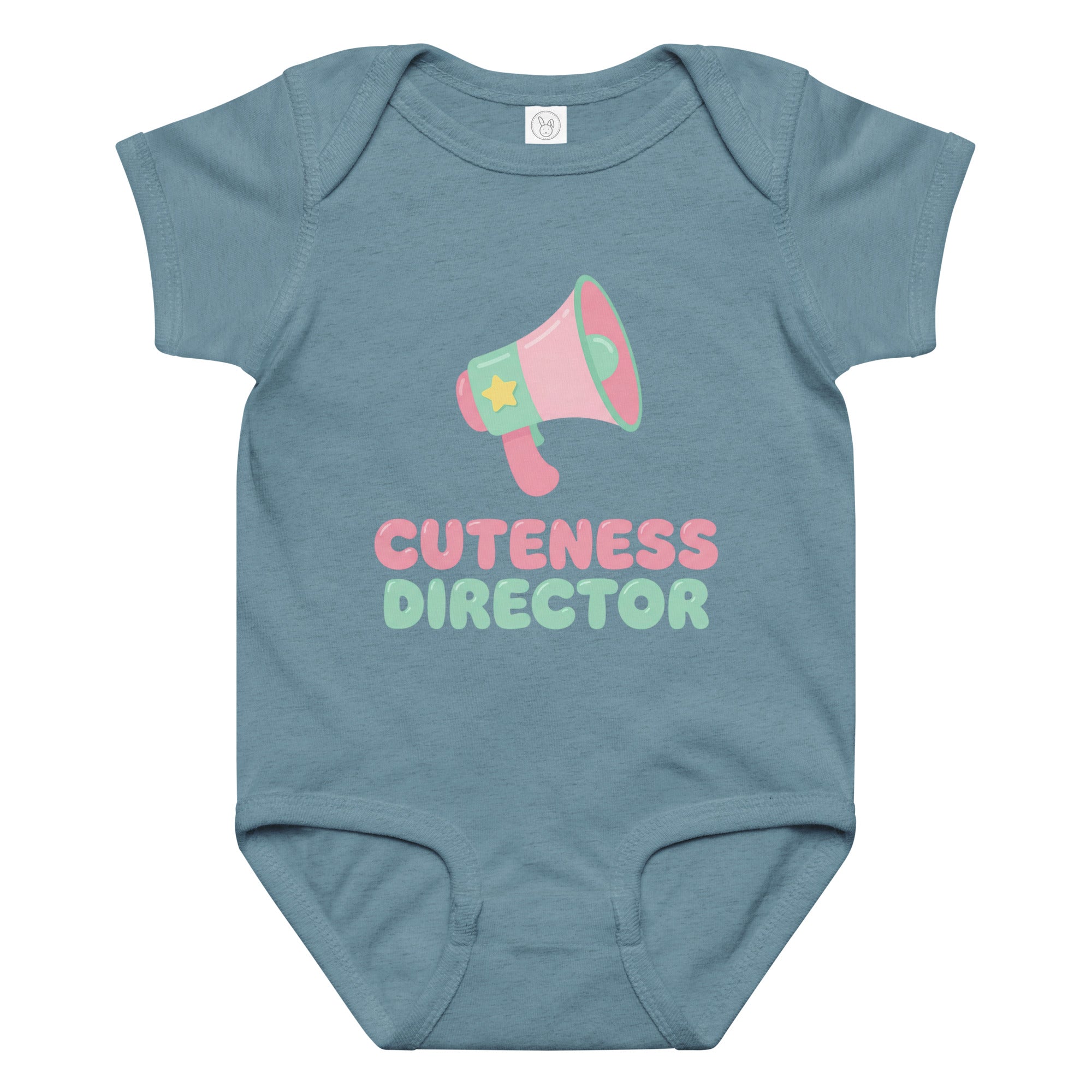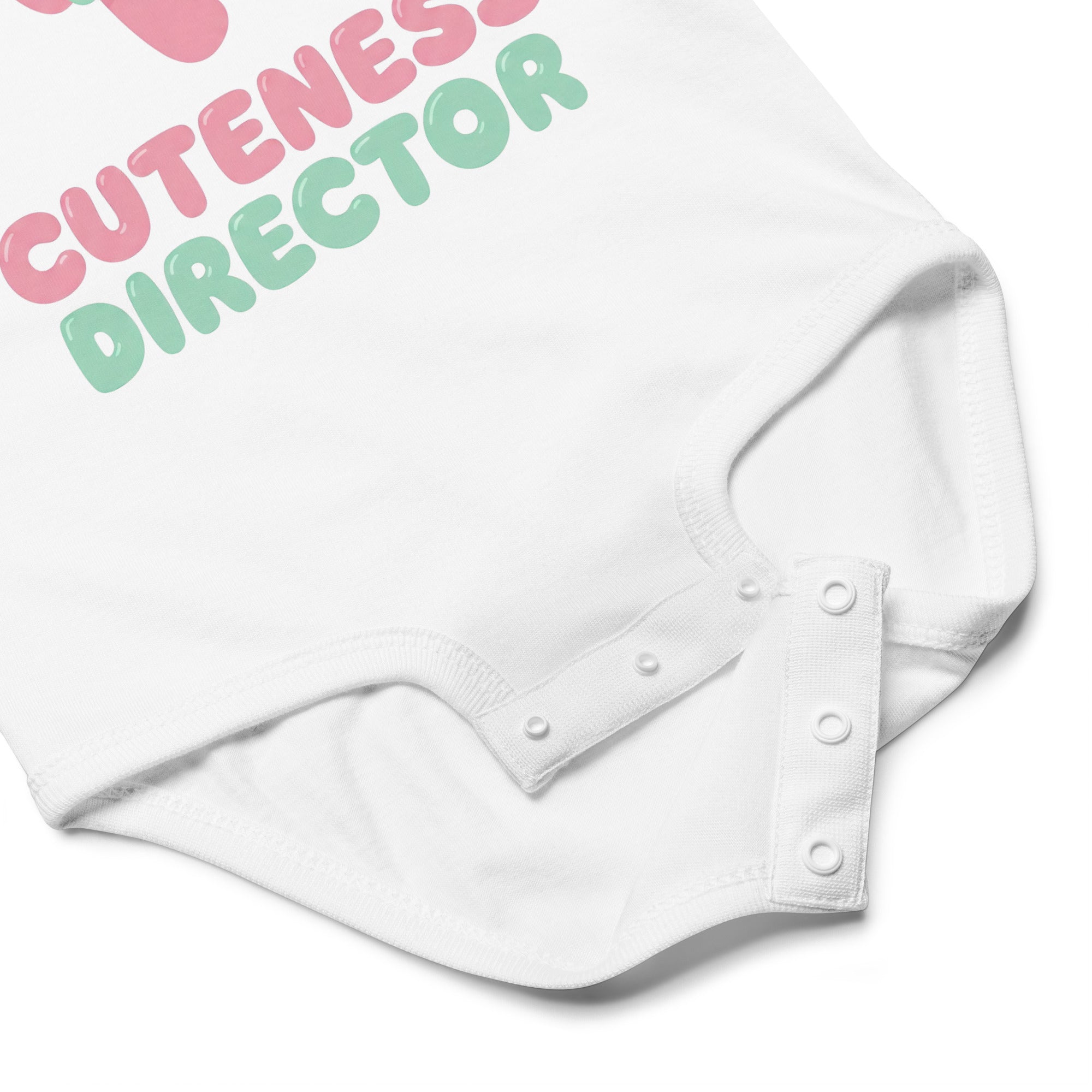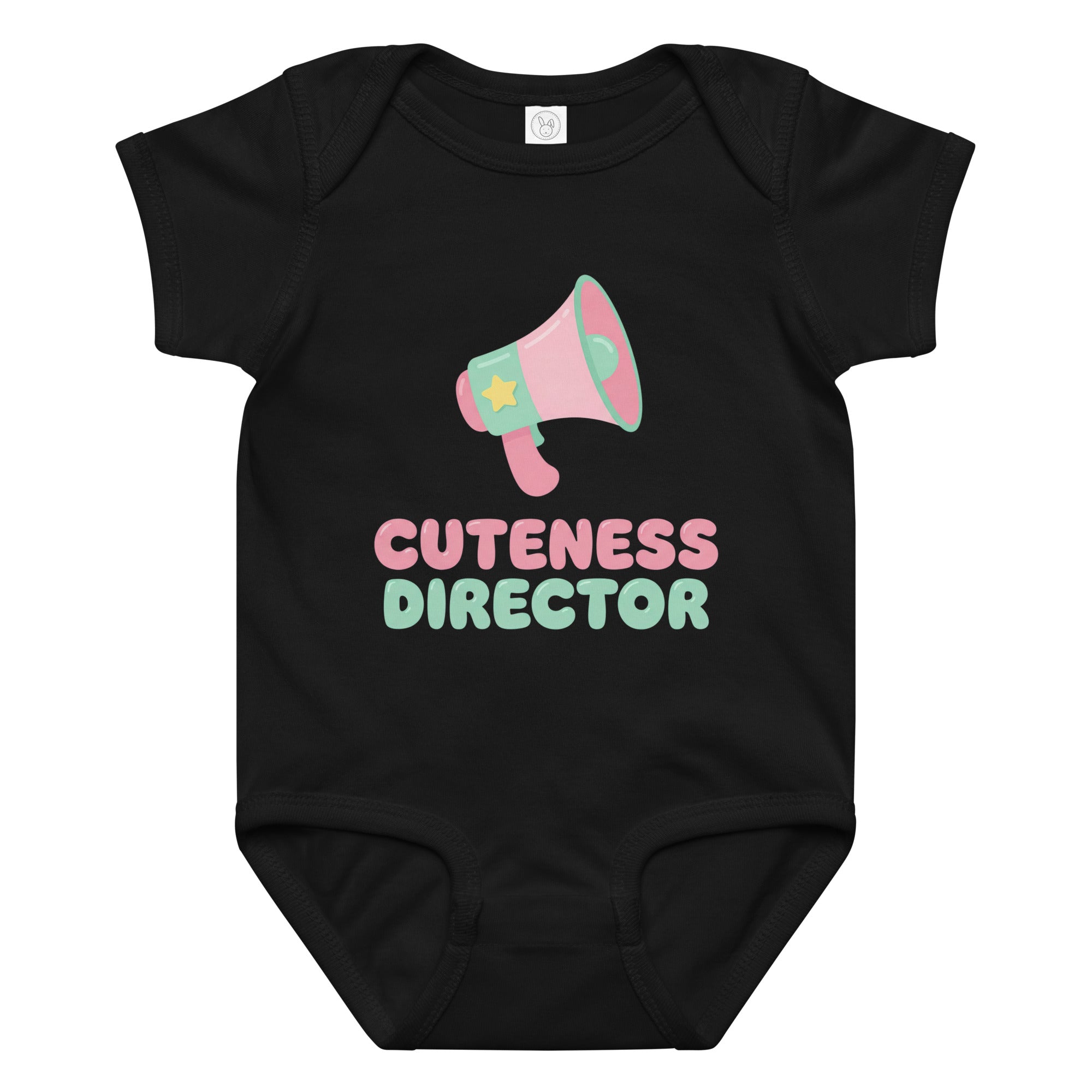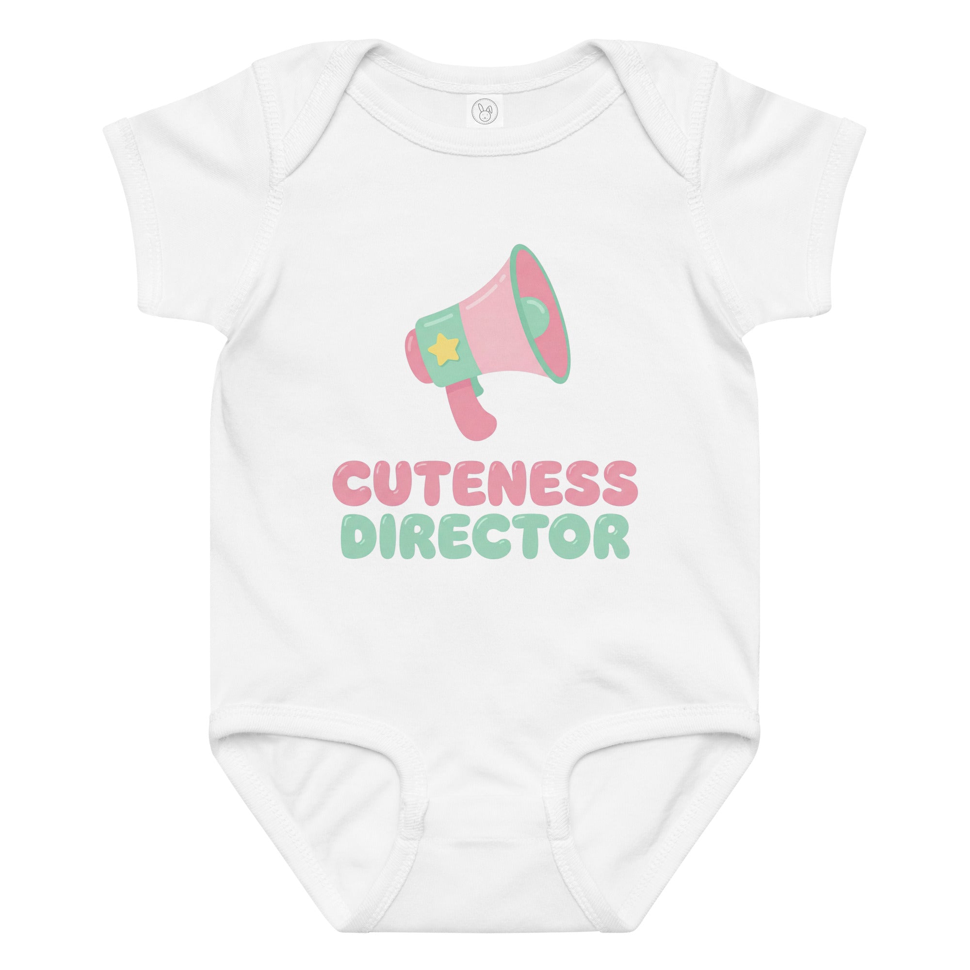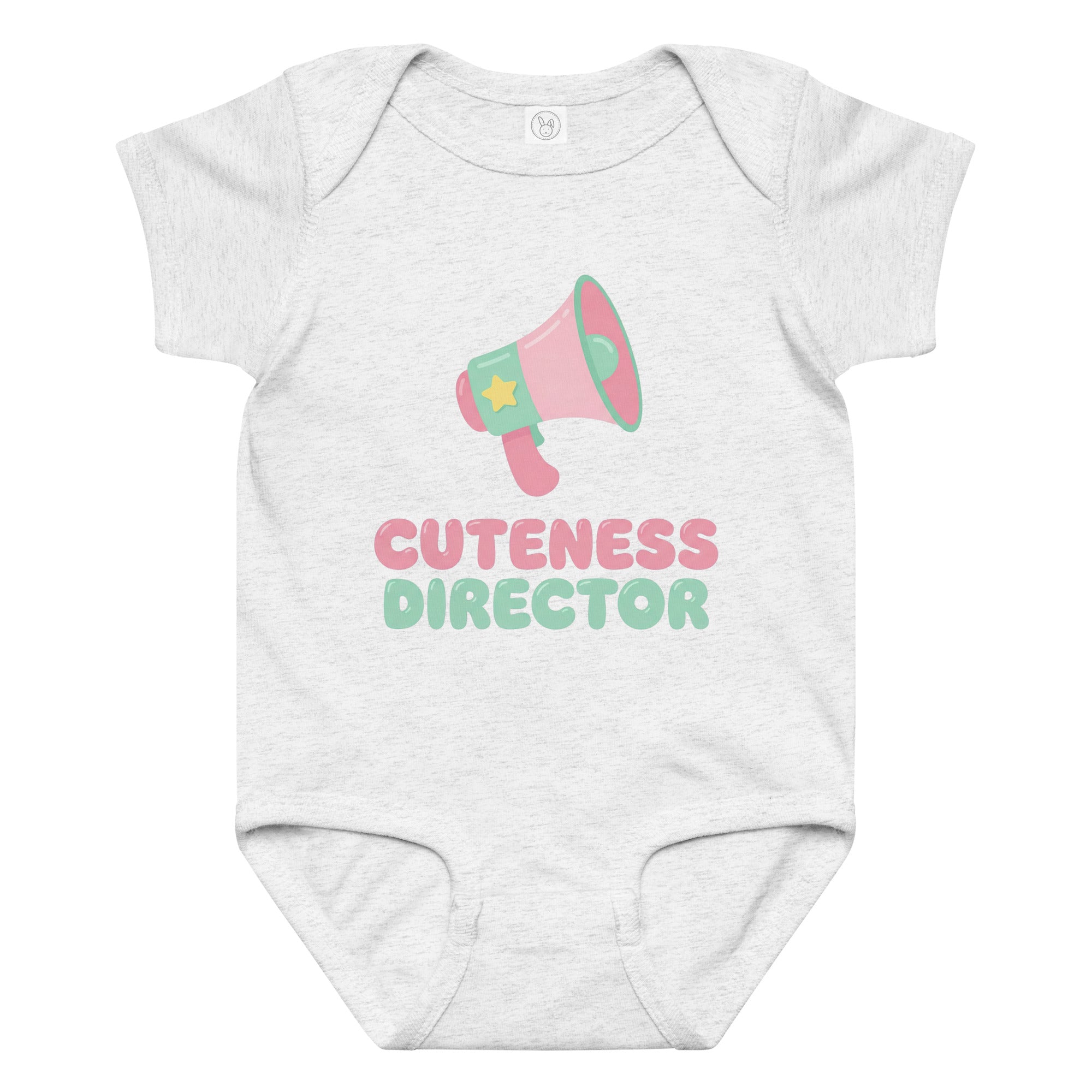 This adorable baby jersey bodysuit features a playful pink and green megaphone graphic, highlighted by a yellow star. Below the megaphone, the empowering phrase 'CUTENESS DIRECTOR' is printed in charming pink and light green fonts, declaring your little one's undeniable charm. Designed for ultimate comfort and everyday wear, this piece is perfect for making a sweet statement. It's a soft, snuggly Baby Jersey Bodysuit that keeps your little one comfy all day.