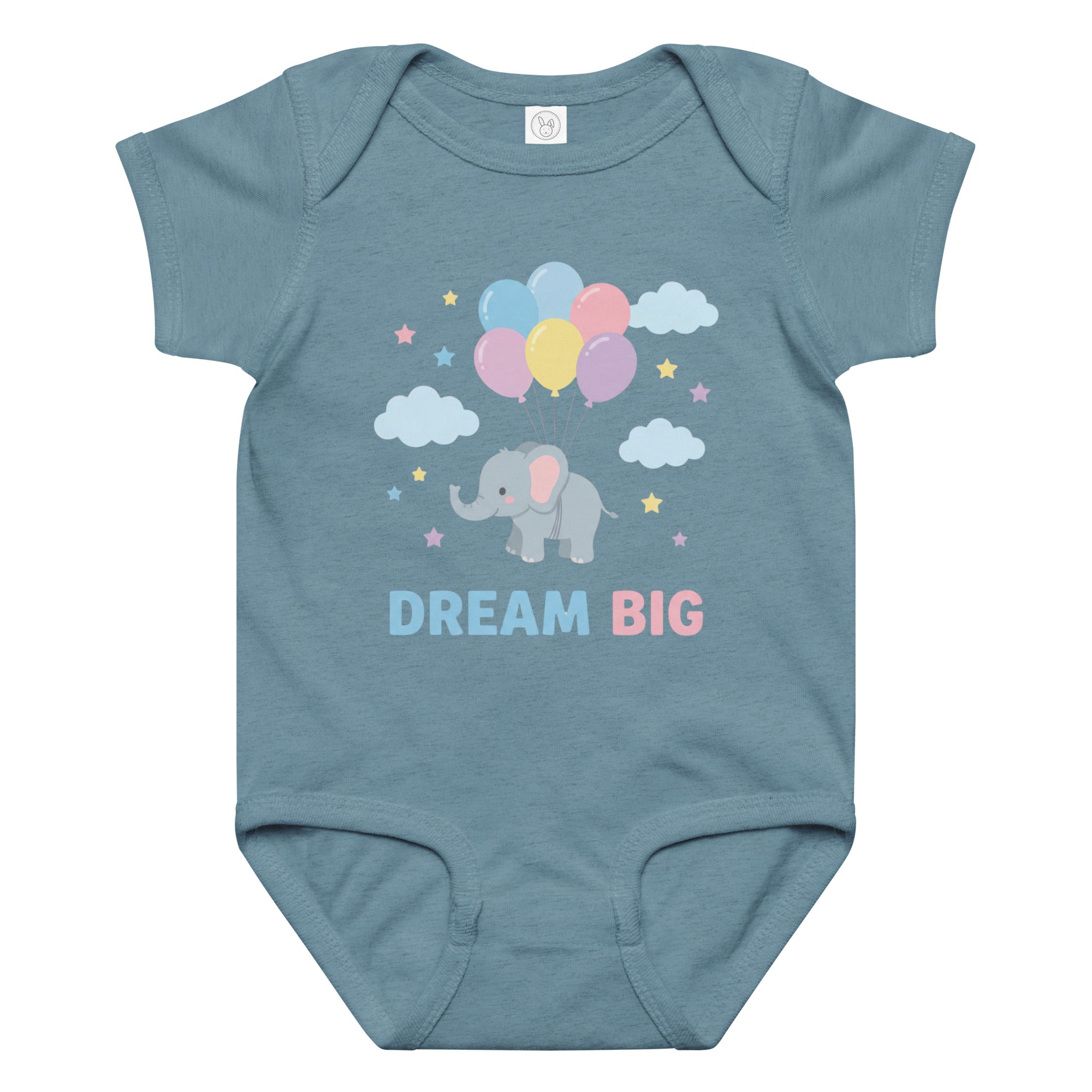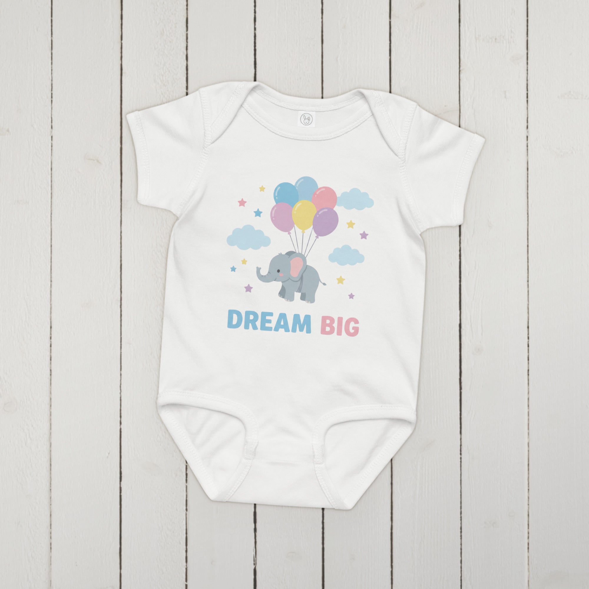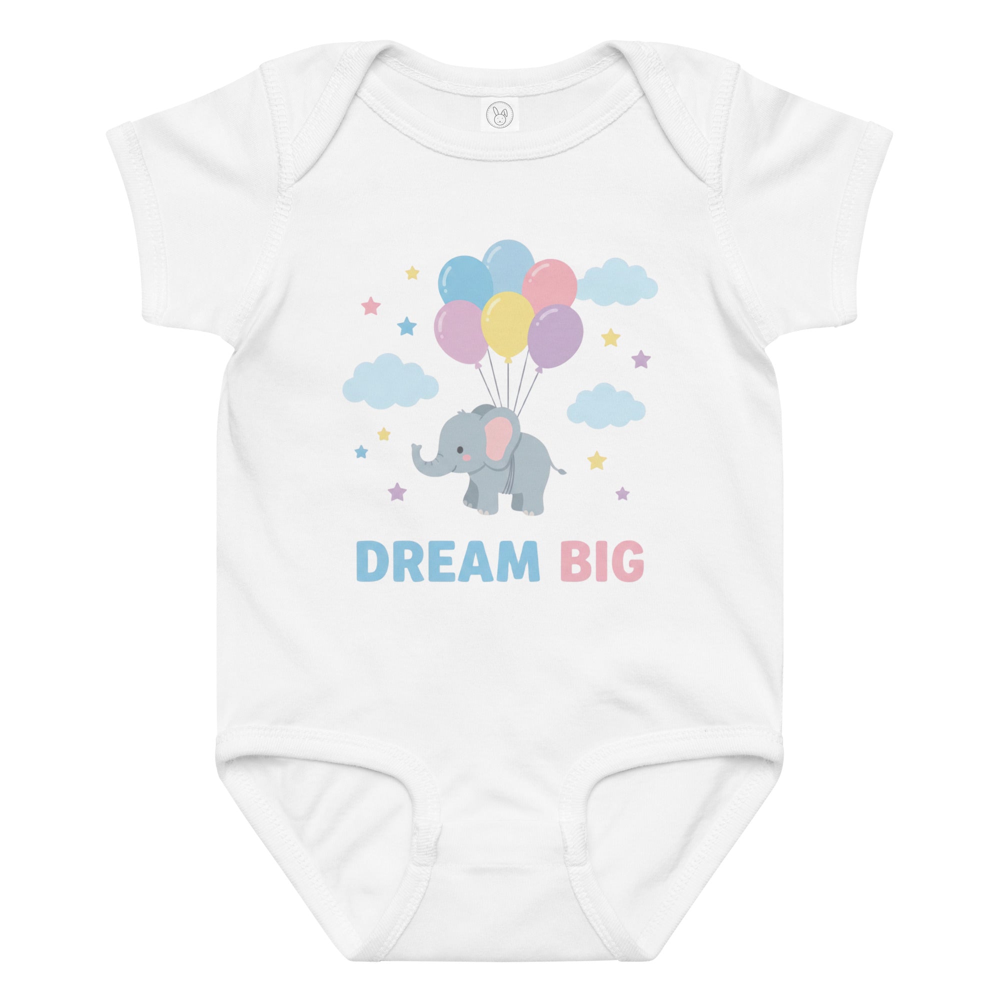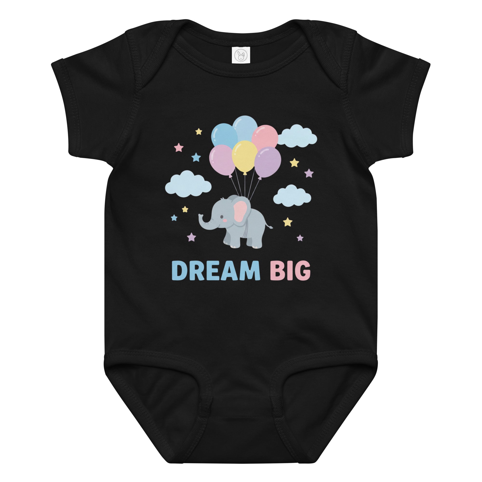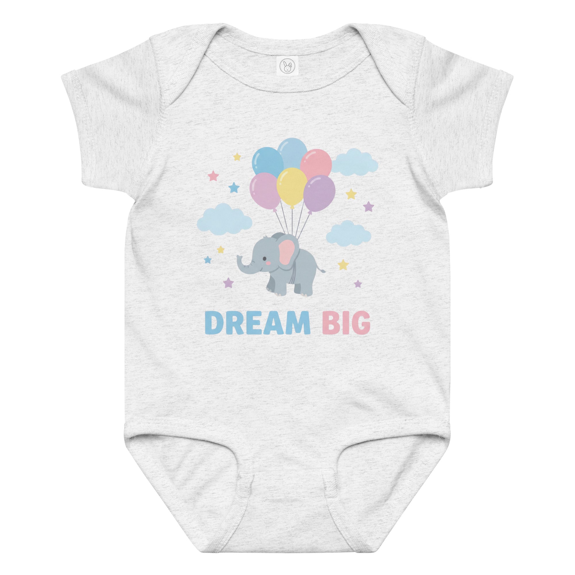 Float into sweet dreams with this adorable baby bodysuit featuring a charming grey elephant gently carried aloft by a cluster of pastel pink, blue, yellow, and purple balloons. Scattered around are soft blue clouds and twinkling pastel stars, with the inspiring message 'DREAM BIG' printed below in playful light blue and pink typography. Perfect for everyday wear or as a thoughtful gift, this bodysuit combines a heartwarming design with soft fabric for your little one. Designed for ultimate comfort, this Baby Jersey Bodysuit ensures your baby stays cozy all day.