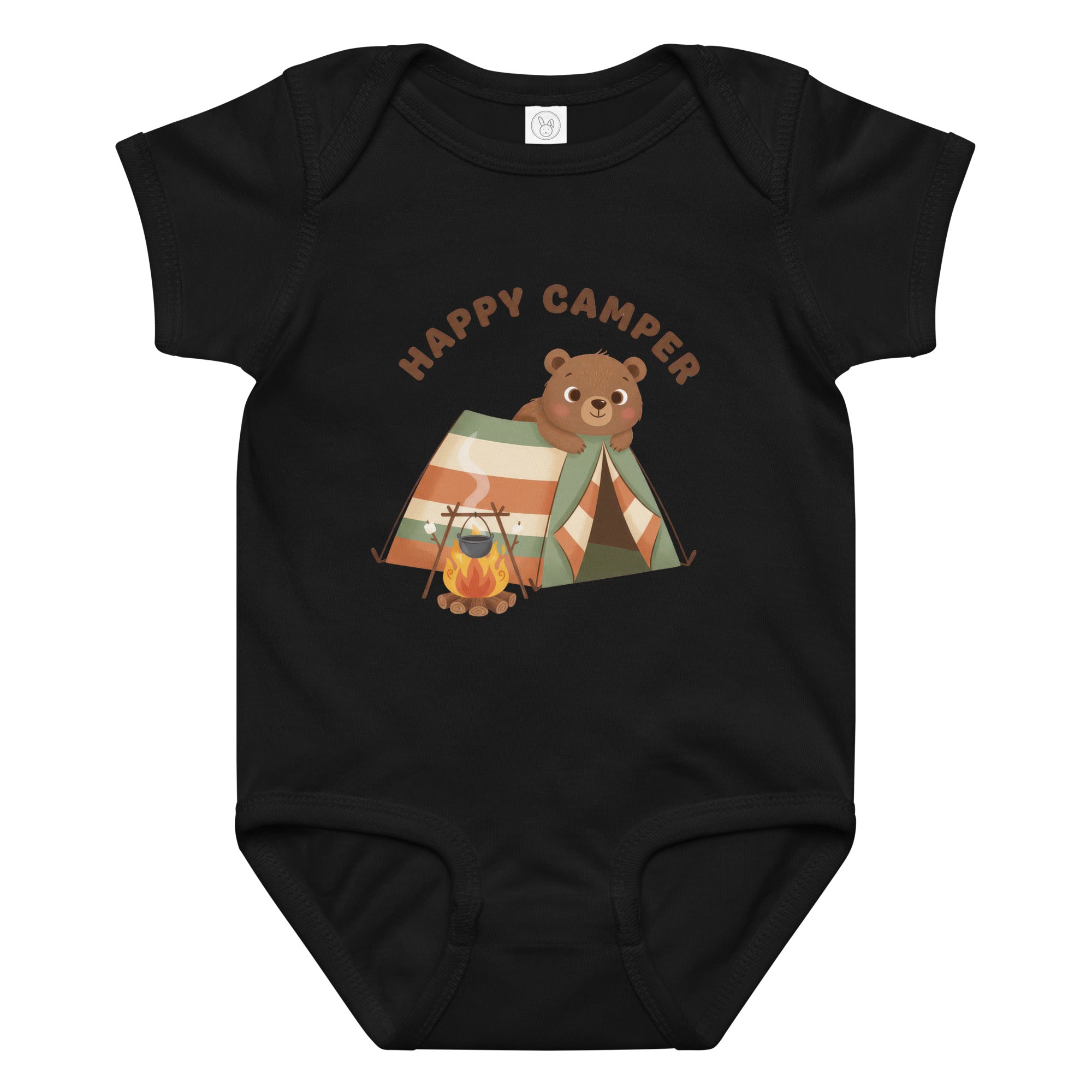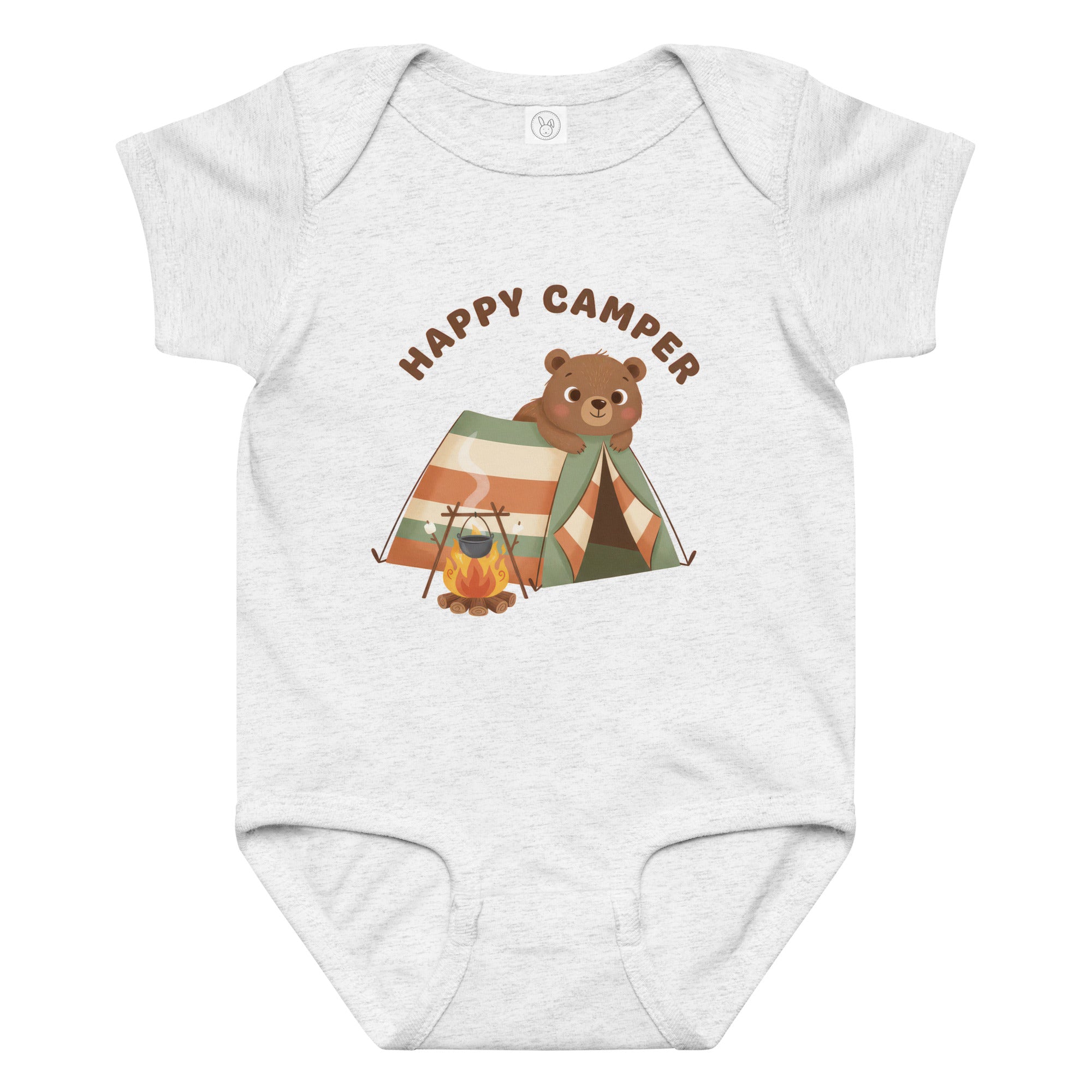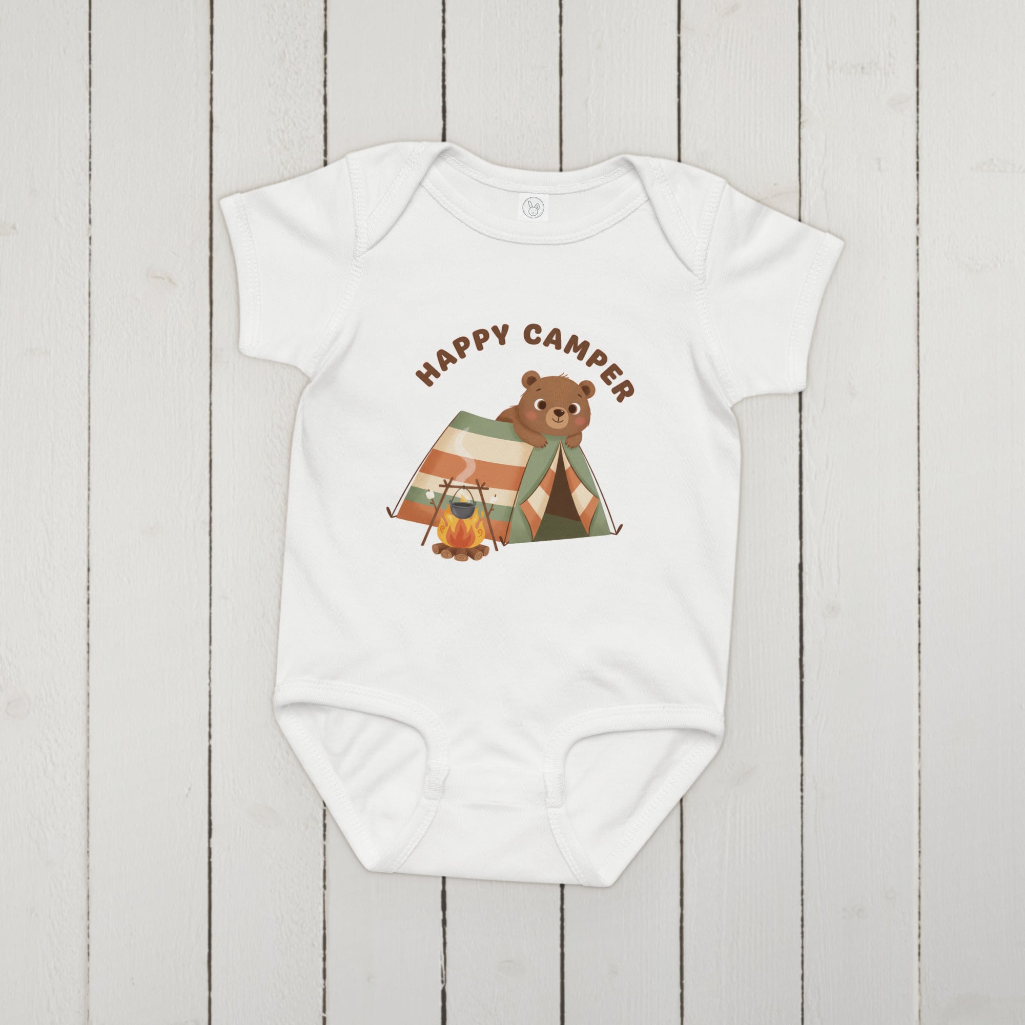 This adorable baby bodysuit features a charming illustration of a happy brown bear peeking out from a striped camping tent, accompanied by a cozy campfire with a pot. The heartwarming phrase 'HAPPY CAMPER' is printed above in a playful brown font, capturing a spirit of outdoor adventure. It's designed for little ones who love exploring, offering a whimsical and cozy feel, perfect for everyday wear, playtime, or themed outings. Ensure your little one stays comfortable all day in this delightful Baby Jersey Bodysuit.