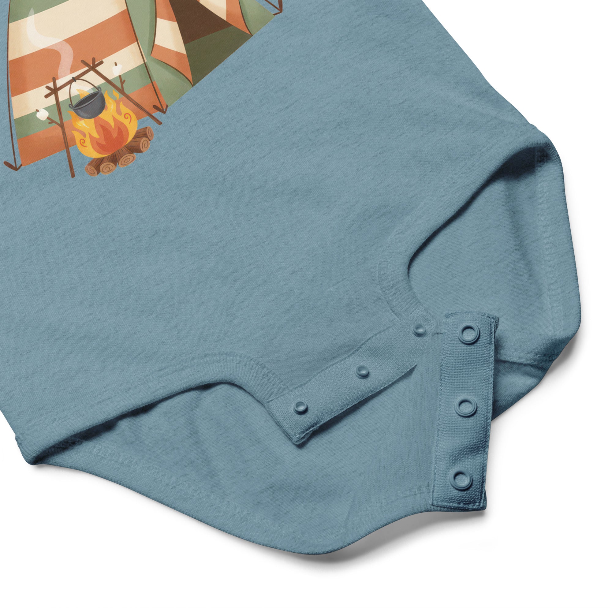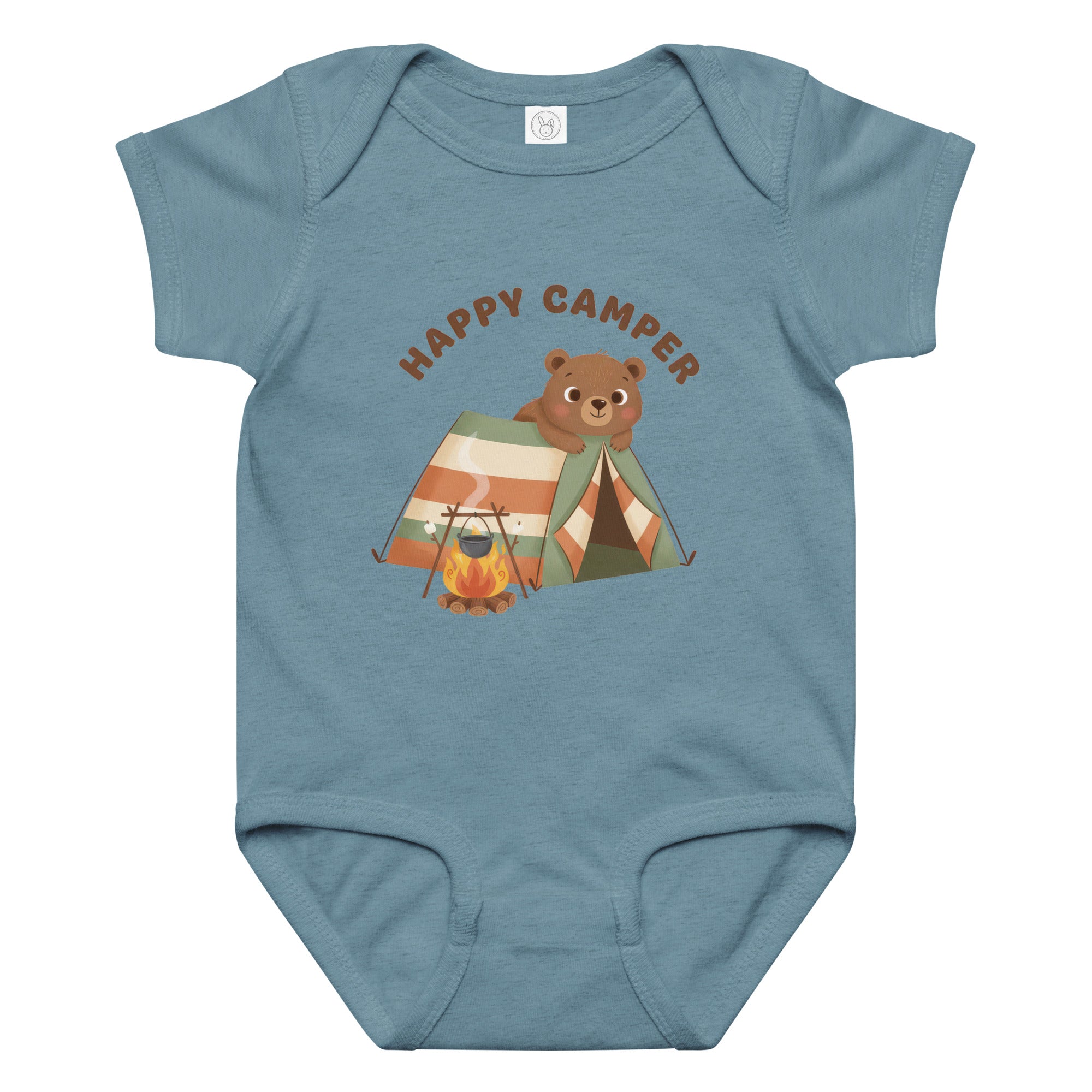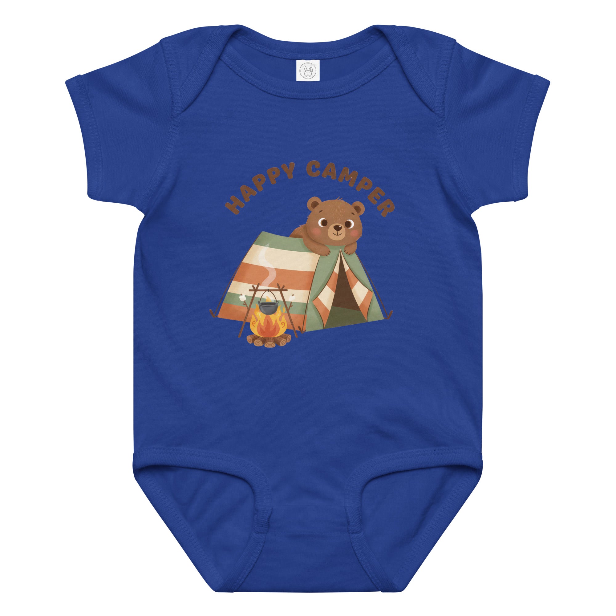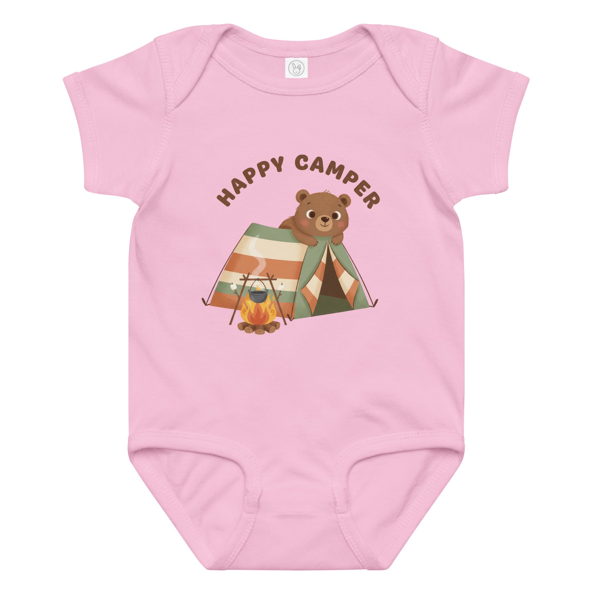 This adorable baby bodysuit features a charming illustration of a happy brown bear peeking out from a striped camping tent, accompanied by a cozy campfire with a pot. The heartwarming phrase 'HAPPY CAMPER' is printed above in a playful brown font, capturing a spirit of outdoor adventure. It's designed for little ones who love exploring, offering a whimsical and cozy feel, perfect for everyday wear, playtime, or themed outings. Ensure your little one stays comfortable all day in this delightful Baby Jersey Bodysuit.