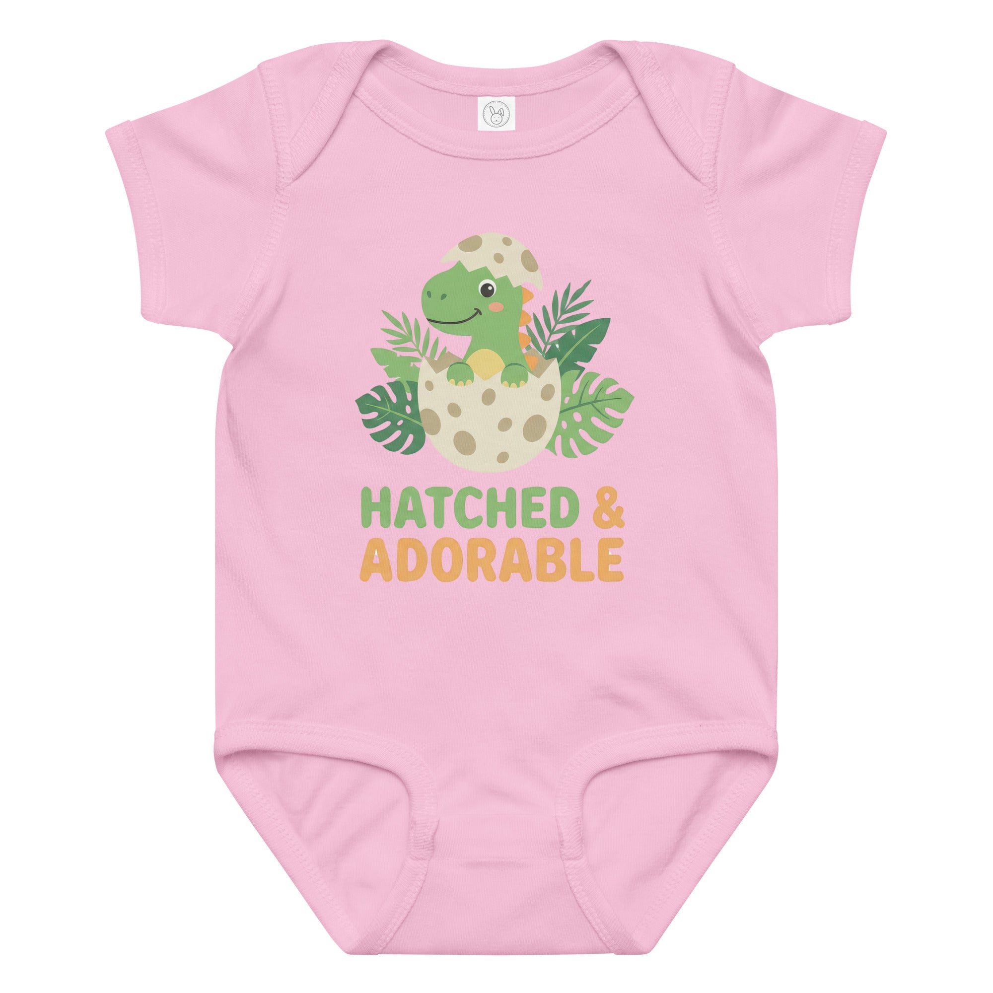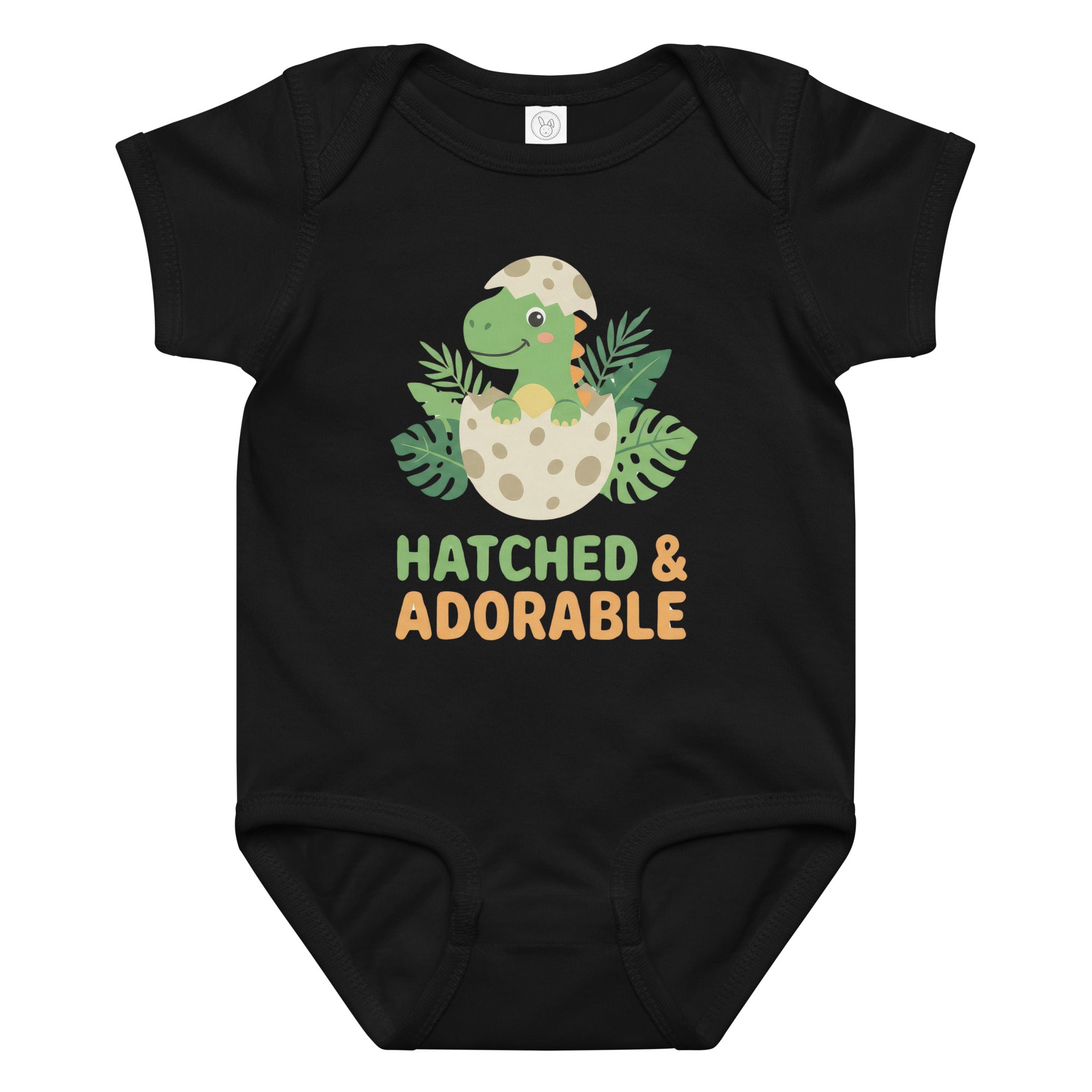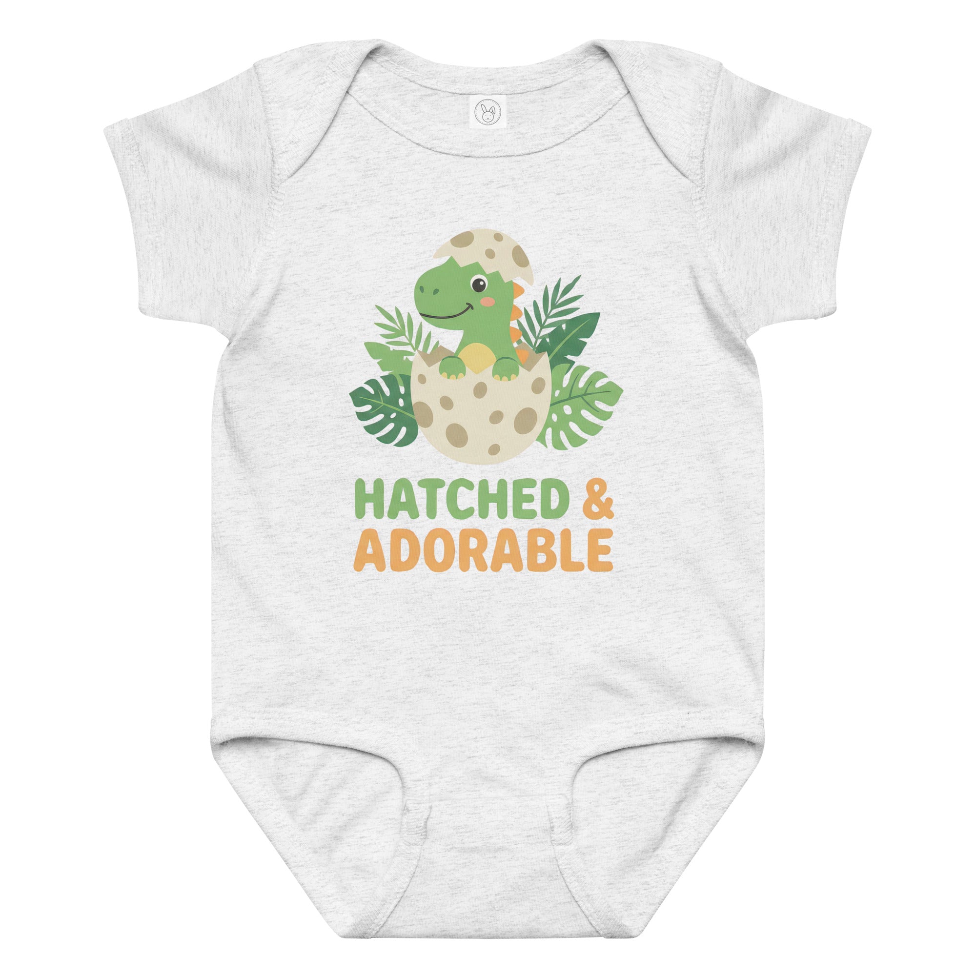 This charming baby jersey bodysuit features an adorable graphic of a tiny green dinosaur breaking out of a speckled egg, nestled among lush green tropical leaves. The design is enhanced by the playful phrase 'HATCHED & ADORABLE' in cheerful green and orange typography, perfectly capturing the sweet nature of your little one. It's an ideal choice for everyday wear or as a thoughtful gift, designed to keep your baby comfortable and stylish in this cozy Baby Jersey Bodysuit.