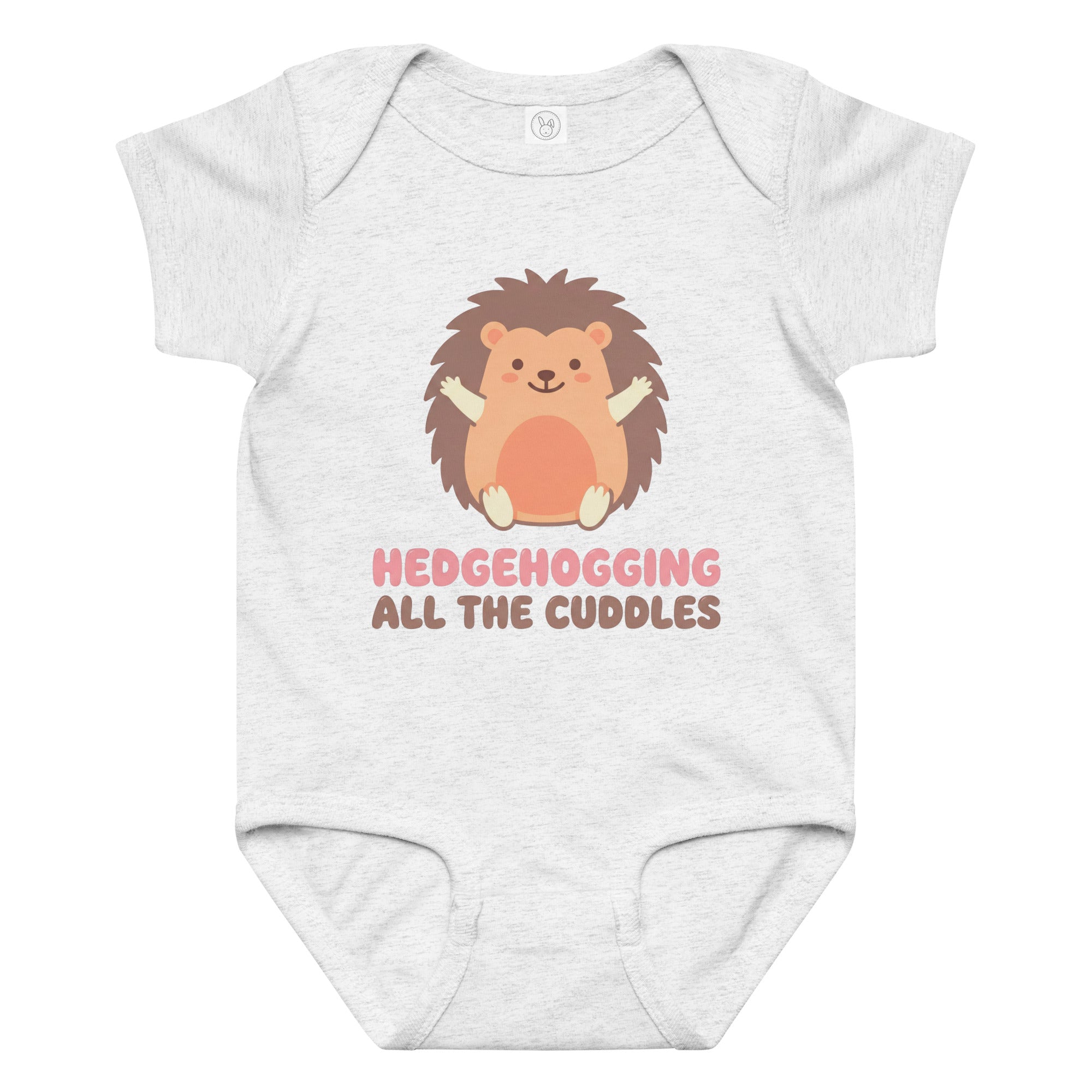 This adorable baby jersey bodysuit features a sweet, cartoon hedgehog illustration with light brown fur, dark brown quills, and pink cheeks, seemingly ready for a hug. Below the charming graphic, the playful text 'HEDGEHOGGING' in light pinkish-orange and 'ALL THE CUDDLES' in a darker warm tone emphasizes the cozy, affectionate theme. Designed for ultimate comfort and ease of wear, this adorable piece is a perfect addition to any infant's wardrobe, providing a soft embrace in this Baby Jersey Bodysuit.