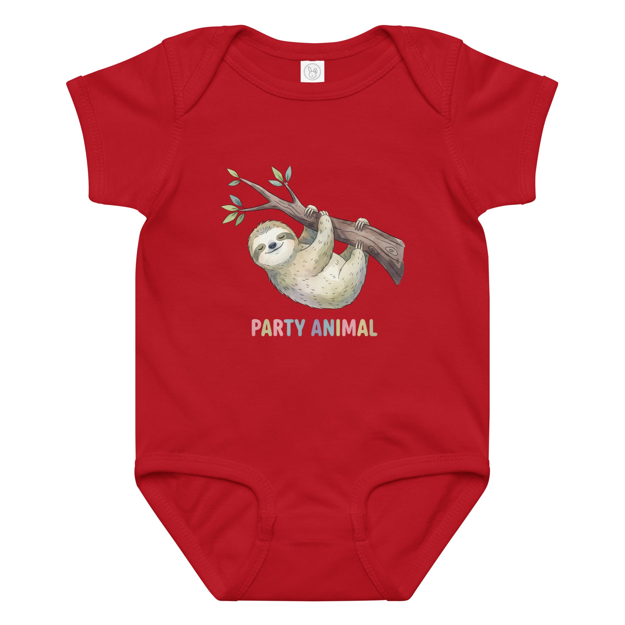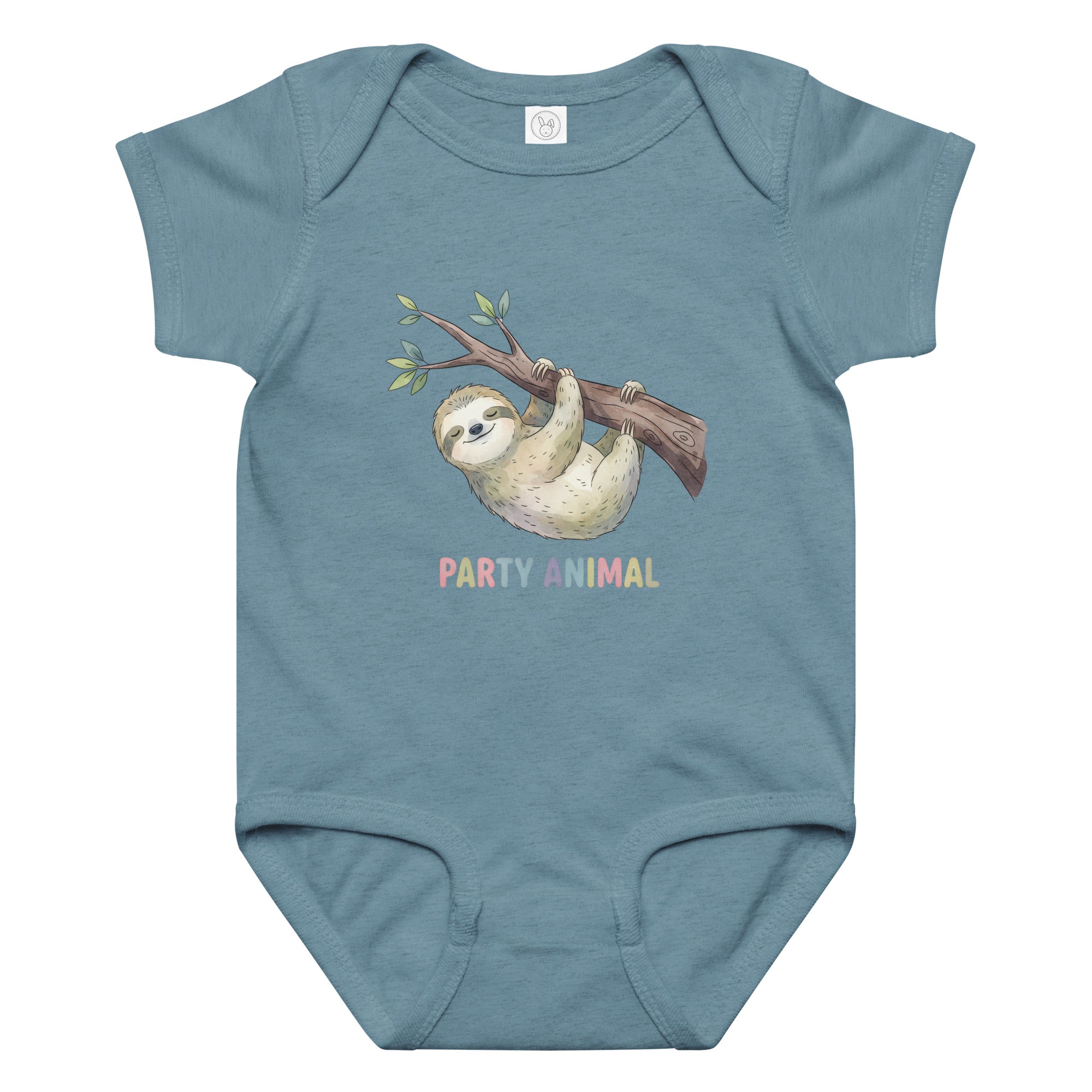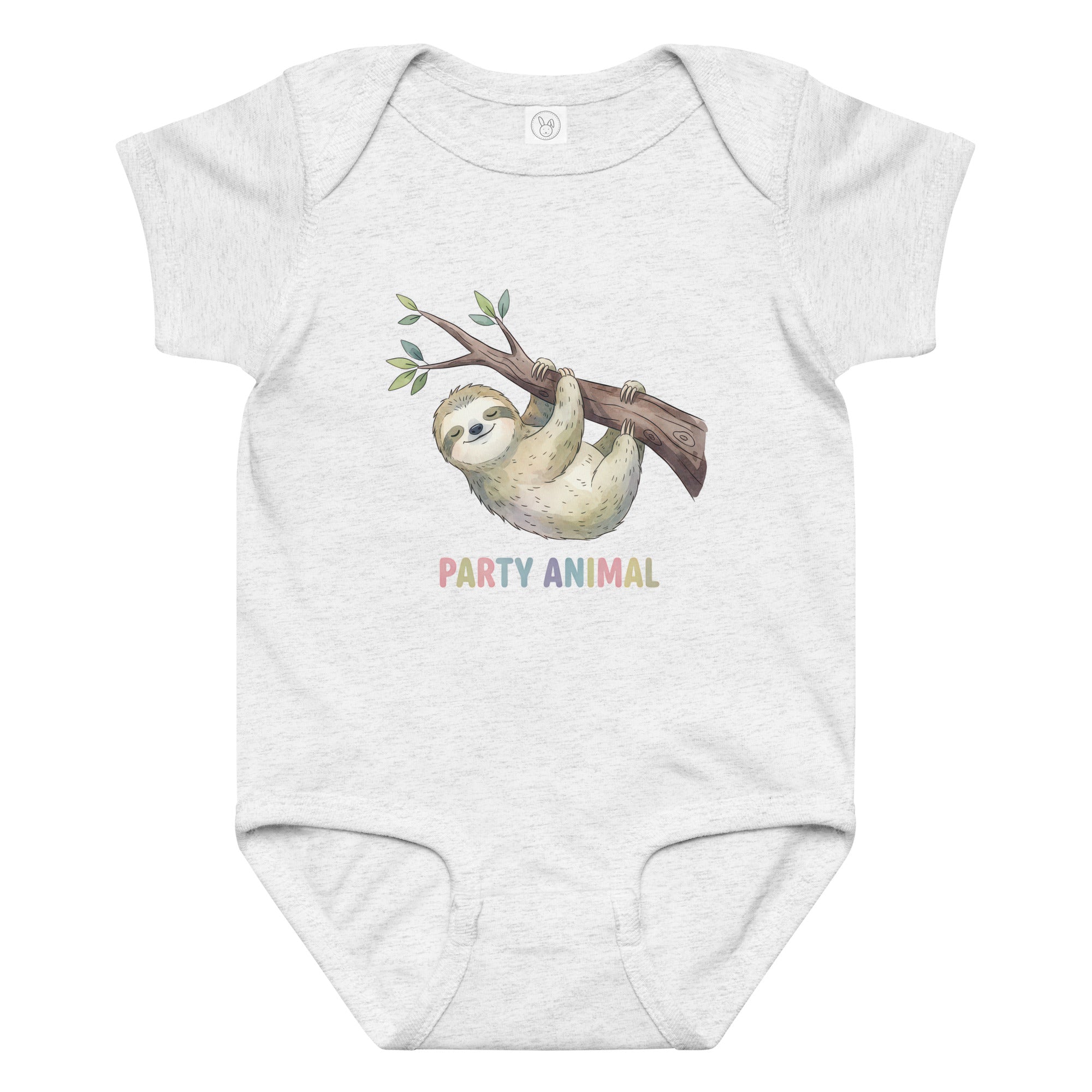 Embrace playful vibes with this adorable baby bodysuit featuring a cheerful sloth hanging from a branch, surrounded by green leaves. The phrase 'PARTY ANIMAL' is printed below in vibrant pastel rainbow colors, adding a festive touch. Perfect for little ones, this comfortable and soft Baby Jersey Bodysuit is designed for easy wear and endless smiles.