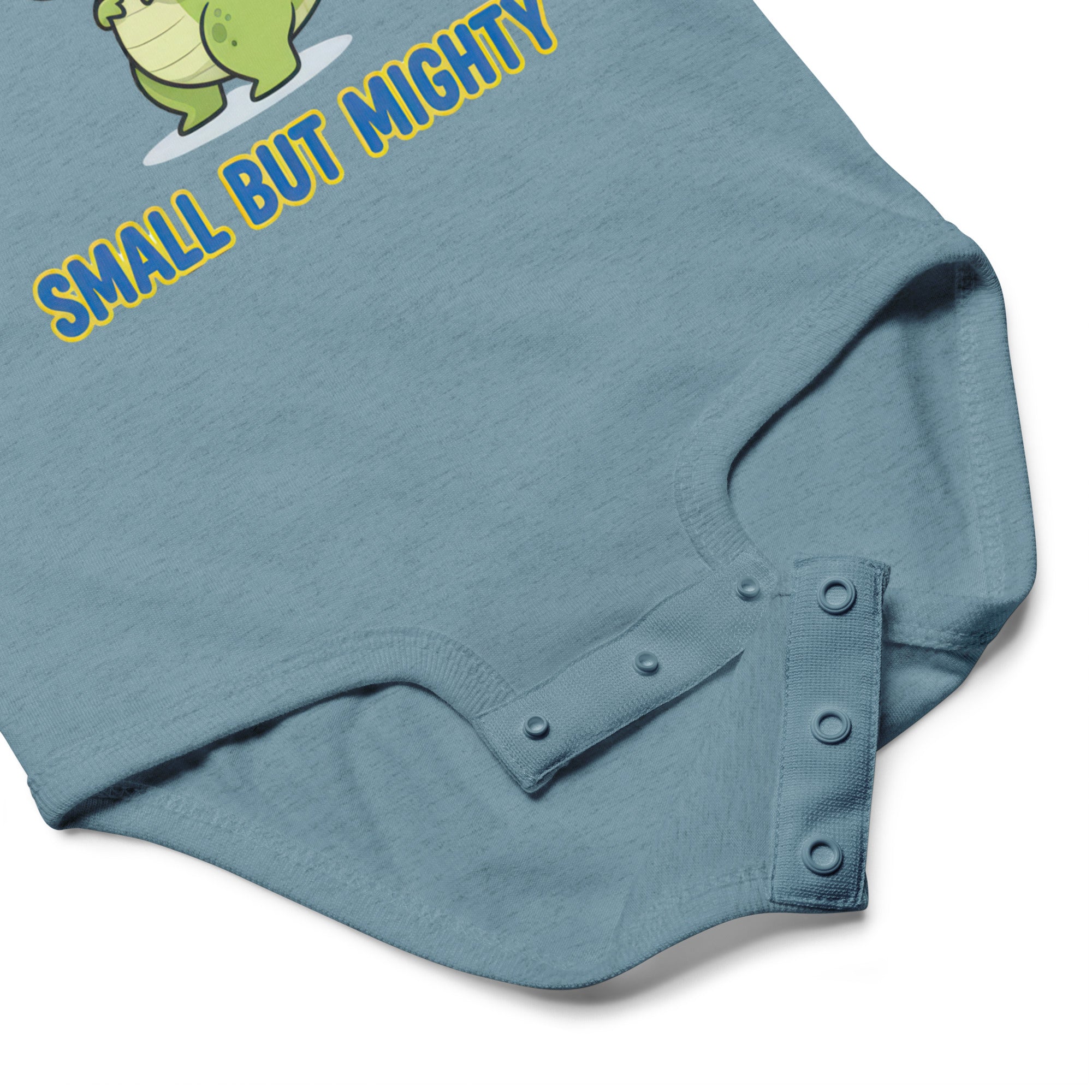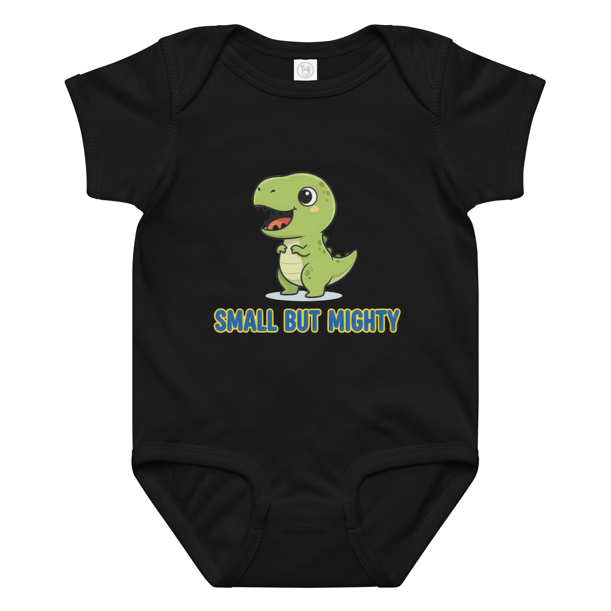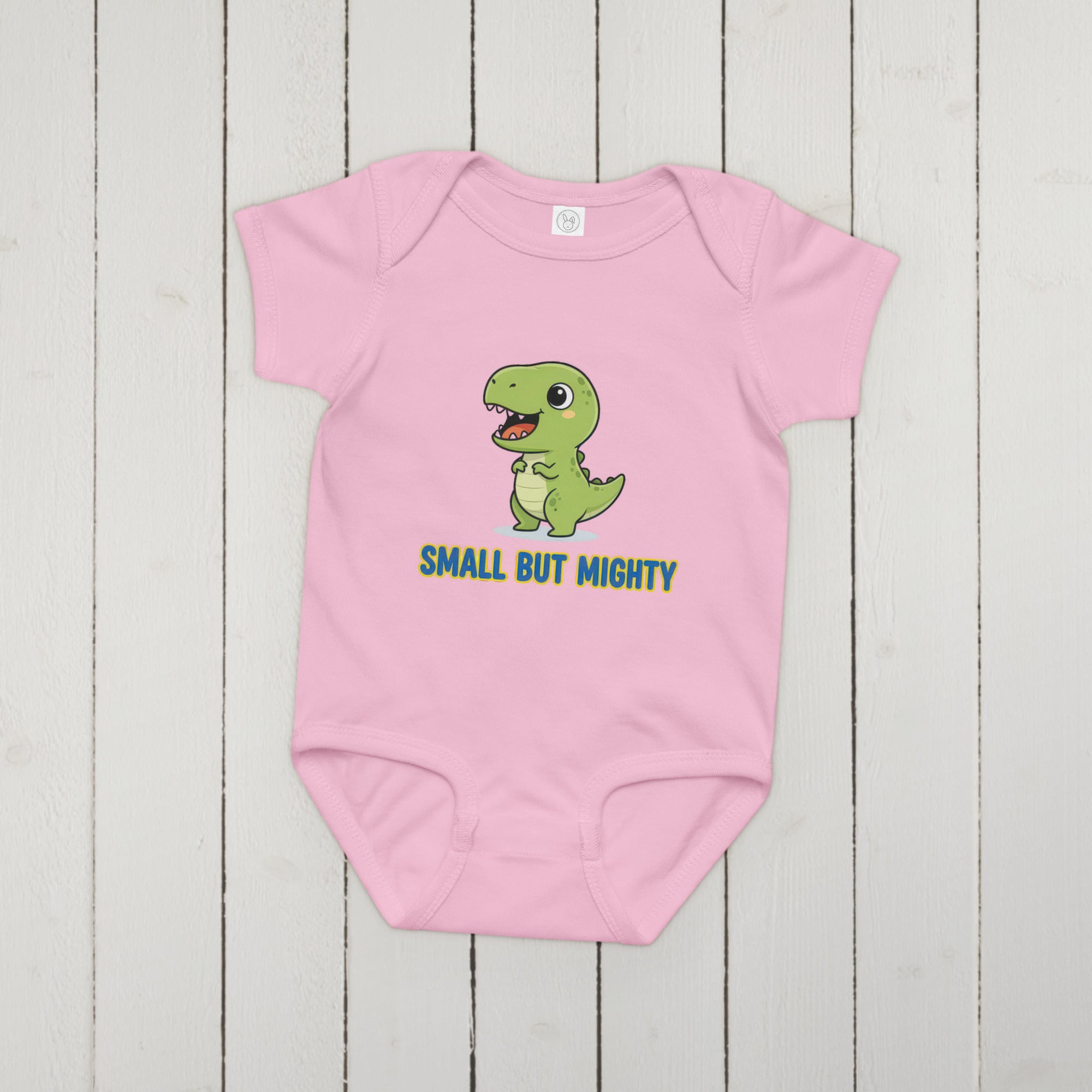 Featuring an adorable green dinosaur illustration, this bodysuit boldly displays the empowering phrase 'SMALL BUT MIGHTY' in vibrant yellow text with a blue outline. The cheerful design captures a playful spirit, making it perfect for your little one's big personality. Crafted for everyday adventures, this bodysuit offers a soft feel and a comfortable fit that moves with your baby. It's an ideal choice for both playtime and naptime, ensuring ease of wear. Designed for maximum comfort, this Baby Jersey Bodysuit is a versatile addition to any infant's wardrobe.