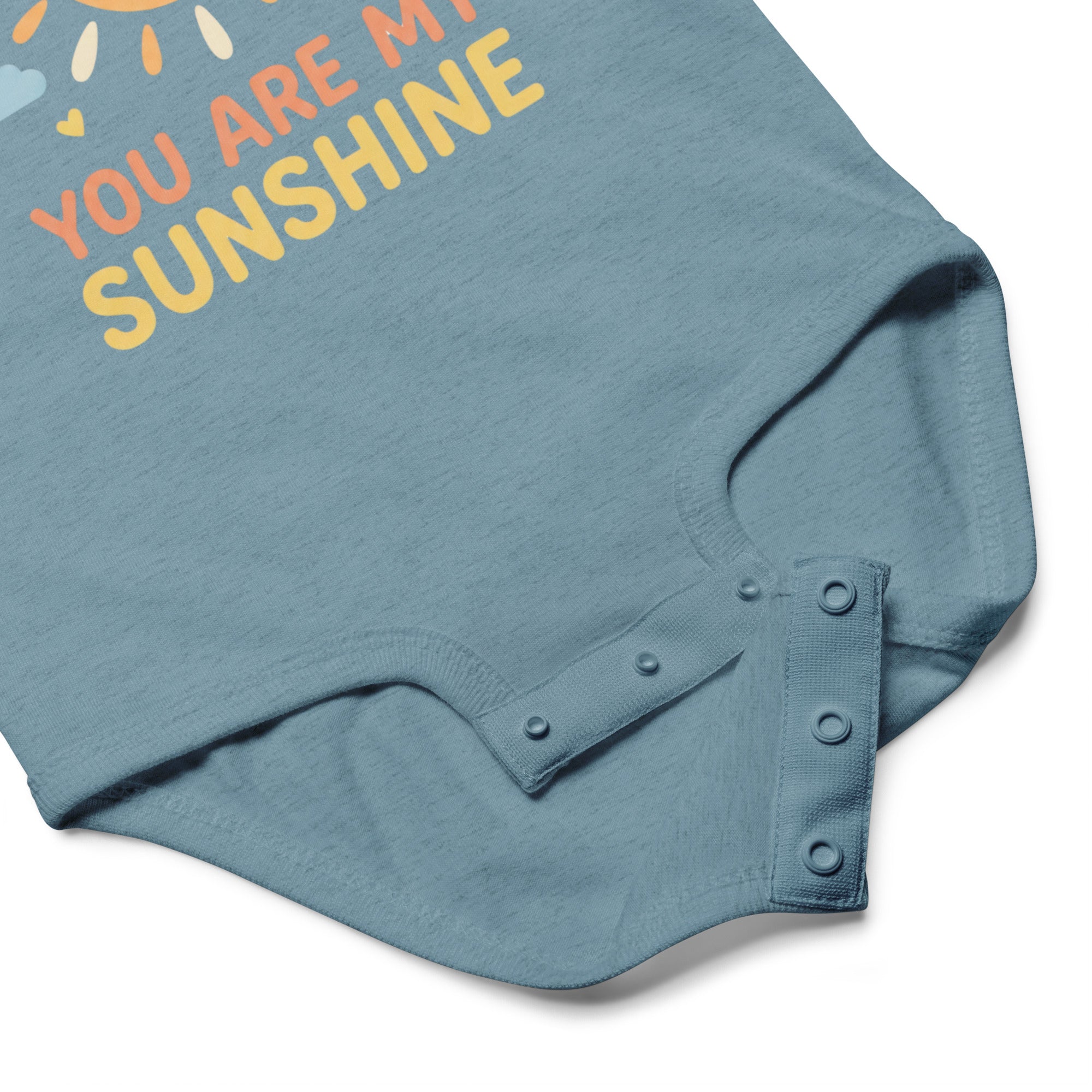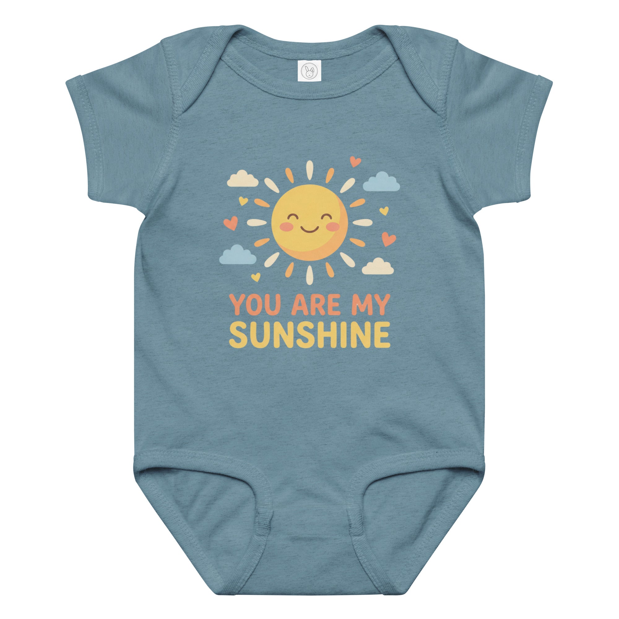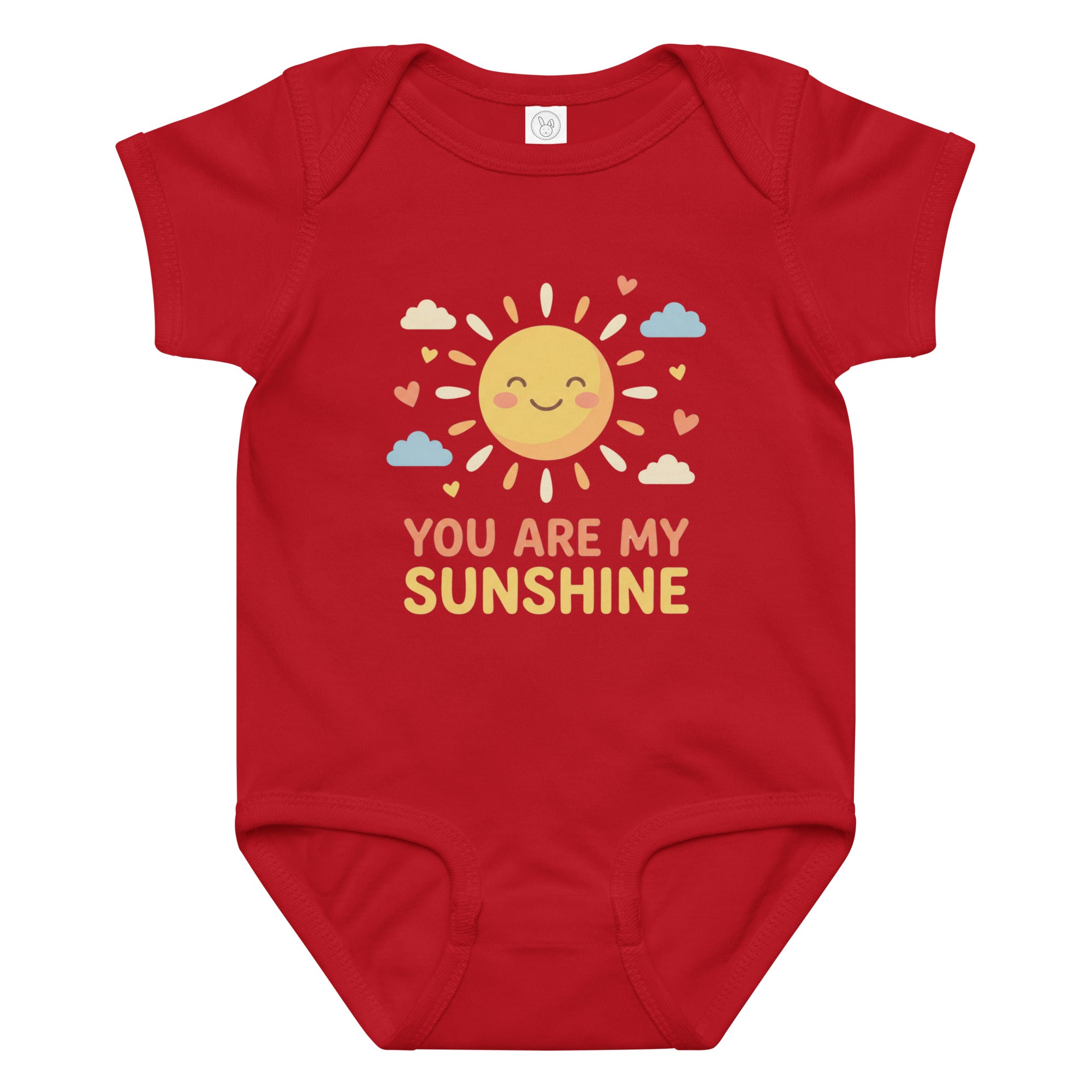 This adorable baby bodysuit features a cheerful, smiling sun graphic surrounded by bright sunbeams, fluffy clouds, and tiny hearts. Below the vibrant artwork, the heartwarming phrase 'YOU ARE MY SUNSHINE' is printed in a playful orange and yellow font. Crafted from 100% cotton jersey, this bodysuit provides ultimate softness and comfort for your little one, designed for gentle wear and easy diaper changes with its convenient snap closure.