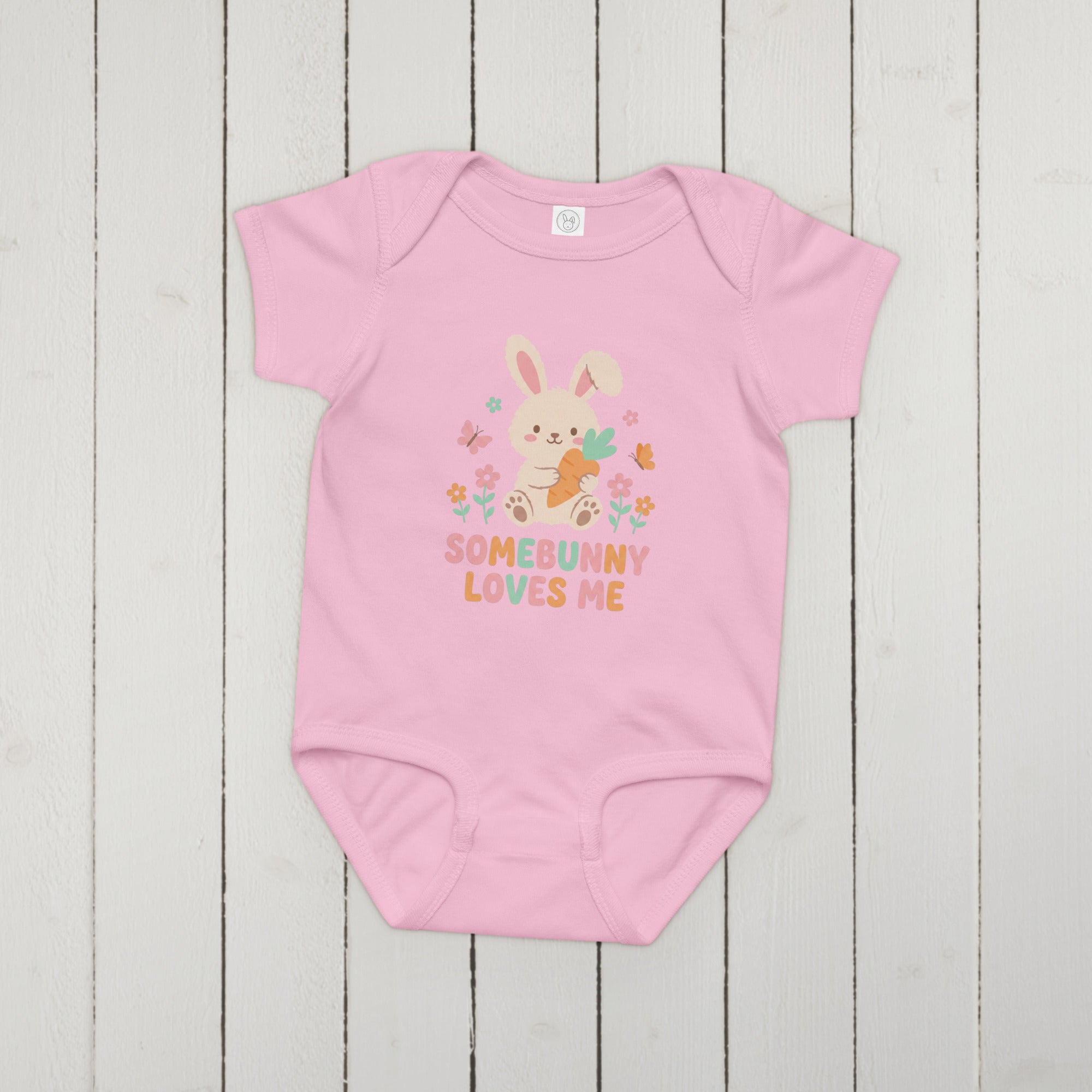 Featuring an adorable white bunny with pink ears, cheerfully holding a carrot, this design is surrounded by sweet pastel flowers and delicate butterflies. Below the charming illustration, the heartwarming phrase 'SOMEBUNNY LOVES ME' is printed in a playful, multi-colored font, creating a truly lovable look. This cozy garment is perfect for adding a touch of sweetness to any little one's wardrobe, making it an ideal choice for everyday wear or special occasions, ensuring ultimate comfort in a baby jersey bodysuit.