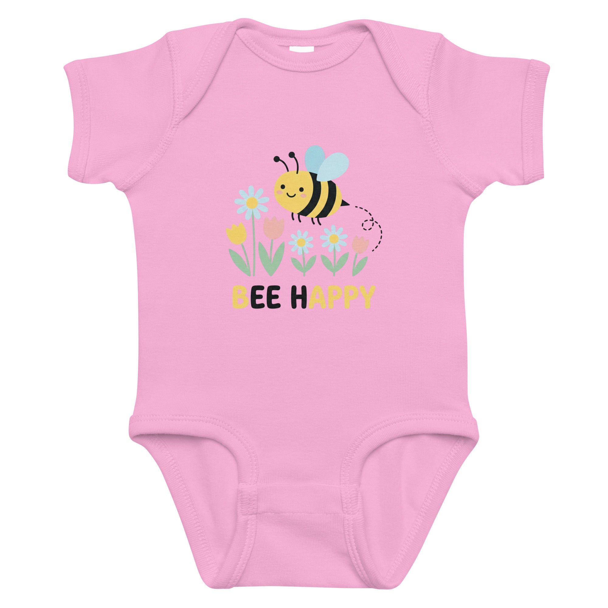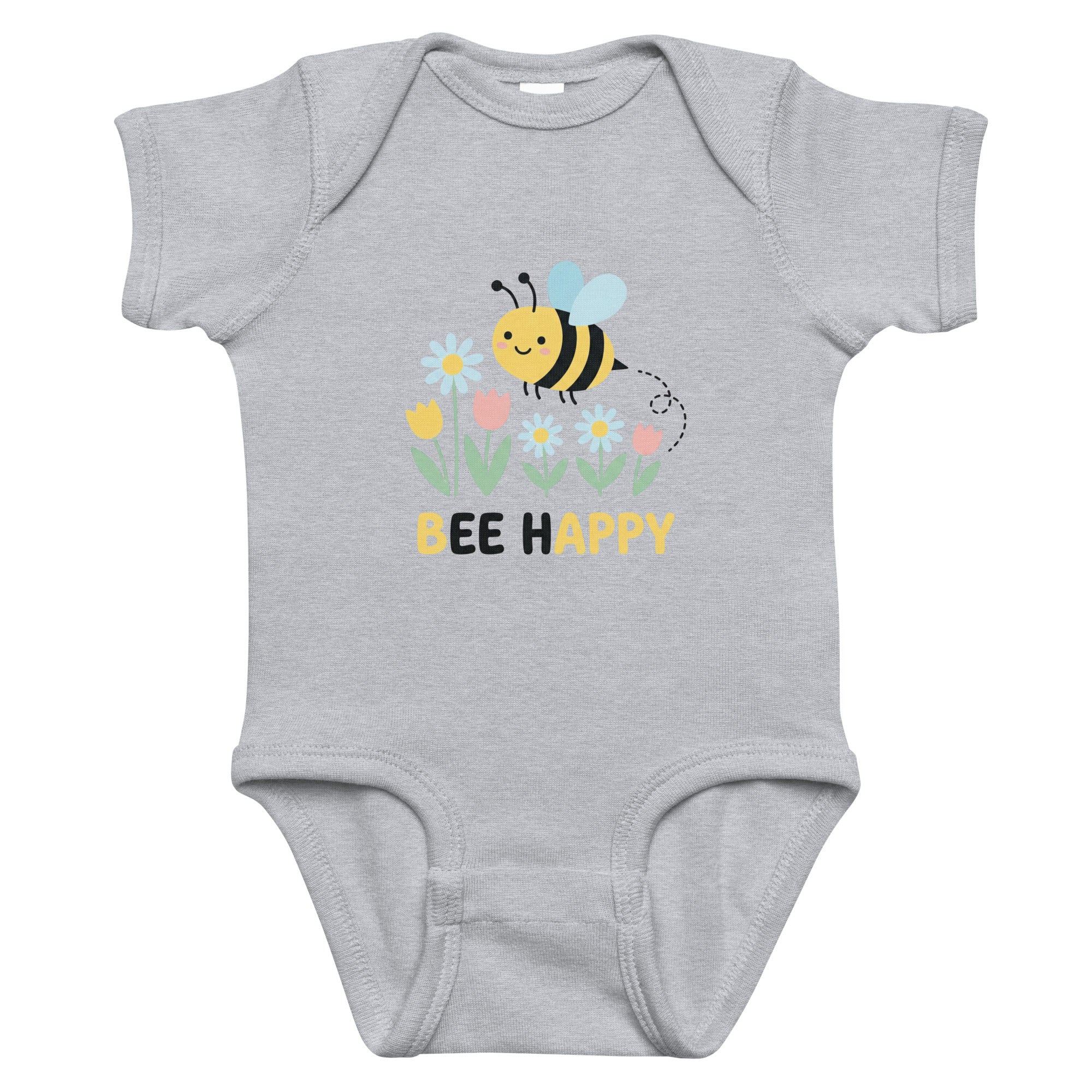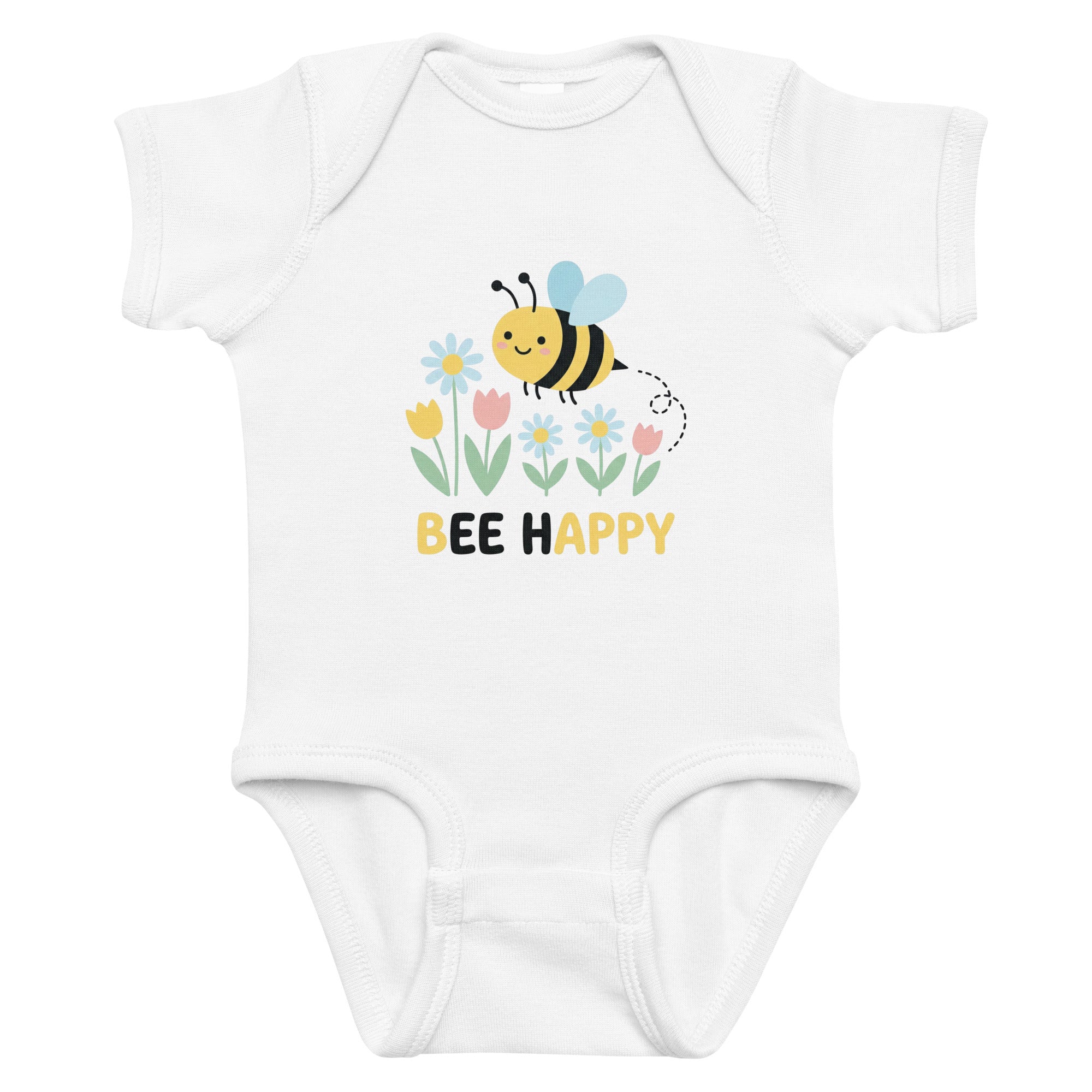 This adorable bodysuit features a cheerful cartoon bee with light blue wings, flying amidst a vibrant garden of blue, yellow, and pink flowers, all above the heartwarming message 'BEE HAPPY'. The playful artwork brings a touch of joy and nature, perfect for little ones. Designed for ultimate comfort and softness, it’s an ideal choice for everyday wear as a Baby Short Sleeve Bodysuit.