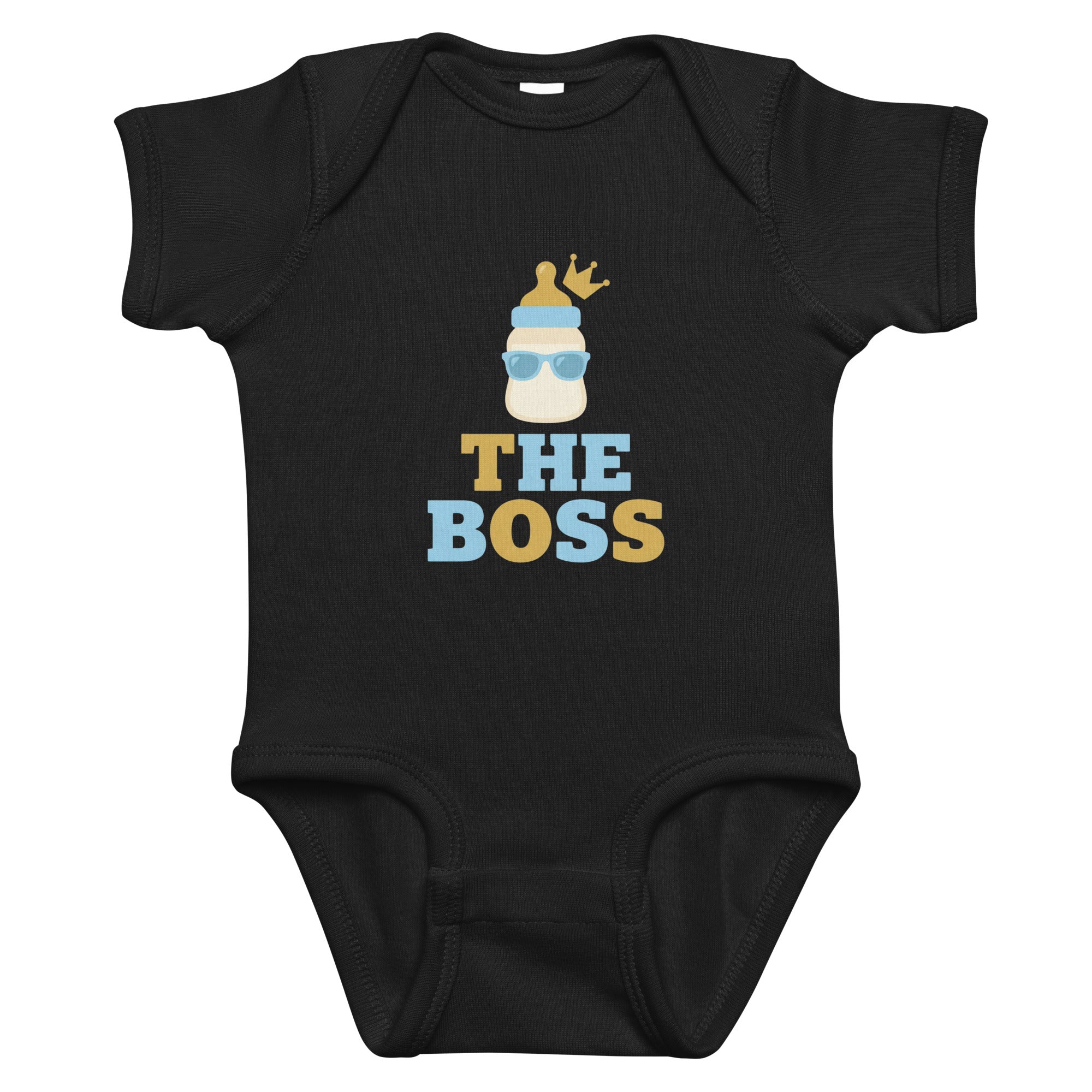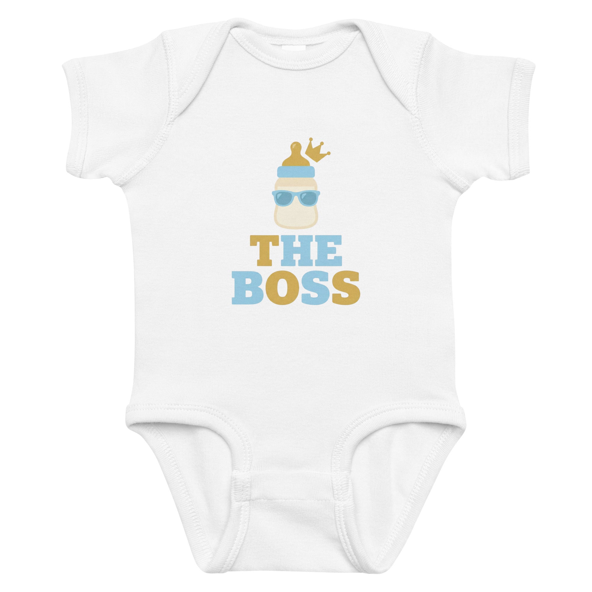 This adorable infant bodysuit features a fun graphic of a baby bottle wearing cool light blue sunglasses and a golden crown, clearly proclaiming 'THE BOSS' in light blue and gold typography. The playful design in pastel blues, creams, and golds makes this a charming and humorous outfit for your little one. Crafted for ultimate comfort, this Baby Short Sleeve Bodysuit is perfect for everyday wear and special occasions.