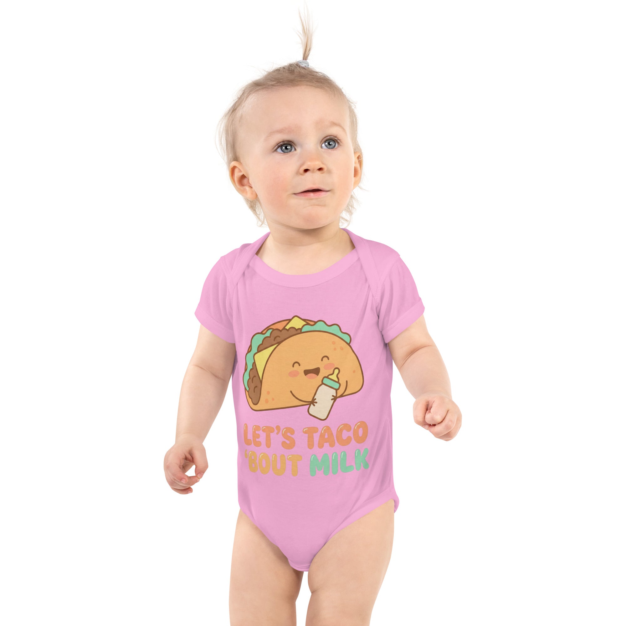 • Print/Design: A cheerful cartoon taco holding a baby bottle, with the punny phrase 'LET'S TACO 'BOUT MILK' in coral and mint green.