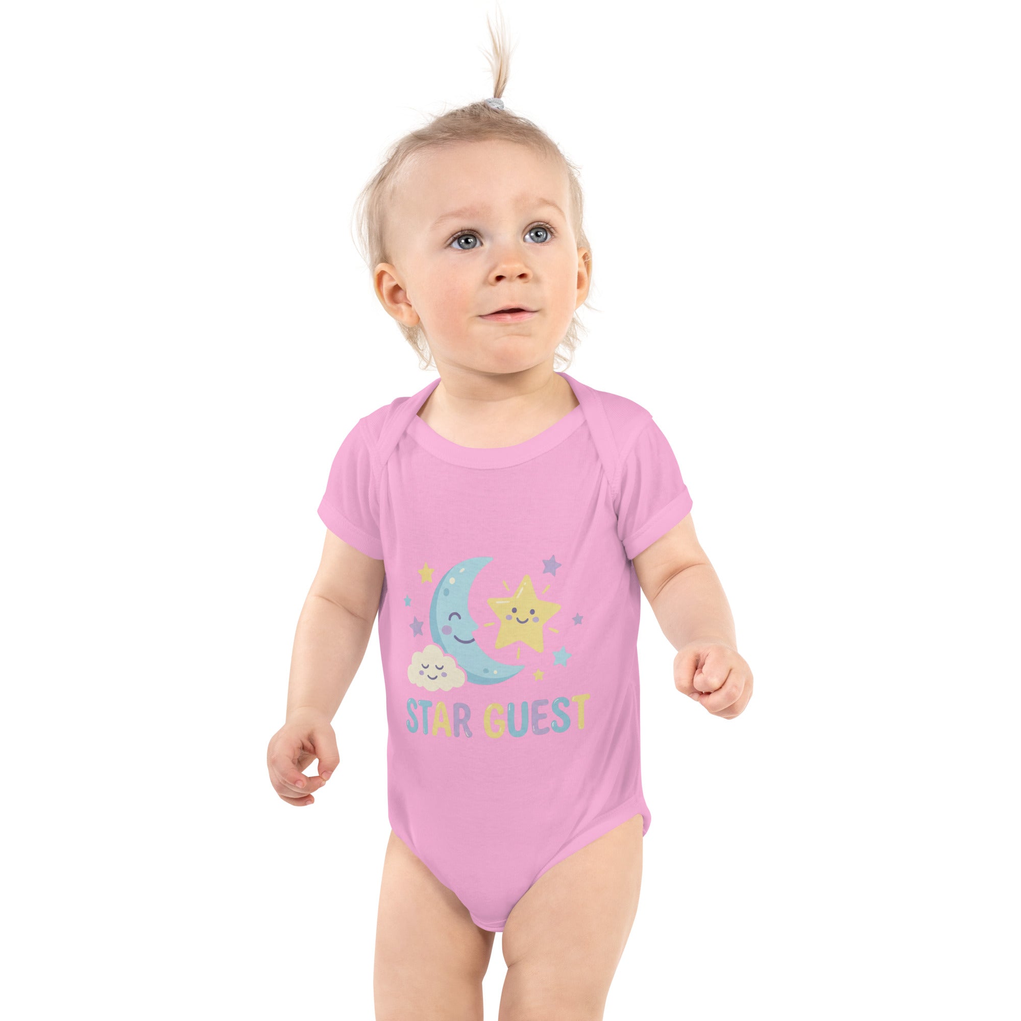 A charming design features a whimsical light blue crescent moon and a joyful yellow star, surrounded by smaller pastel stars in yellow, light blue, and purple. Two sweet white clouds float beneath them, with the phrase 'STAR GUEST' spelled out in playful pastel lettering below. This delightful illustration evokes a serene and joyful feeling, perfect for welcoming a little one. This soft and comfortable bodysuit is ideal for everyday wear, ensuring your baby stays cozy and stylish for playtime or naptime. Enjoy the gentle feel and lasting quality of this Baby Short Sleeve Bodysuit.
