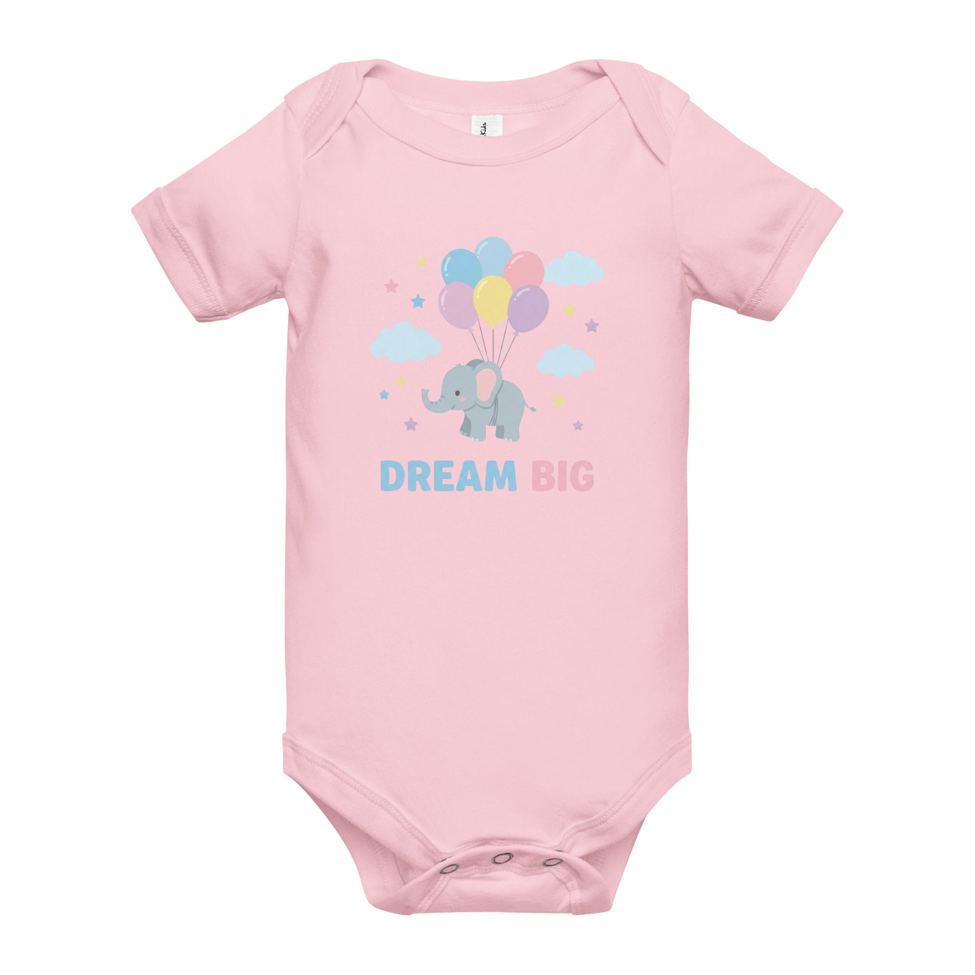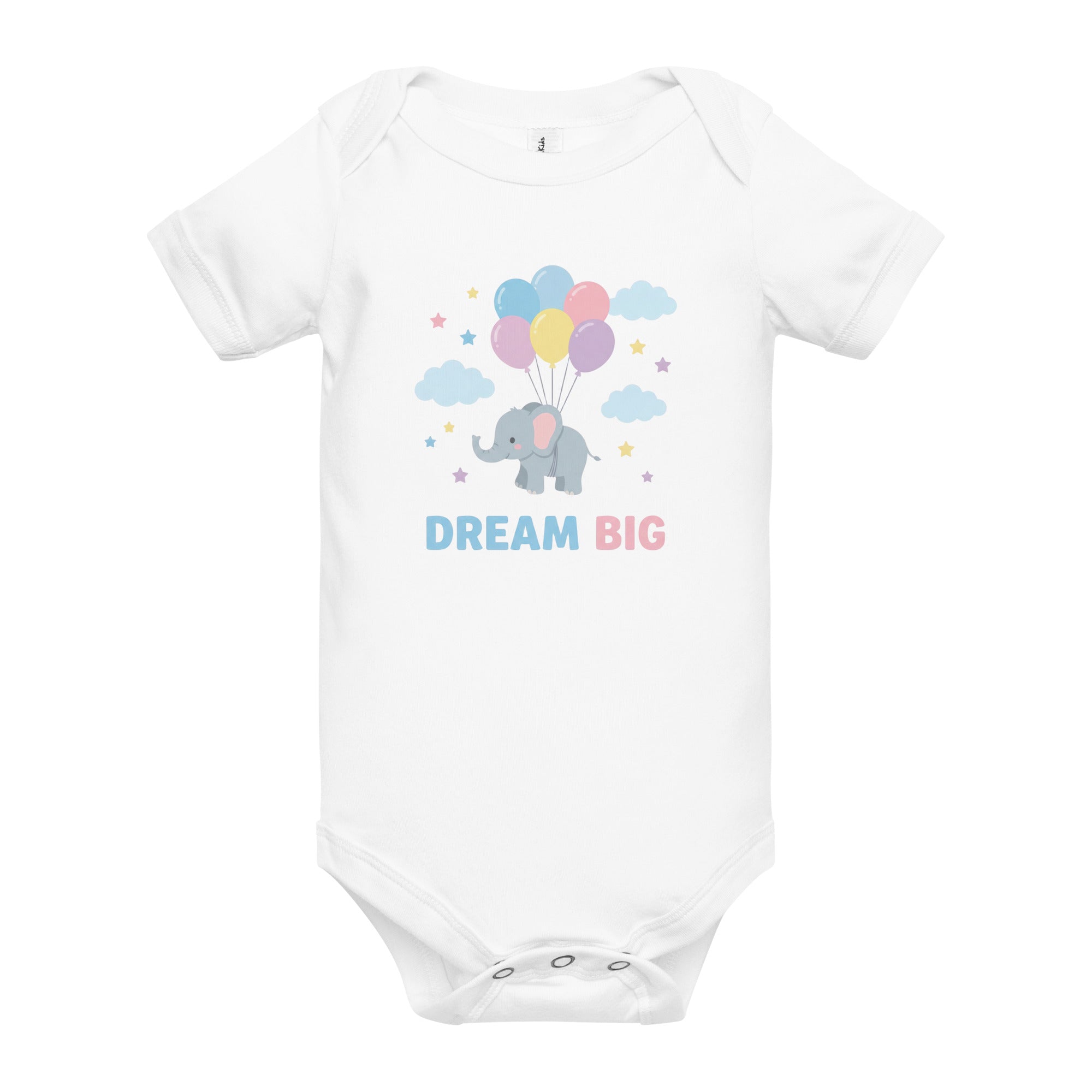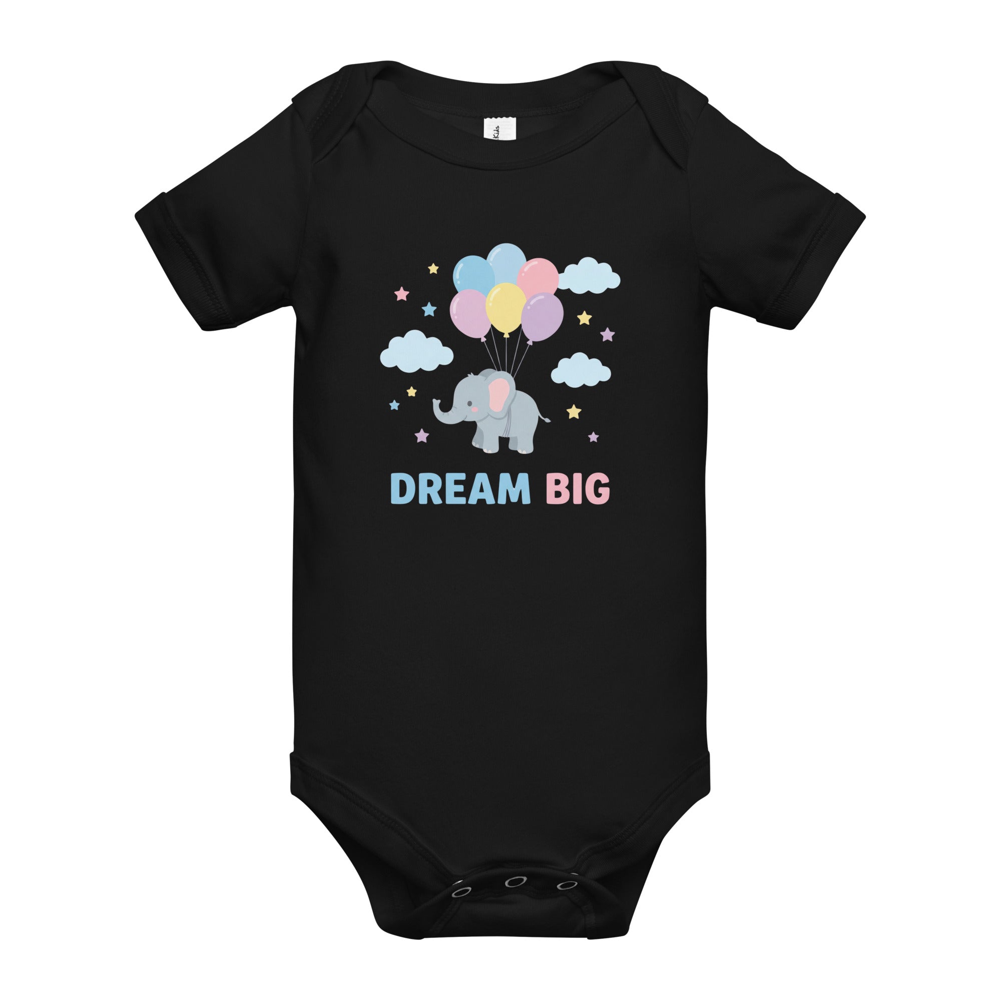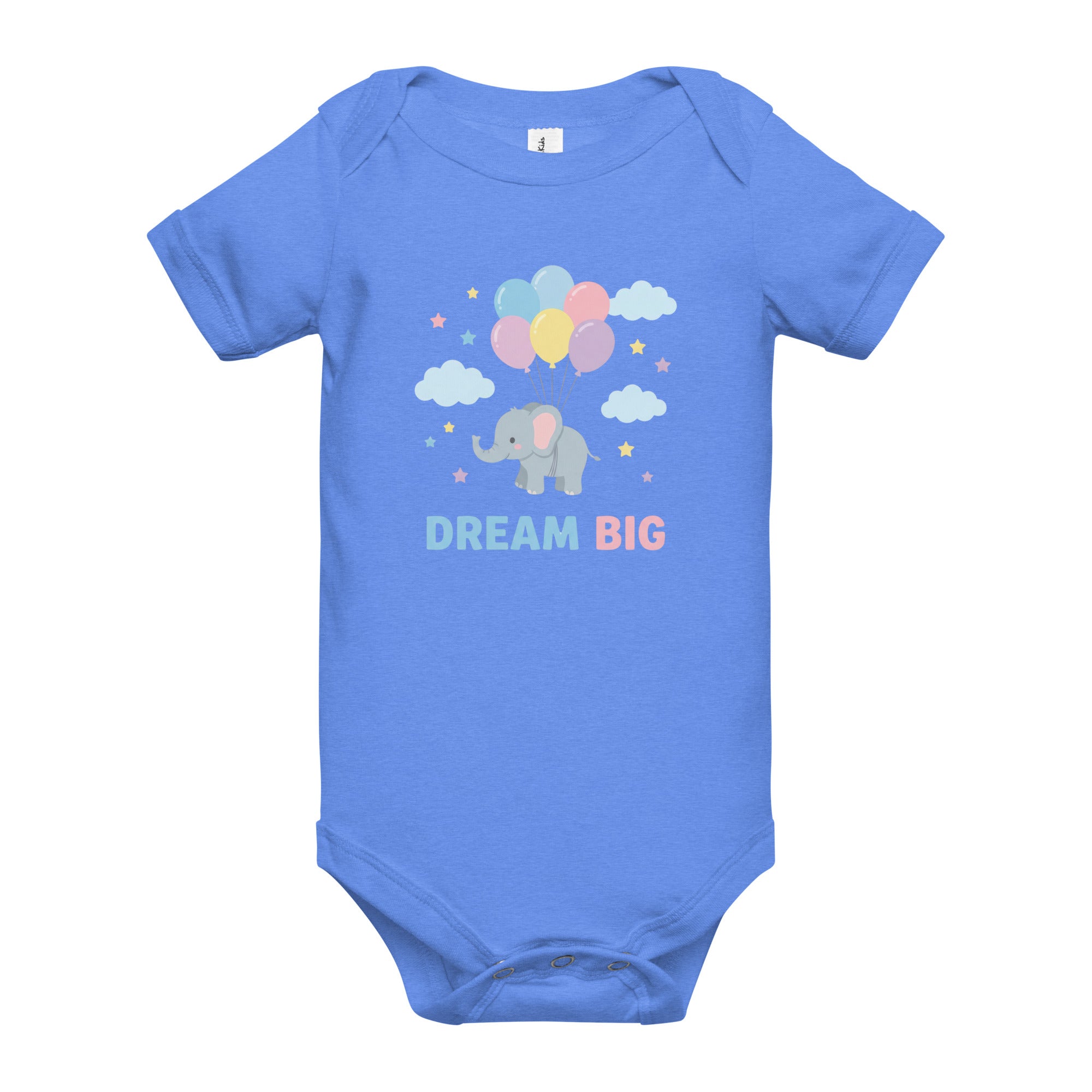 Inspire sweet dreams and big aspirations with this charming baby short sleeve bodysuit. It features an adorable grey baby elephant gracefully floating upwards, clutching a vibrant bunch of balloons in soft pastel shades of blue, pink, yellow, and purple. Accented by gentle clouds and twinkling stars, the design is completed with the uplifting message 'DREAM BIG' in coordinated light blue and pink typography. This adorable design combines a sweet visual with an uplifting message, all while ensuring ultimate comfort for your little one in this soft Baby Short Sleeve Bodysuit.