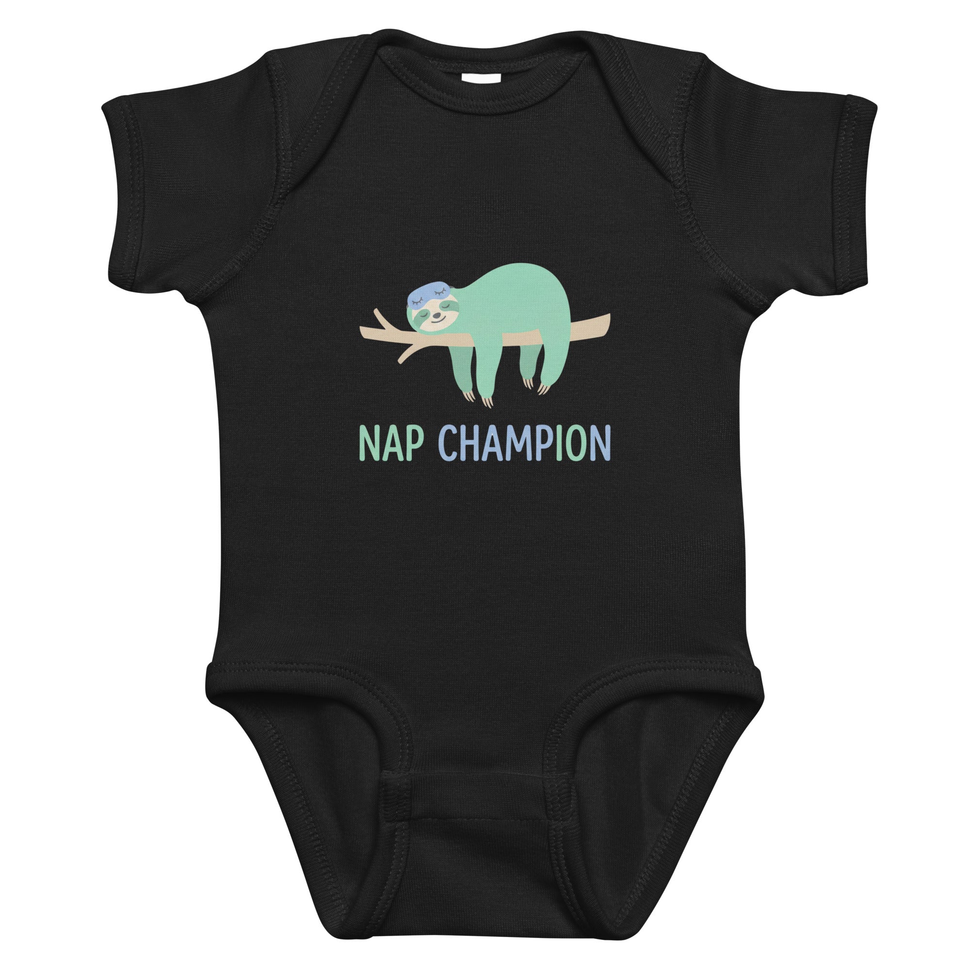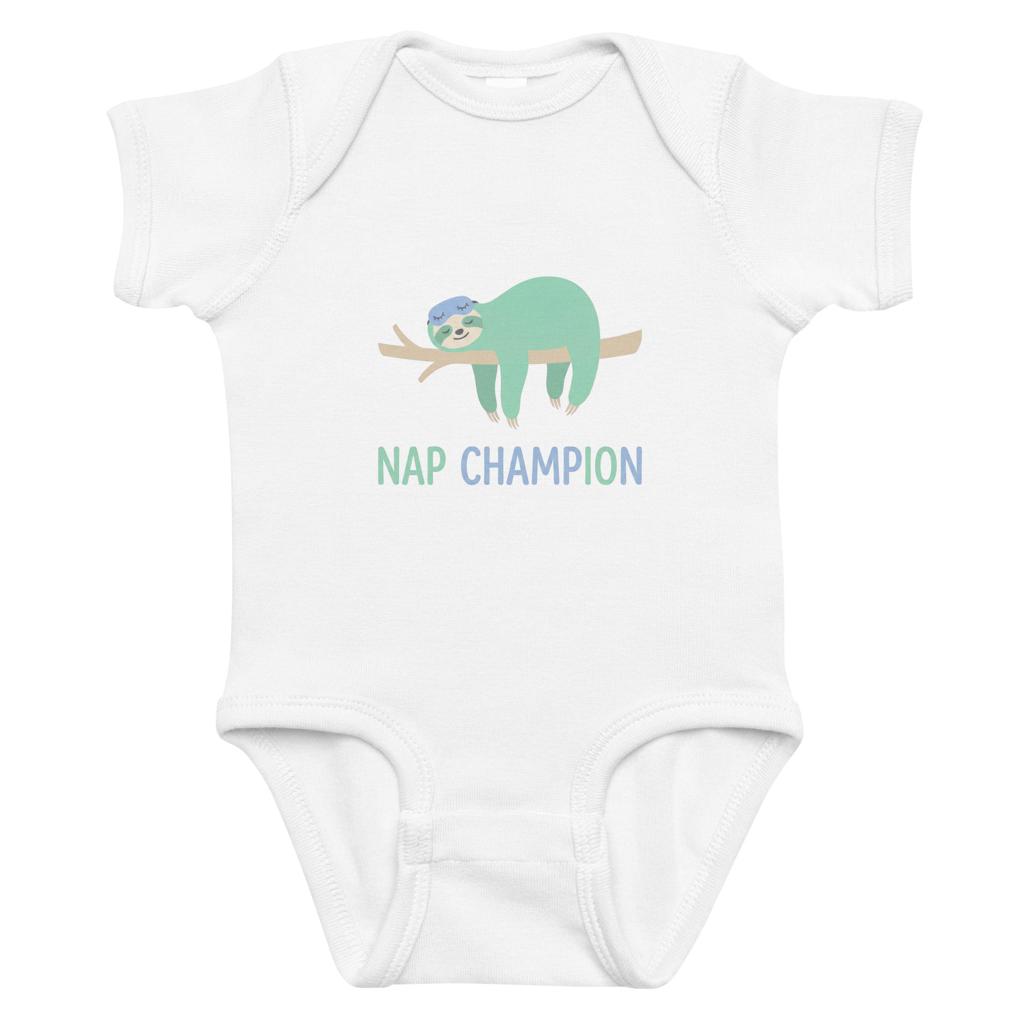 This adorable baby bodysuit features a charming illustration of a serene, light teal sloth comfortably napping on a light brown branch, complete with a cozy light blue sleeping mask. Below the sleepy character, the playful phrase 'NAP CHAMPION' is emblazoned in matching teal and blue hues. Designed for little ones who excel at restful slumber, this Baby Short Sleeve Bodysuit offers ultimate comfort for everyday wear.