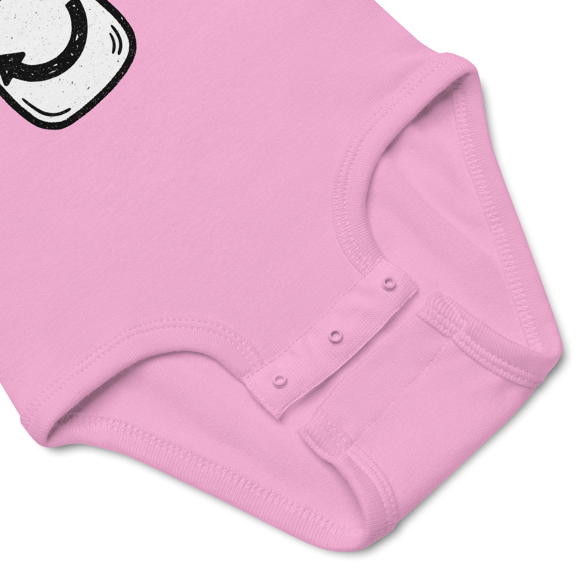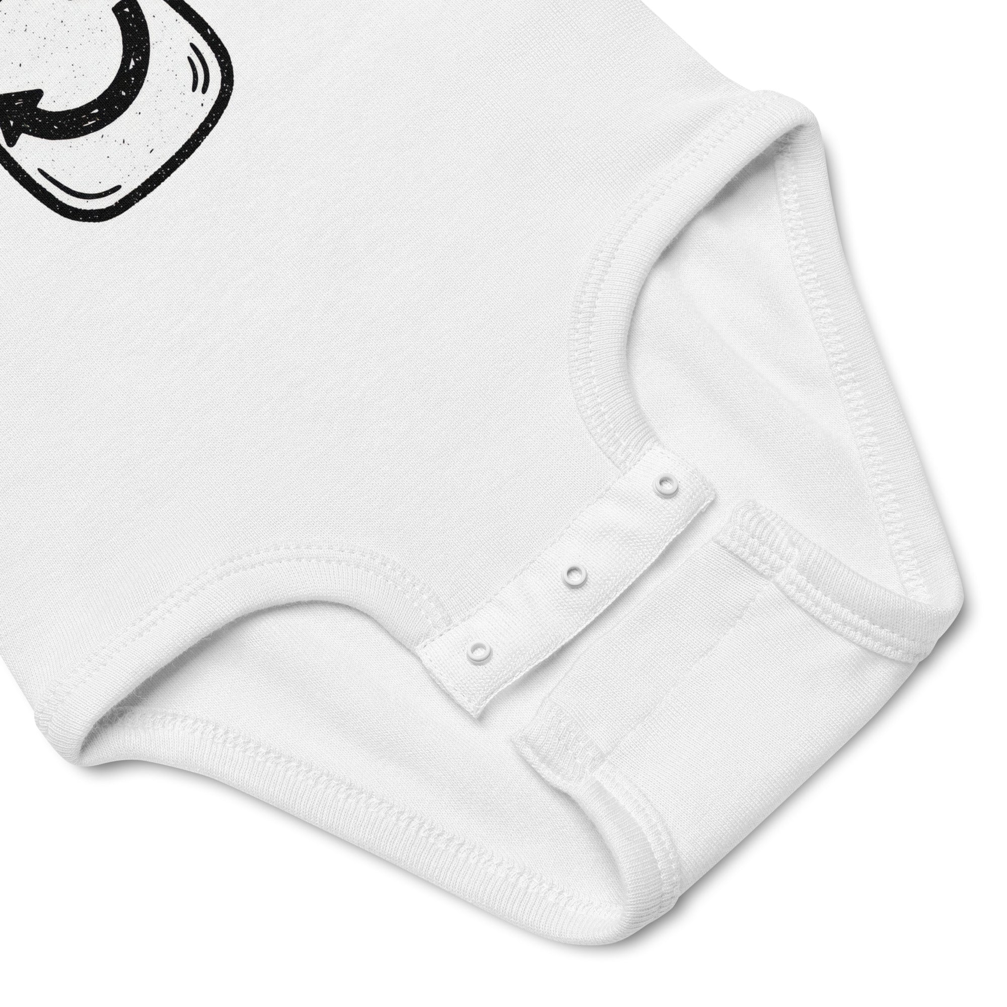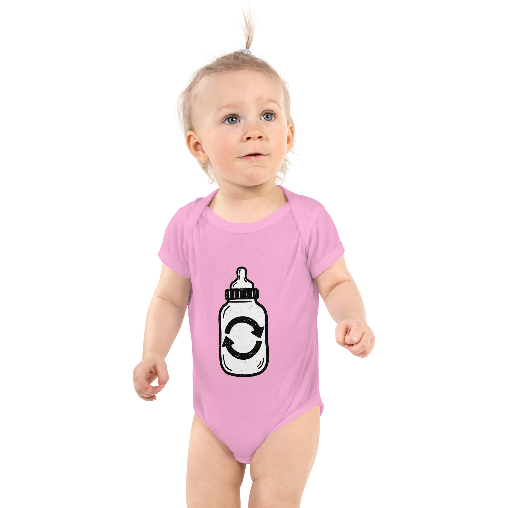 This adorable design features a hand-drawn black outline sketch of a baby bottle, cleverly incorporating a recycling symbol within its form, symbolizing sustainability and care. Crafted from soft, light fabric, this bodysuit is designed for an infant unisex fit, making it a versatile and thoughtful choice for any little one. It offers exceptional comfort for all-day wear, making this Baby Short Sleeve Bodysuit a pleasure for your baby.