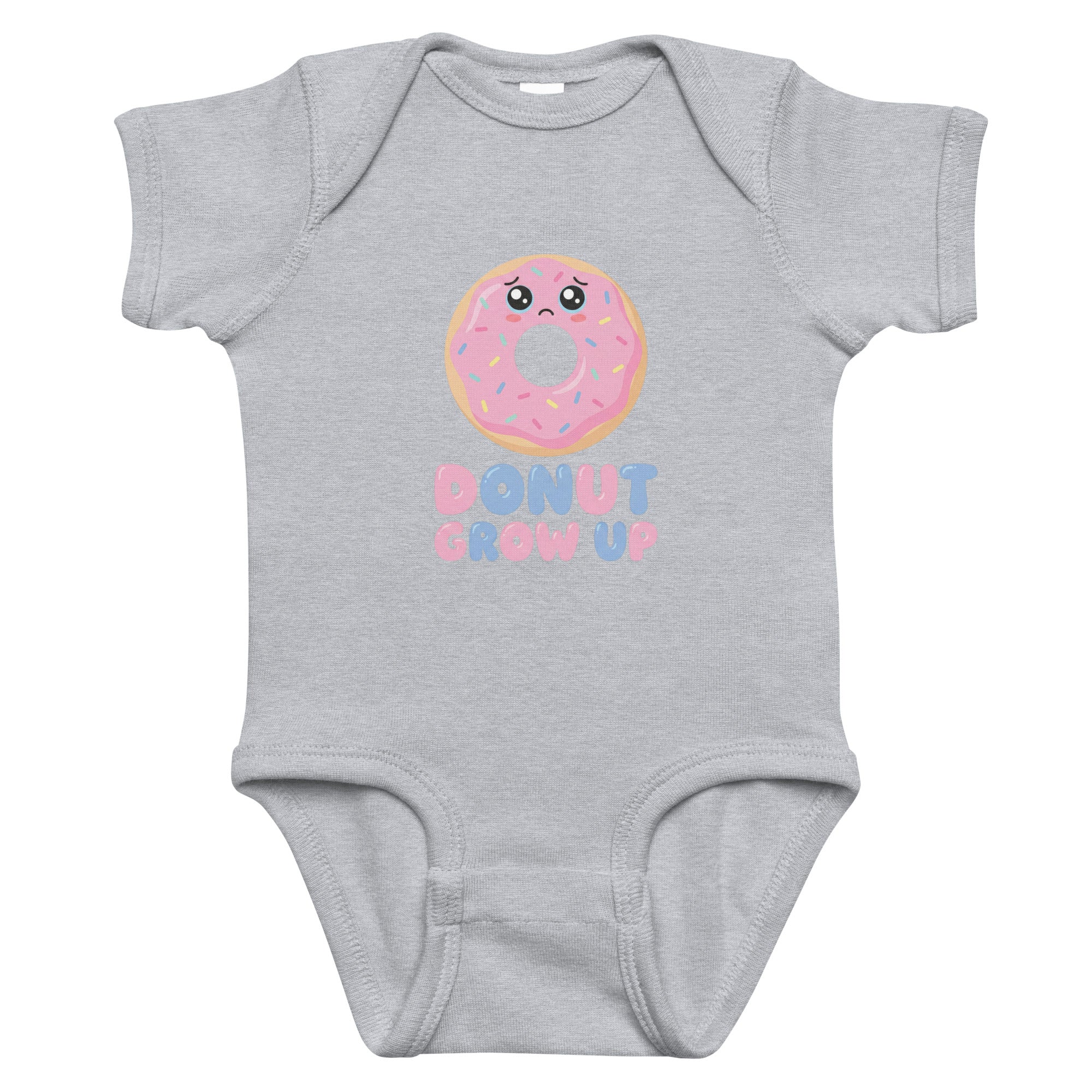 Dress your little one in this irresistibly cute baby bodysuit featuring a charming sad pink donut graphic adorned with colorful sprinkles. Below the whimsical illustration, the playful phrase 'DONUT GROW UP' is printed in alternating pastel pink and blue letters, adding a touch of humor and nostalgia. This soft and comfortable bodysuit is perfect for daily adventures, capturing hearts with its sweet design and gentle feel. Your baby will stay cozy and stylish in this delightful Baby Short Sleeve Bodysuit.
