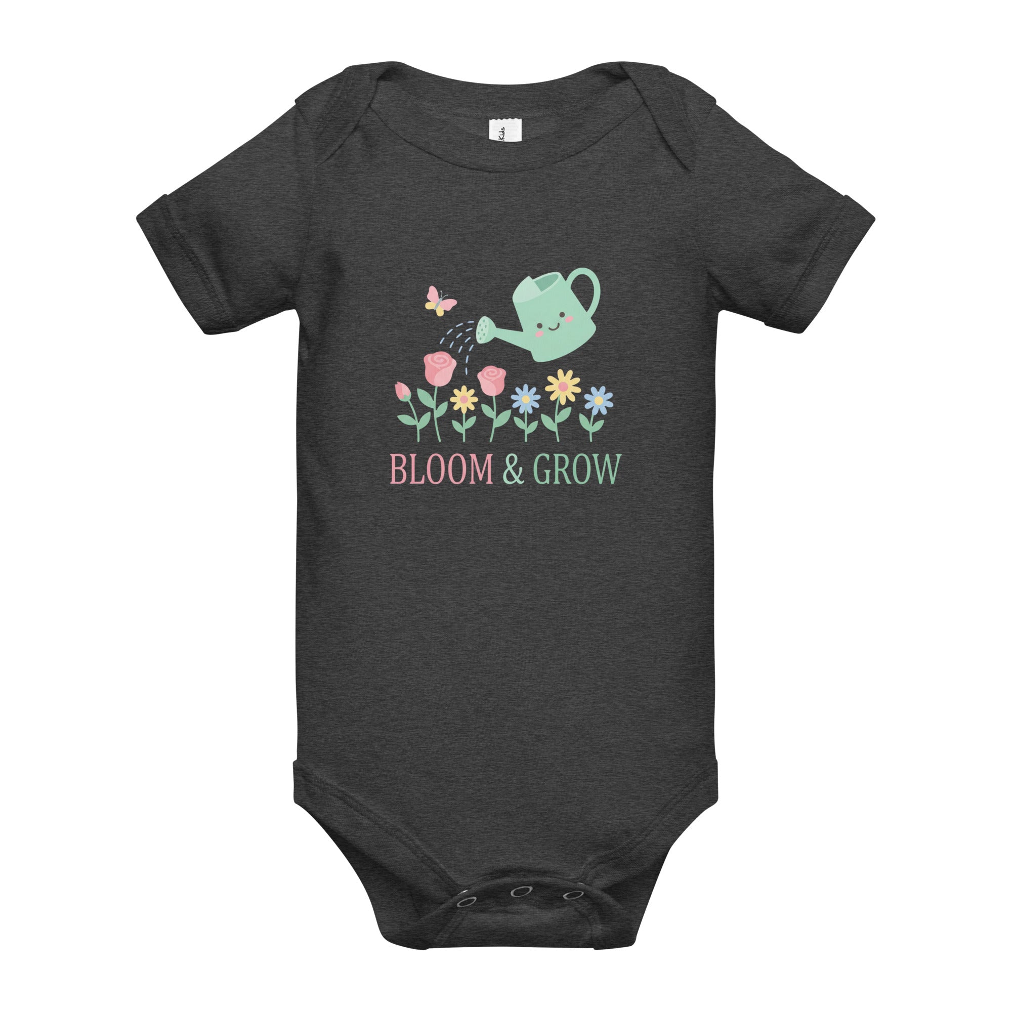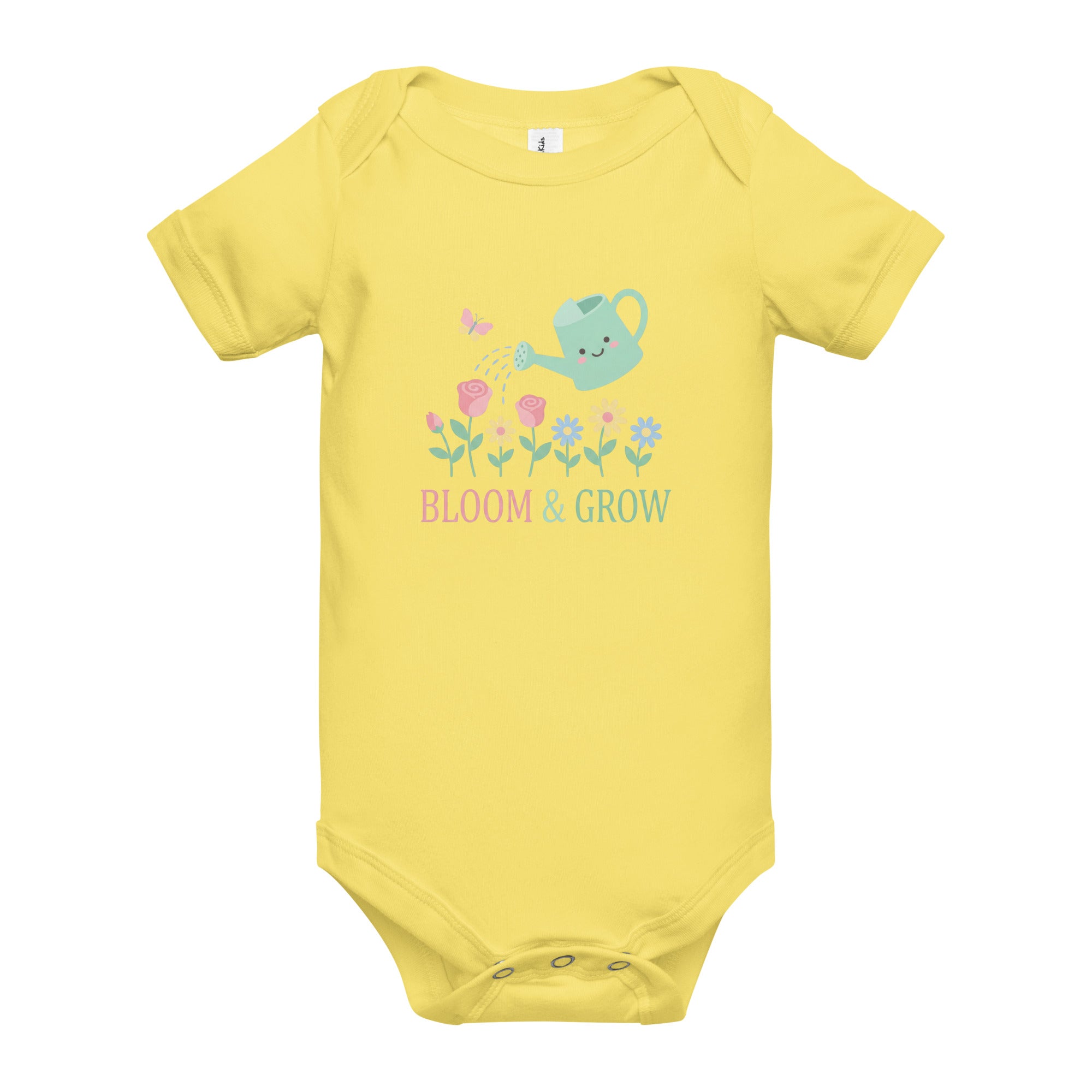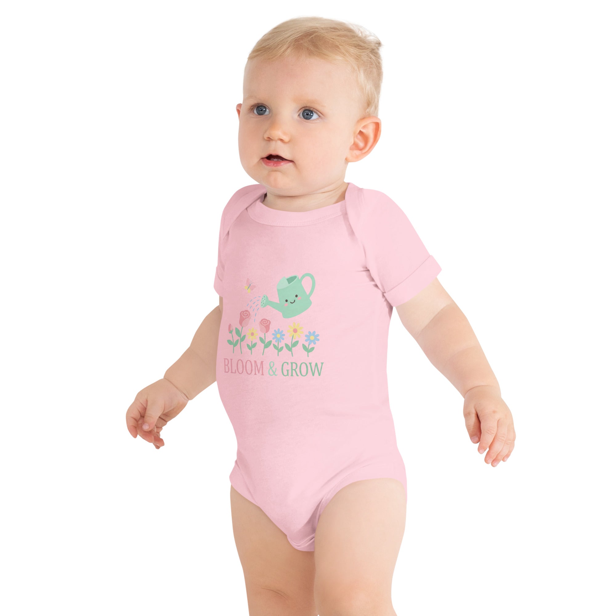Celebrate the joy of nature with our adorable 'Bloom & Grow Garden' baby short sleeve one piece. This charming design features a friendly green watering can tending to sweet pink roses and a delightful row of yellow and blue flowers, accompanied by a little pink butterfly, all above the inspiring text 'BLOOM & GROW' in soft pastel pink and green. Crafted for comfort and everyday wear, this piece is perfect for little ones discovering the world around them, making it an ideal, comfortable Baby Short Sleeve One Piece for any occasion.