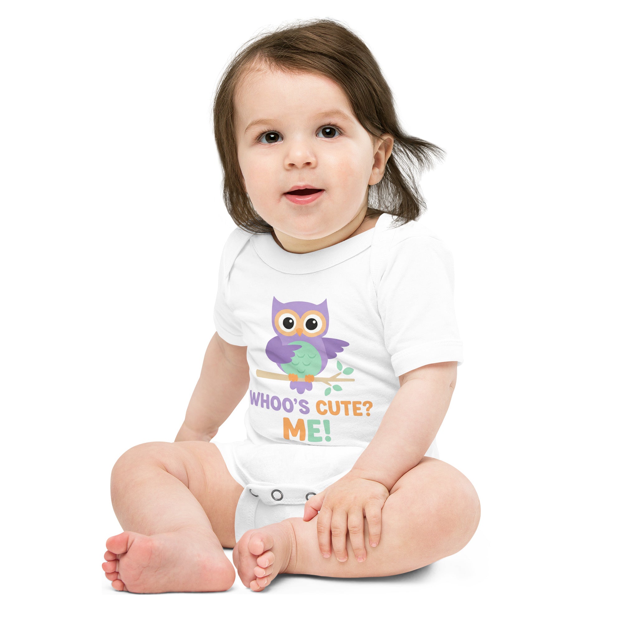 This adorable Baby Short Sleeve One Piece features a charming cartoon owl, crafted in soft purple with a teal belly, perched on a branch with delicate green leaves. Below the sweet owl, the playful message 'WHOO'S CUTE? ME!' is printed in coordinating pastel purple, orange, and teal, adding a fun touch. Made to be gentle and breathable, this is the perfect outfit for any little one, providing exceptional comfort in a delightful Baby Short Sleeve One Piece.