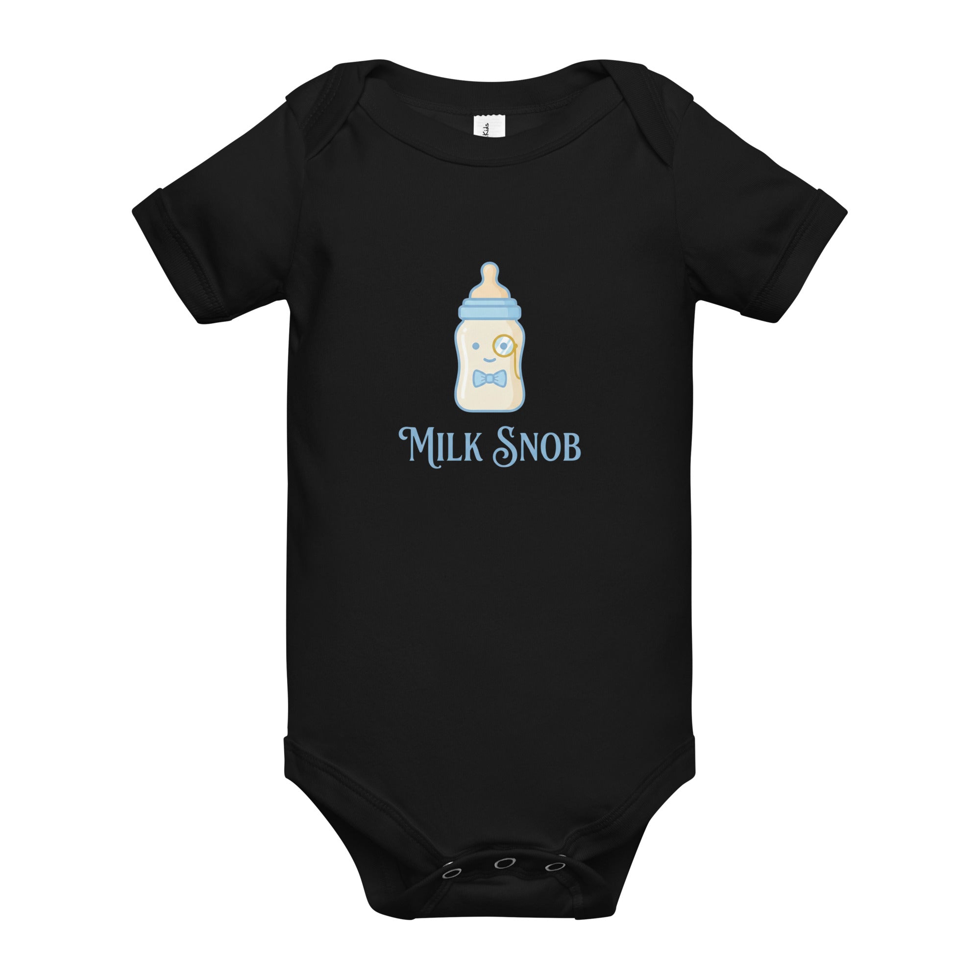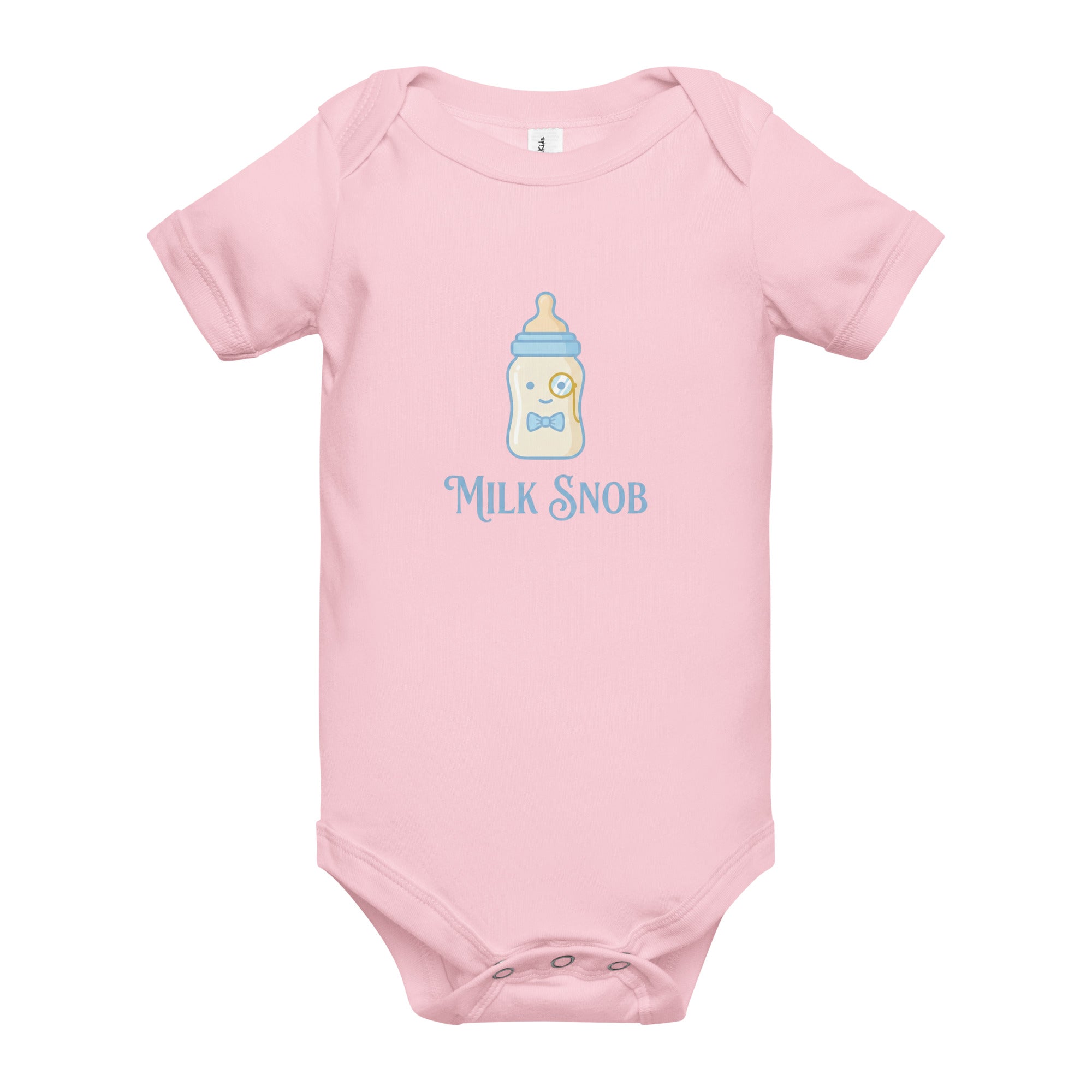 A charming baby bottle character is printed on the front, complete with a smiling face, a light blue bow tie, and a distinguished gold monocle. Below this dapper design, the elegant script text 'Milk Snob' declares a playful attitude. This soft and stylish piece is perfect for little ones with sophisticated taste, adding a touch of humor and charm to their everyday wardrobe. It offers a comfortable, unrestricted fit for all-day wear, making it an ideal Baby Short Sleeve One Piece.