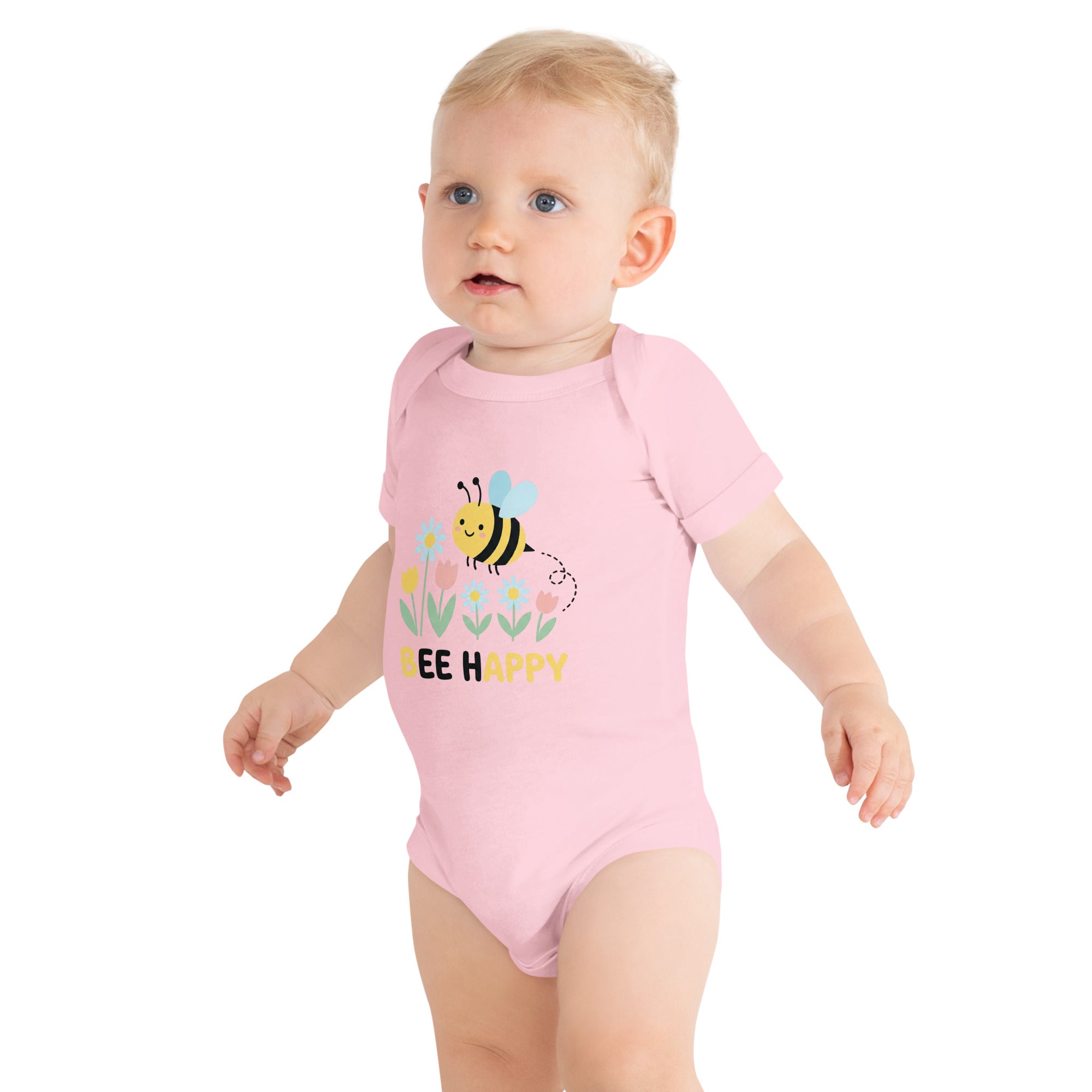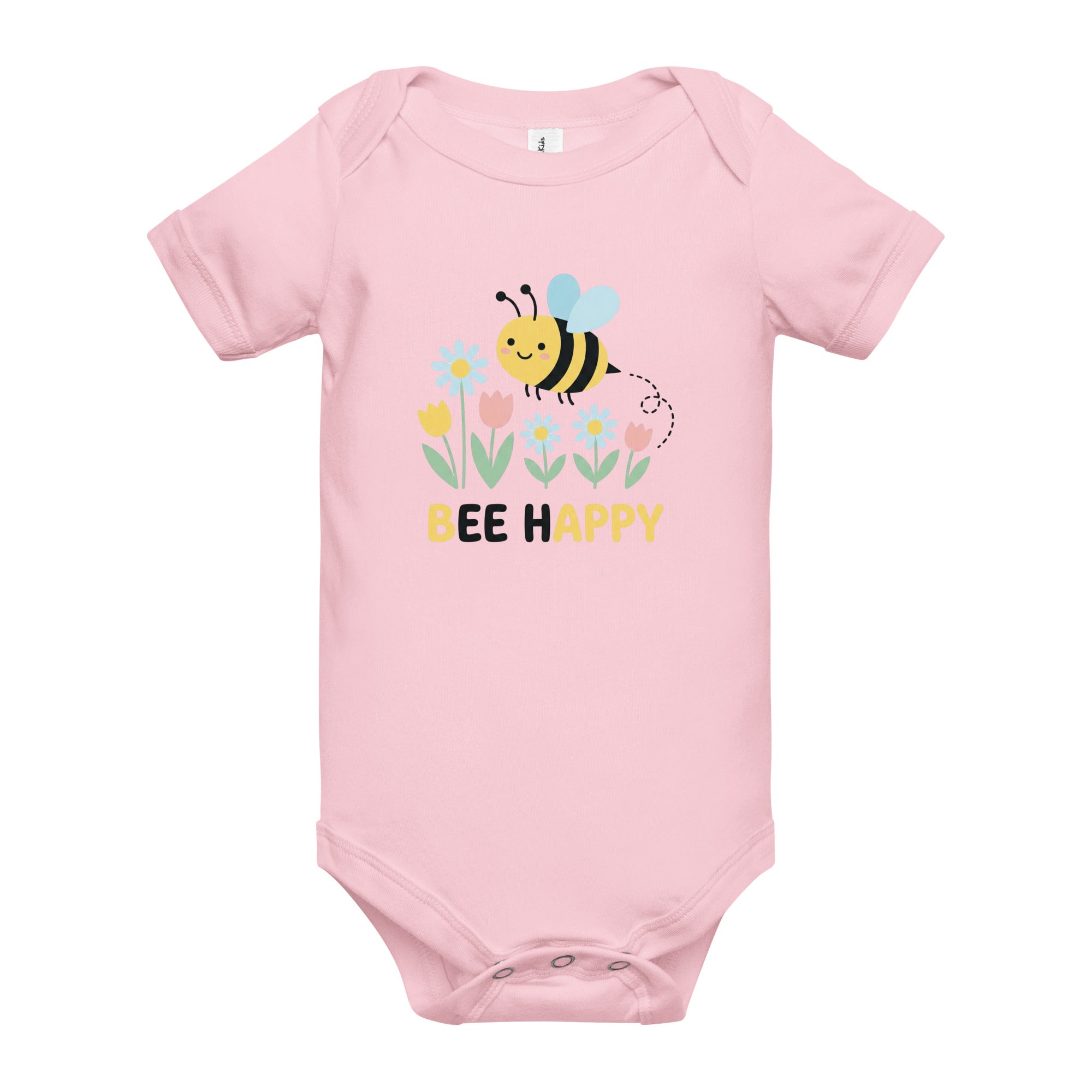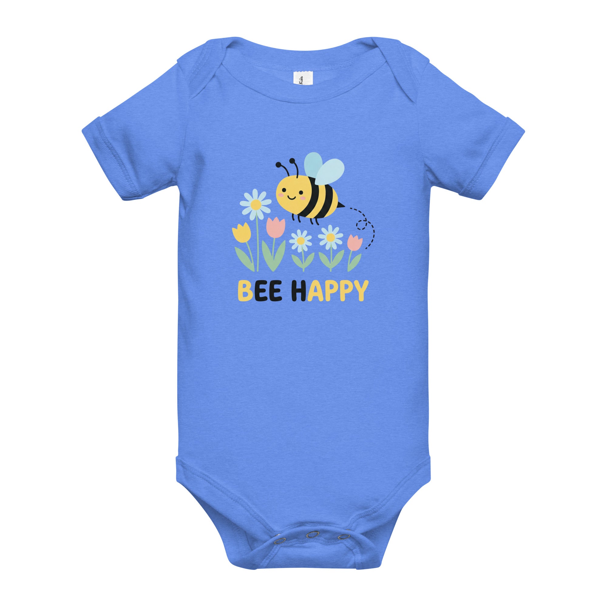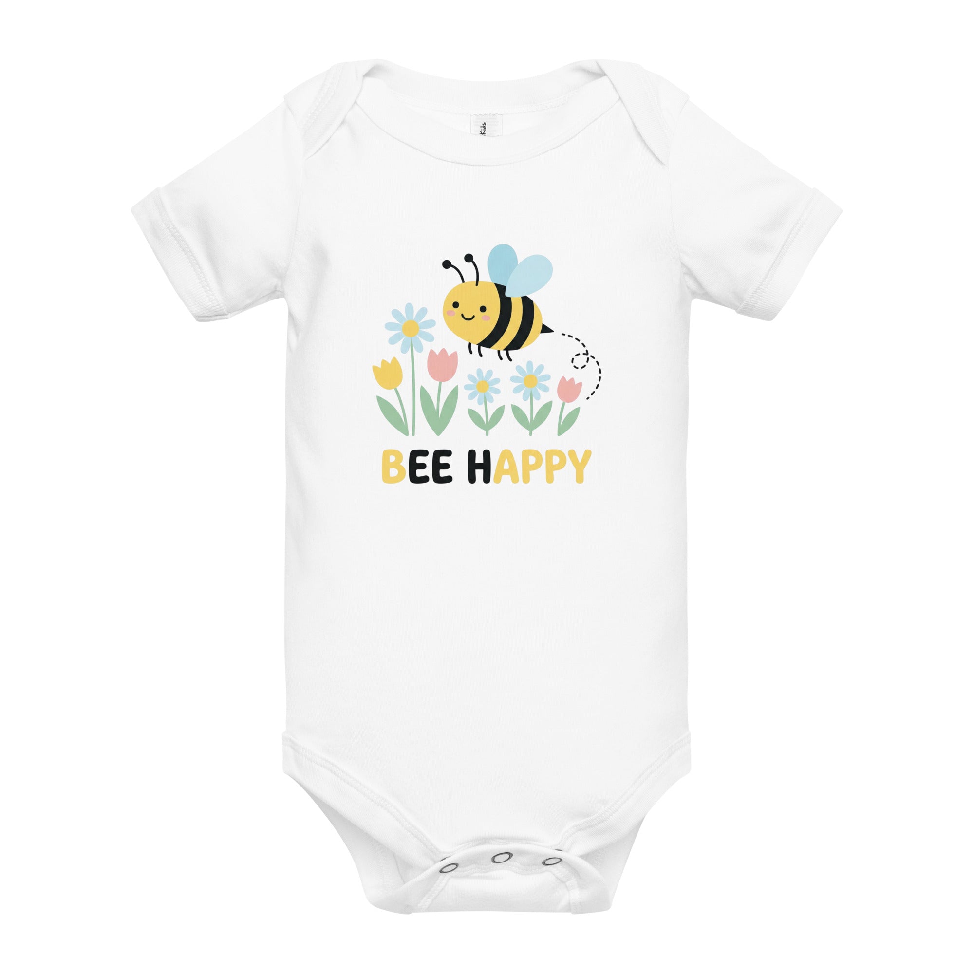 Brighten your little one's day with this charming design featuring a cute, happy cartoon bumblebee with light blue wings, flying gracefully above a vibrant garden of white daisy-like flowers, cheerful yellow tulips, and sweet pink tulips. Below this delightful floral scene, the uplifting message 'BEE HAPPY' is proudly displayed in bold yellow text. This adorable design is printed on a soft and snug Baby Short Sleeve One Piece, providing ultimate comfort for your little one.