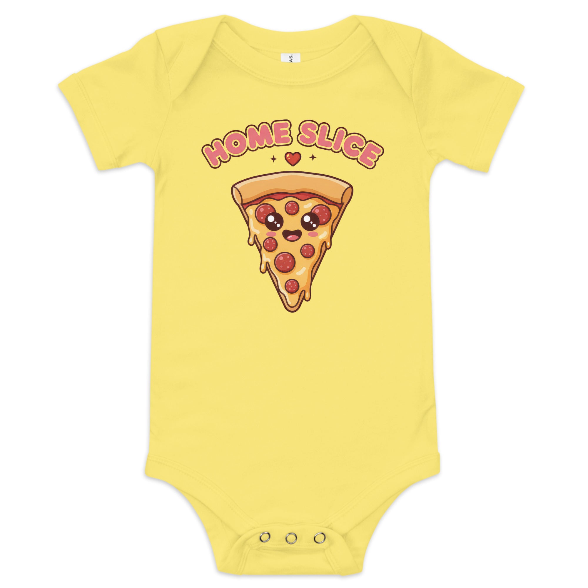 Celebrate the newest member of your family with this delightful baby short sleeve one piece, featuring a cheerful cartoon pizza slice complete with pepperoni and a wide, happy smile. Above the adorable graphic, the bubbly pink-outlined text 'HOME SLICE' is playfully displayed, accompanied by a small red heart and plus signs. This sweet design is perfect for showing off your little 'home slice' in style. Designed for both visual appeal and ease of wear, it’s a charming addition to any baby’s wardrobe, ensuring comfort throughout the day.