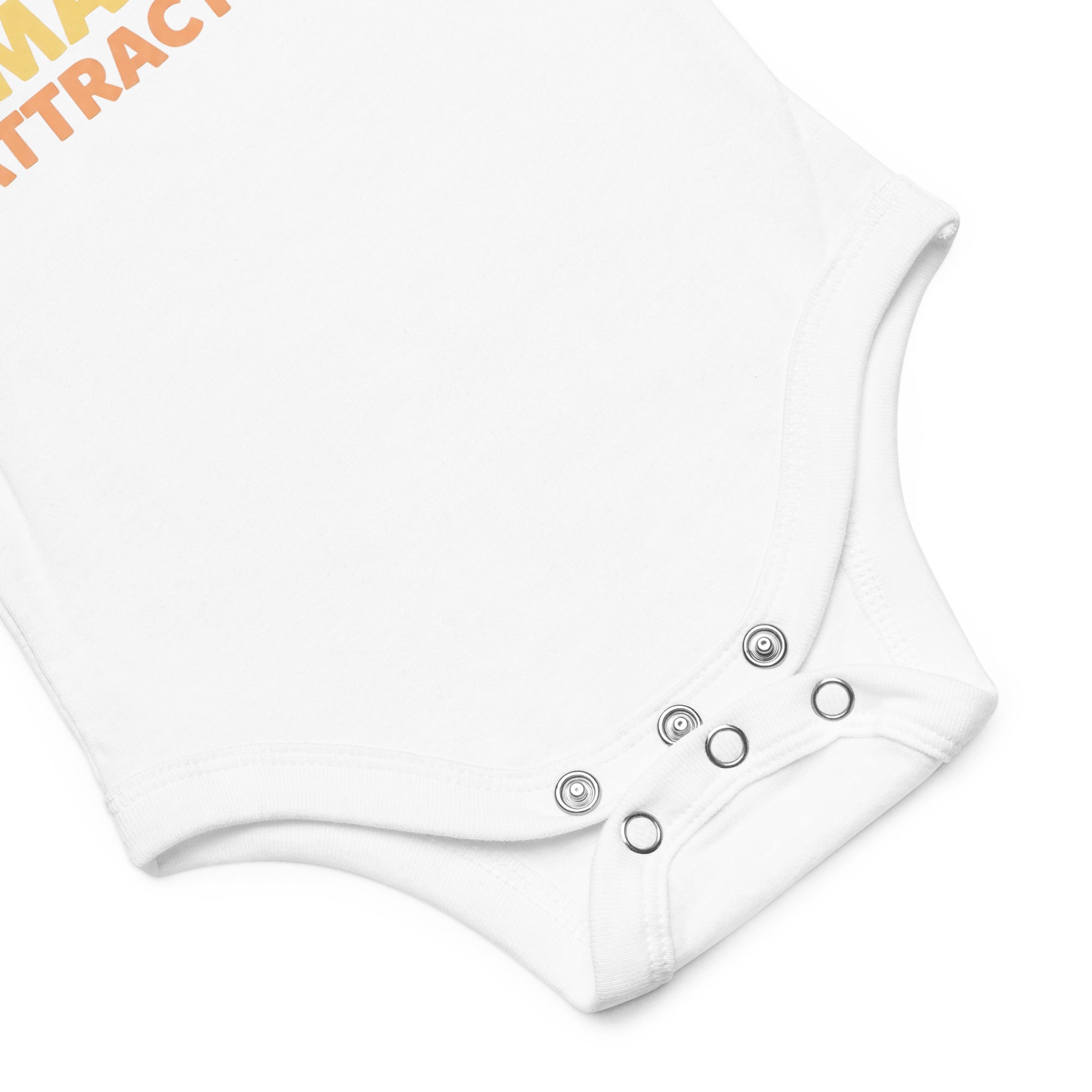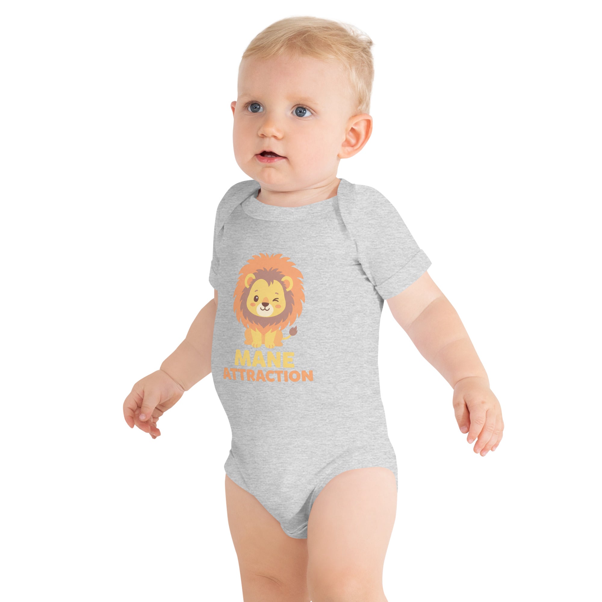 This adorable baby short sleeve one piece features a charming, winking baby lion cub with a fluffy orange-brown mane sitting front and center. Below the playful graphic, the clever pun 'MANE ATTRACTION' is displayed in bold orange and peach lettering, making for an irresistibly cute design. Crafted for comfort and style, this piece is perfect for your little one's daily adventures, offering a cozy and secure fit.