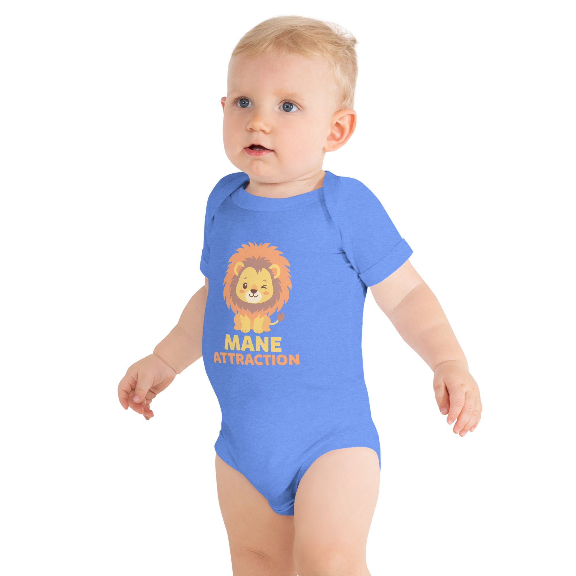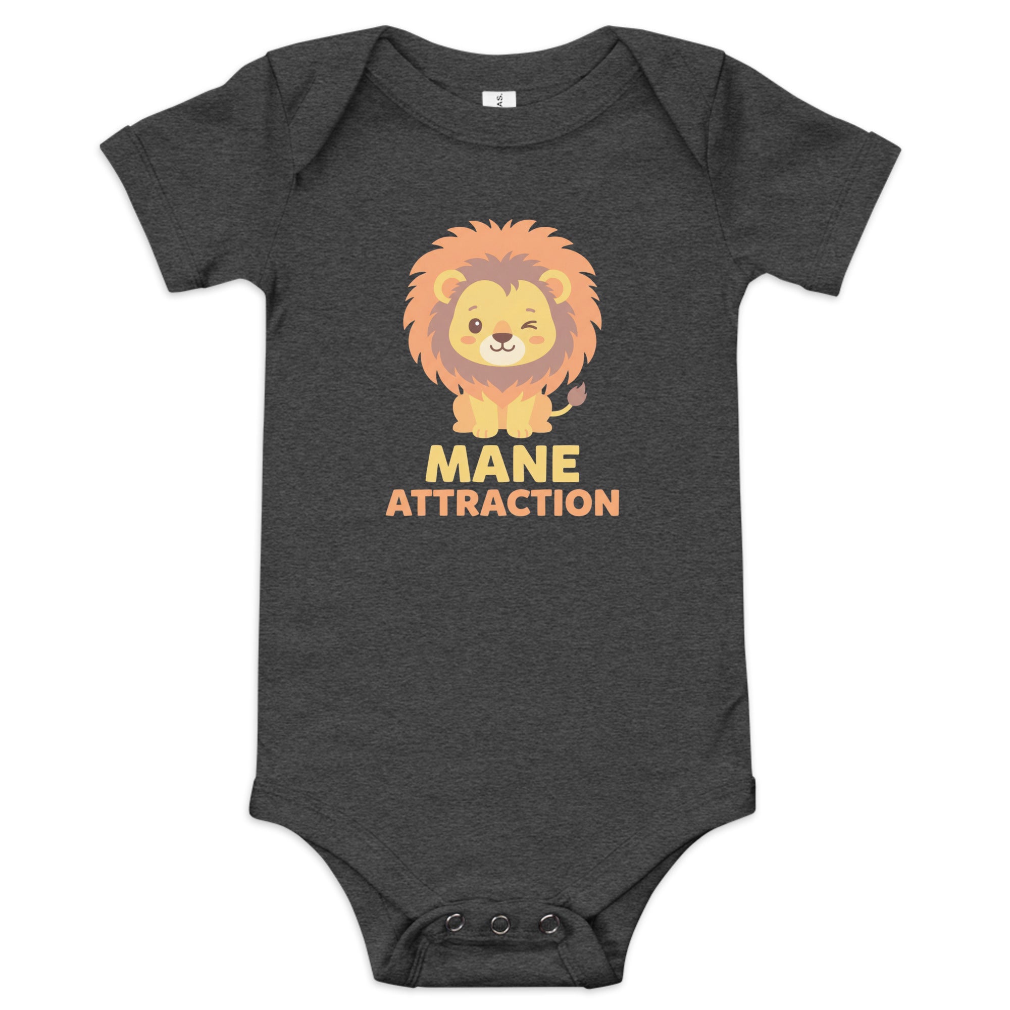 • Print/Design: A cute, winking baby lion cub graphic with the text 'MANE ATTRACTION' in orange and peach colors.