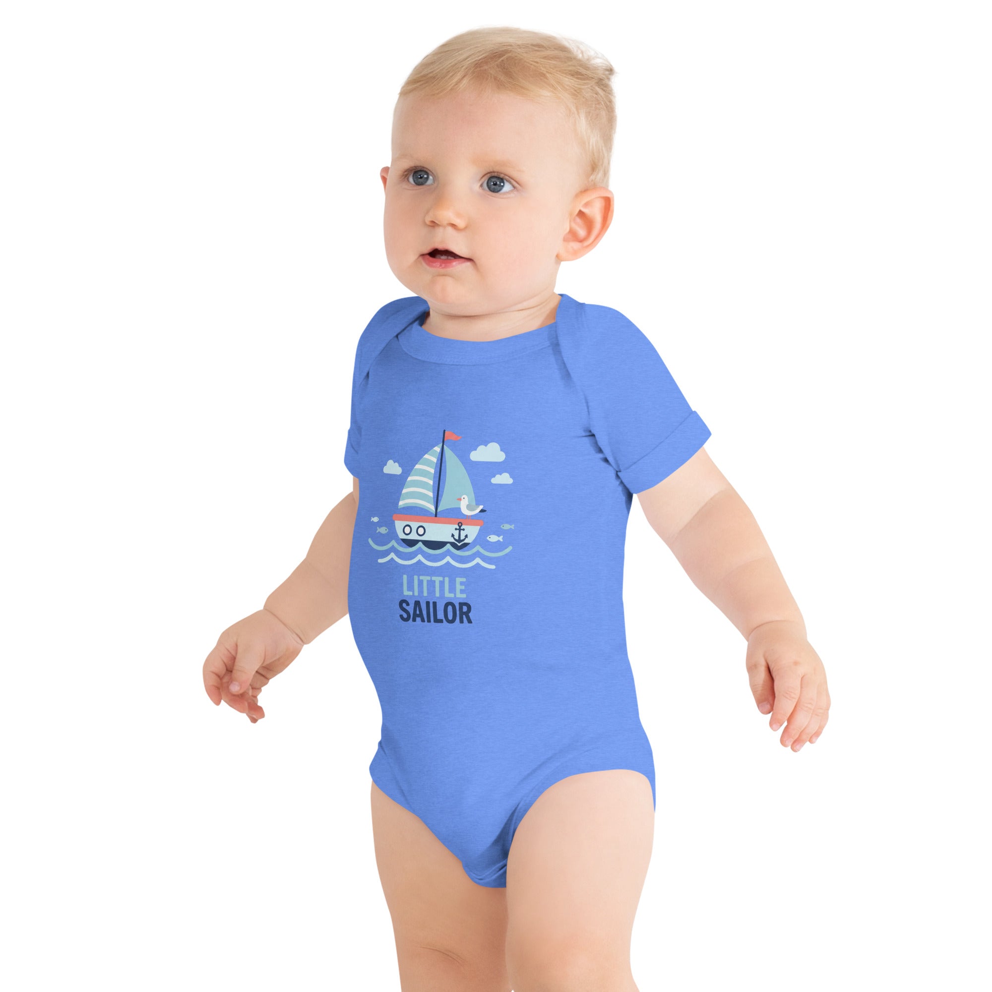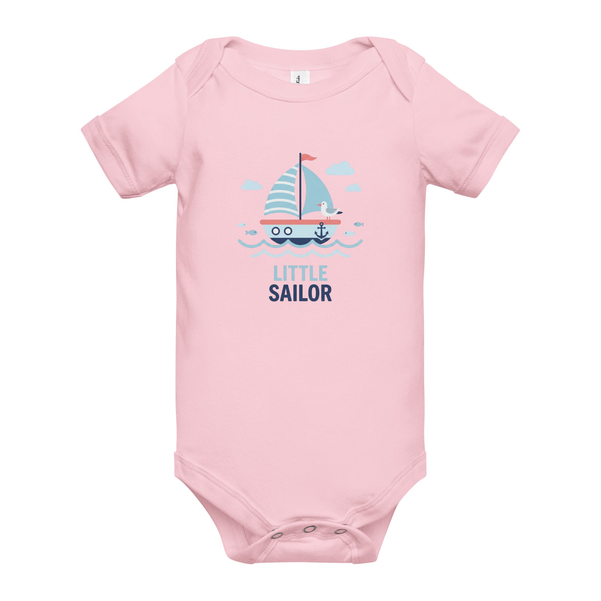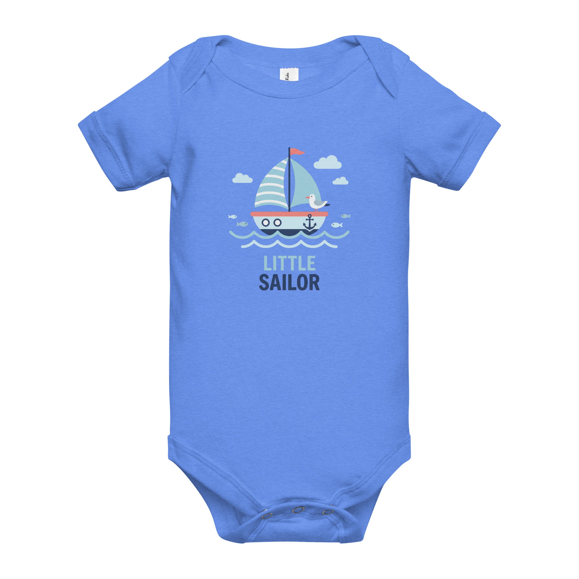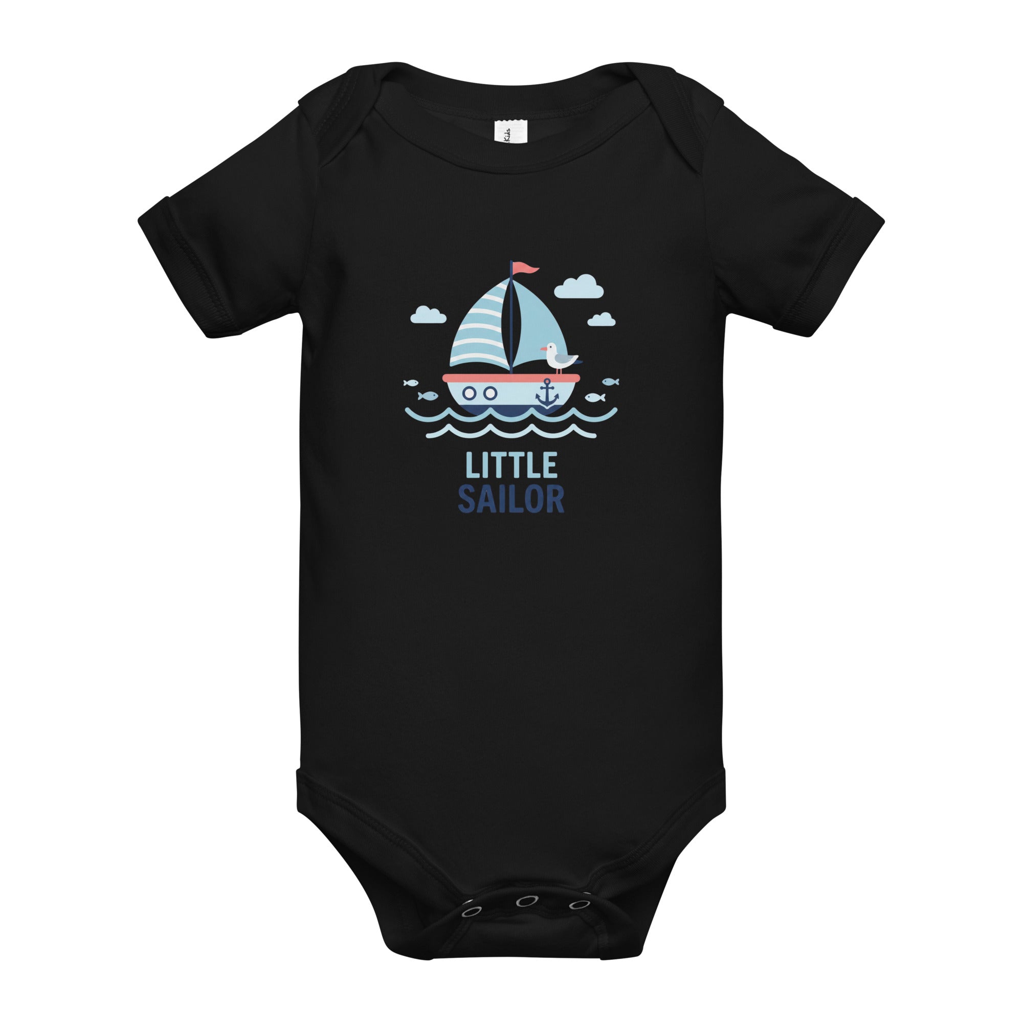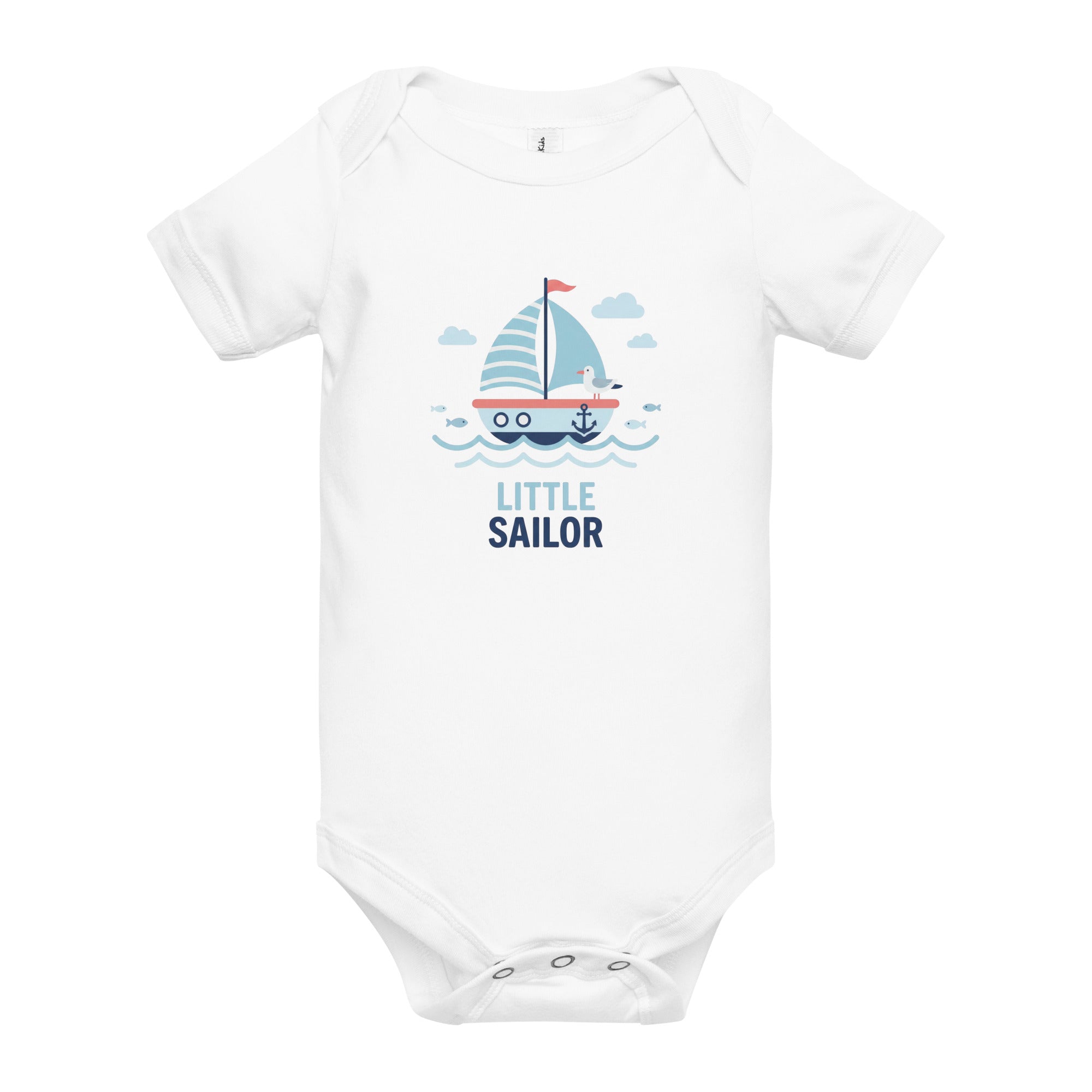 A charming nautical-themed graphic featuring a blue and white striped sailboat with a red flag, an anchor, and a cute seagull sets a delightful scene. Light blue waves, fish, and clouds complete the serene ocean illustration, while the words 'LITTLE SAILOR' are boldly printed below in dark blue. This adorable design brings a sense of adventure to your little one's wardrobe, perfect for playdates or seaside strolls. Crafted for comfort and easy movement, it's an ideal Baby Short Sleeve One Piece for everyday wear.