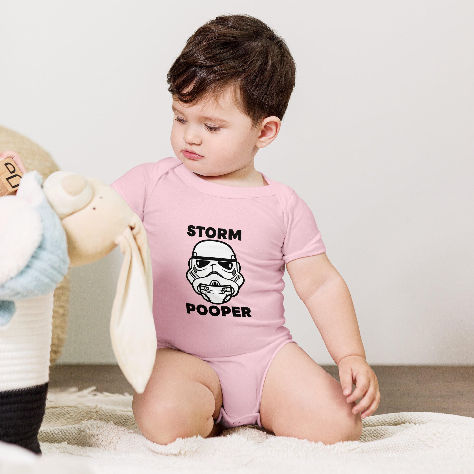 This hilarious baby one-piece features a playful graphic of a Stormtrooper helmet with a diaper humorously replacing its lower section. The bold black text 'STORM' appears above the helmet, and 'POOPER' below it, creating a fun, Star Wars-inspired pun for your little one. Made for comfort and easy movement, this one-piece is perfect for everyday adventures. Dress your baby in this soft and comfortable Baby Short Sleeve One Piece.