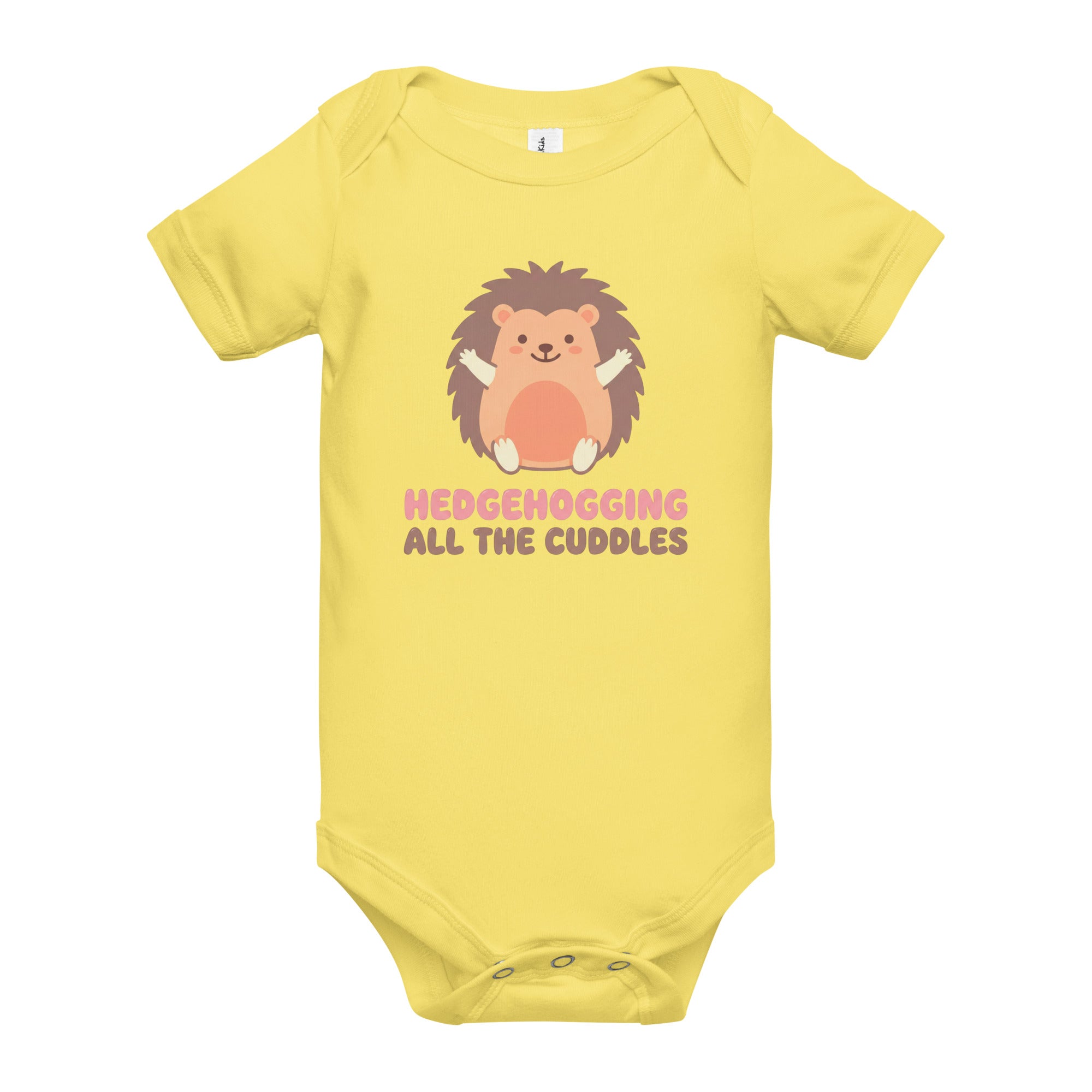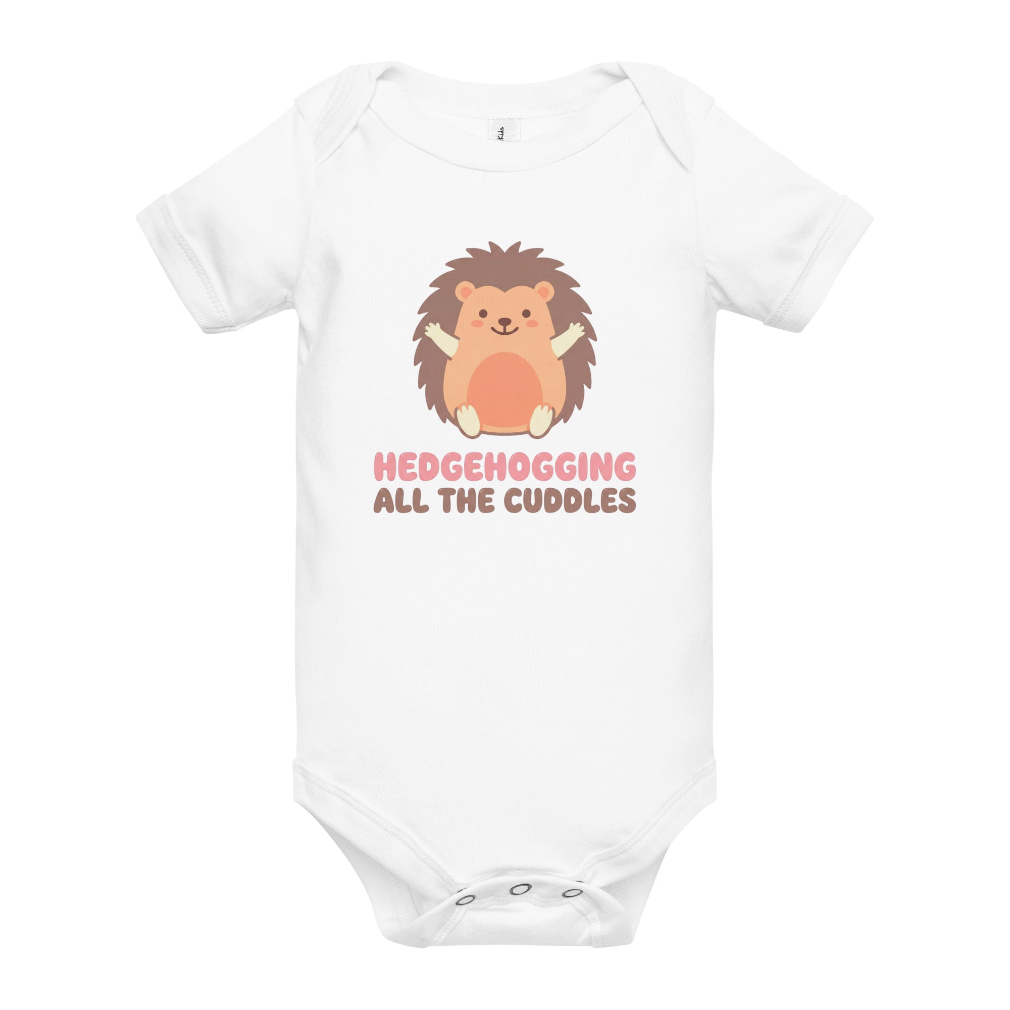Celebrate warmth and affection with this adorable baby one-piece, featuring a sweet illustrated hedgehog in brown and peach with pink rosy cheeks, ready for hugs. The playful text 'HEDGEHOGGING ALL THE CUDDLES' is printed below in soft pink and brown, adding a charming touch. This design captures a heartwarming and gentle mood, perfect for little ones. Designed for the ultimate comfort of your little one, this baby short sleeve one piece is ideal for daily wear, playdates, or special snuggles. Its soft fabric ensures gentle contact with delicate skin, providing freedom of movement for all their adventures, big or small. Enjoy easy dressing and changing with this comfortable Baby Short Sleeve One Piece.