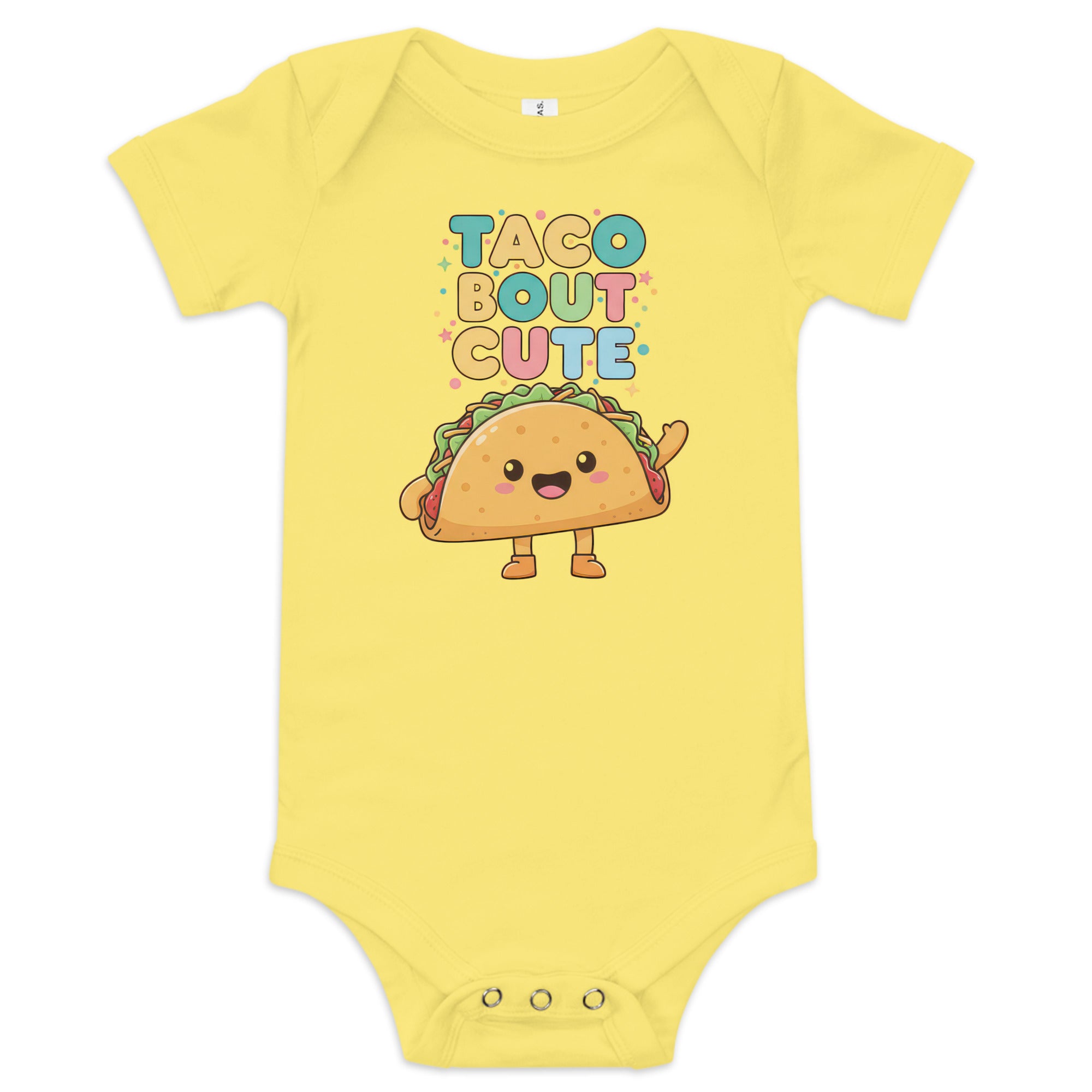 The design features a cheerful, smiling taco character with outstretched arms and feet, accompanied by the playful text 'TACO BOUT CUTE' in pastel blue, pink, yellow, and green block letters, highlighted with small stars and dots. This adorable one-piece is perfect for bringing a touch of whimsical cuteness to your baby's wardrobe. Its soft fabric ensures comfort for daily adventures, playtime, or simply relaxing. This charming Baby Short Sleeve One Piece is designed for both style and ease of wear.