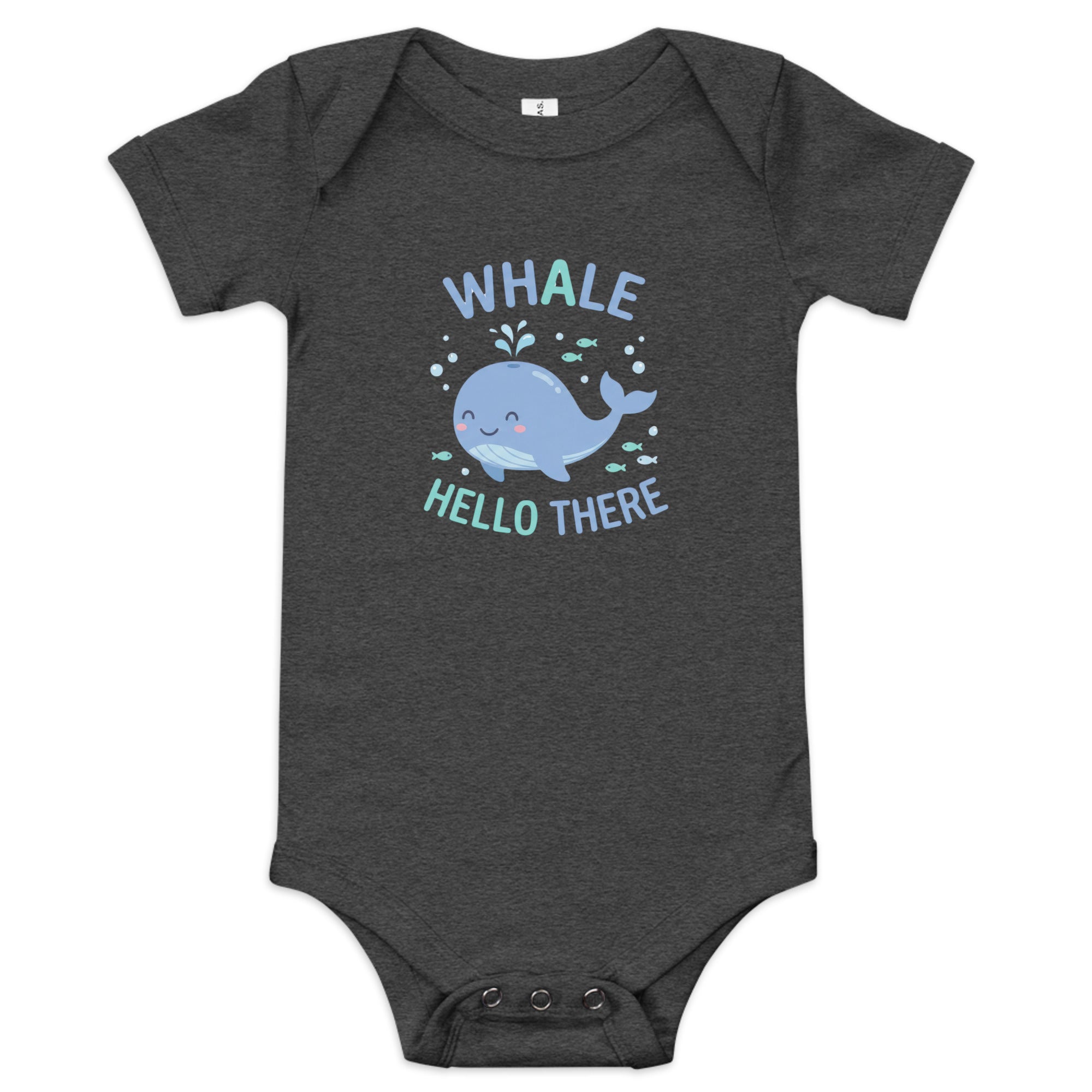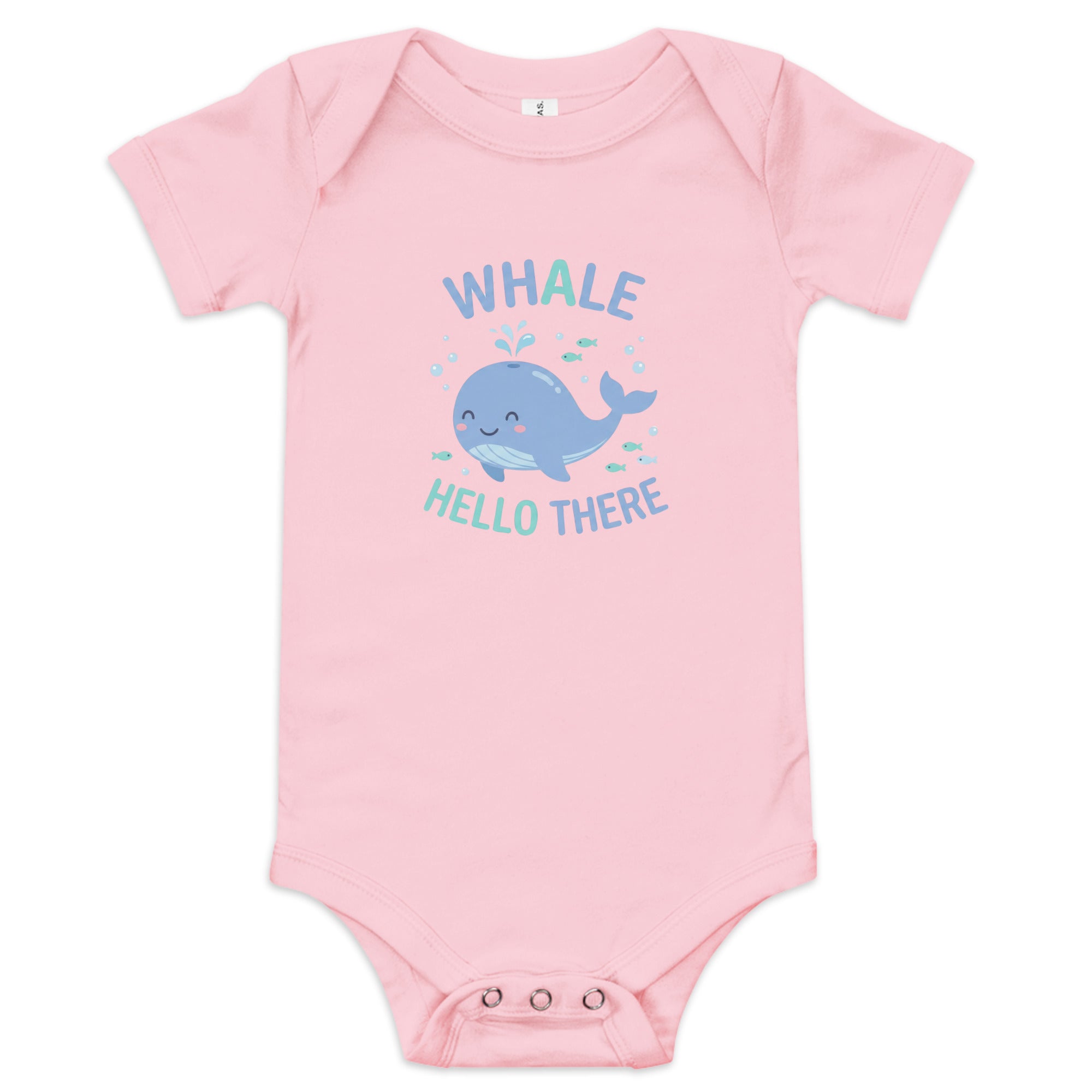 Introduce your little one to the world with our charming one-piece, featuring a friendly blue whale spouting water, surrounded by whimsical bubbles and tiny fish. The design is accented with the playful text 'WHALE' in a lovely blue-to-teal gradient and 'HELLO THERE' in a matching light blue. This adorable design brings a cheerful, inviting mood to your baby's wardrobe. Experience supreme comfort and charming style with this delightful Baby Short Sleeve One Piece.
