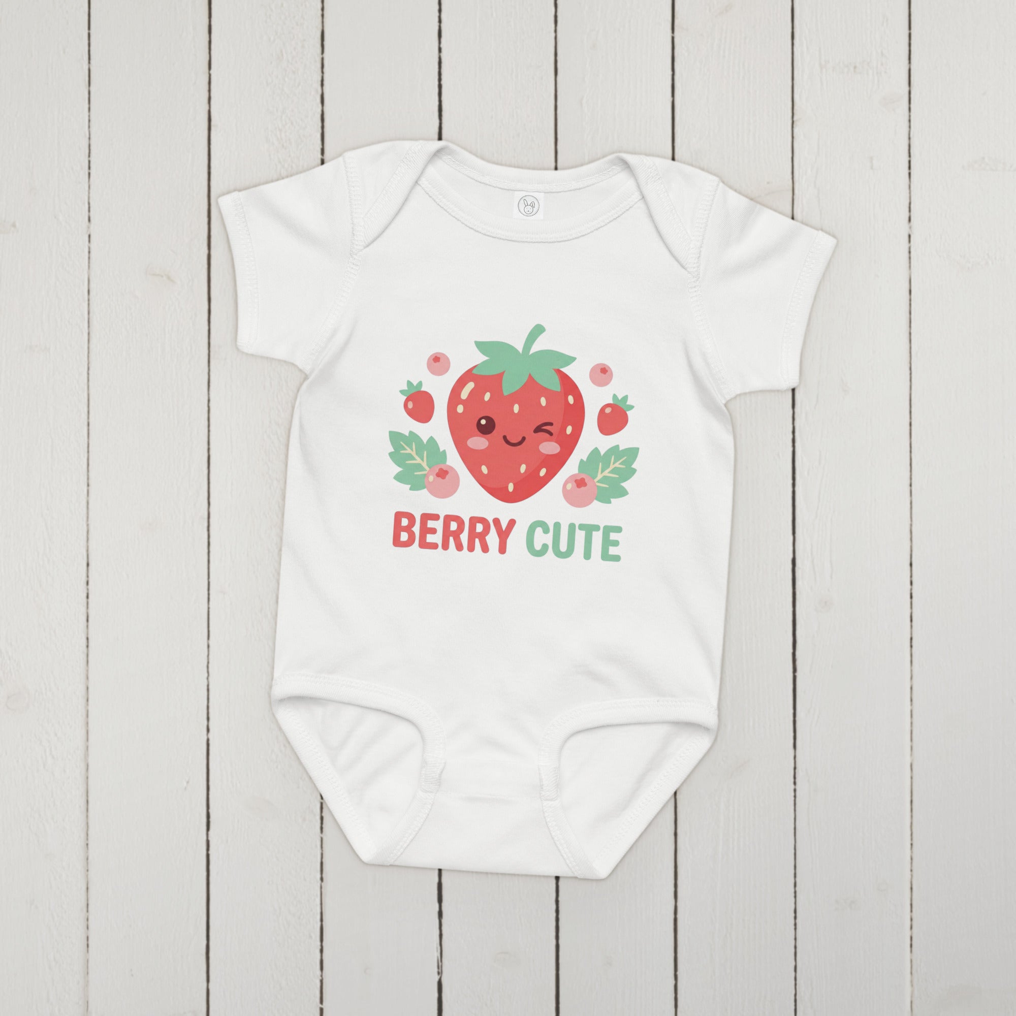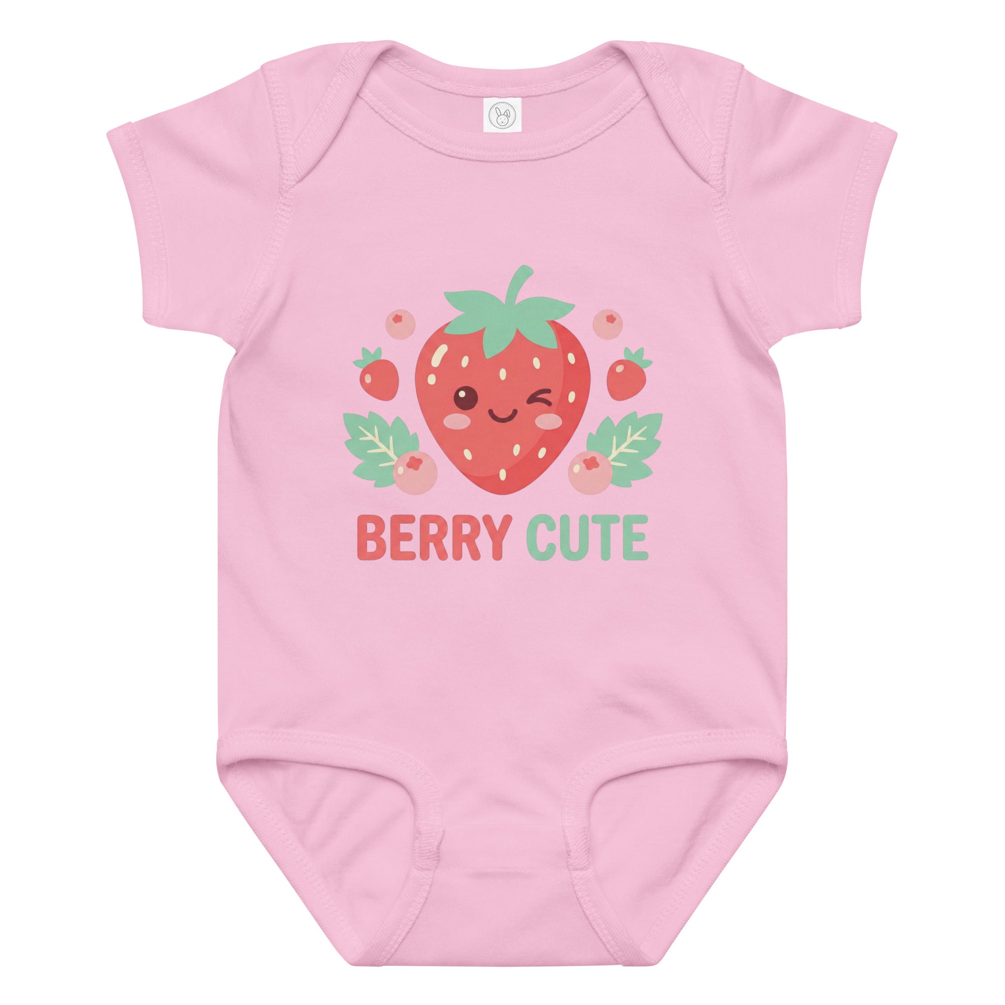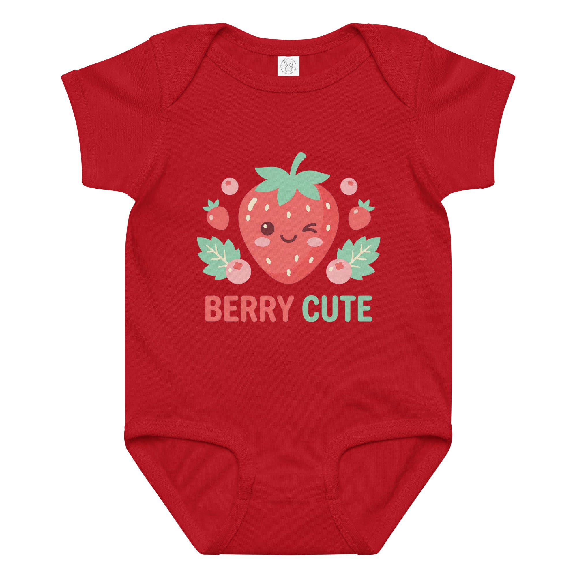 Celebrate sweetness with this adorable baby jersey bodysuit featuring a cheerful, winking strawberry illustration surrounded by smaller berries and delicate leaves. Below the vibrant graphic, the playful phrase 'BERRY CUTE' is printed in coordinating red and green hues, adding an extra touch of charm. This comfortable garment is perfect for everyday wear, offering a soft feel for sensitive skin and easy movement for your little one. Designed for ultimate comfort and enduring style, this Baby Jersey Bodysuit is a delightful addition to any baby's wardrobe.