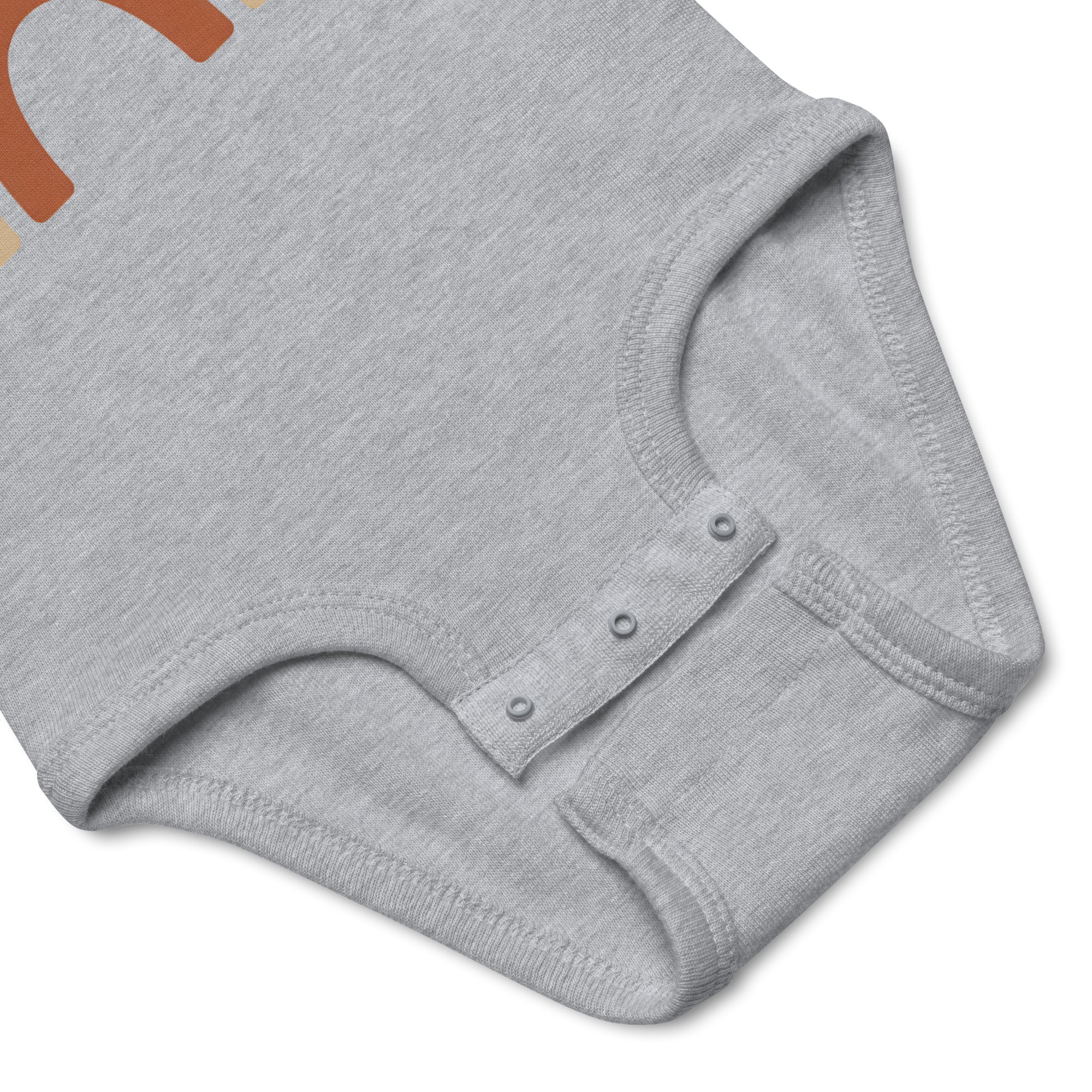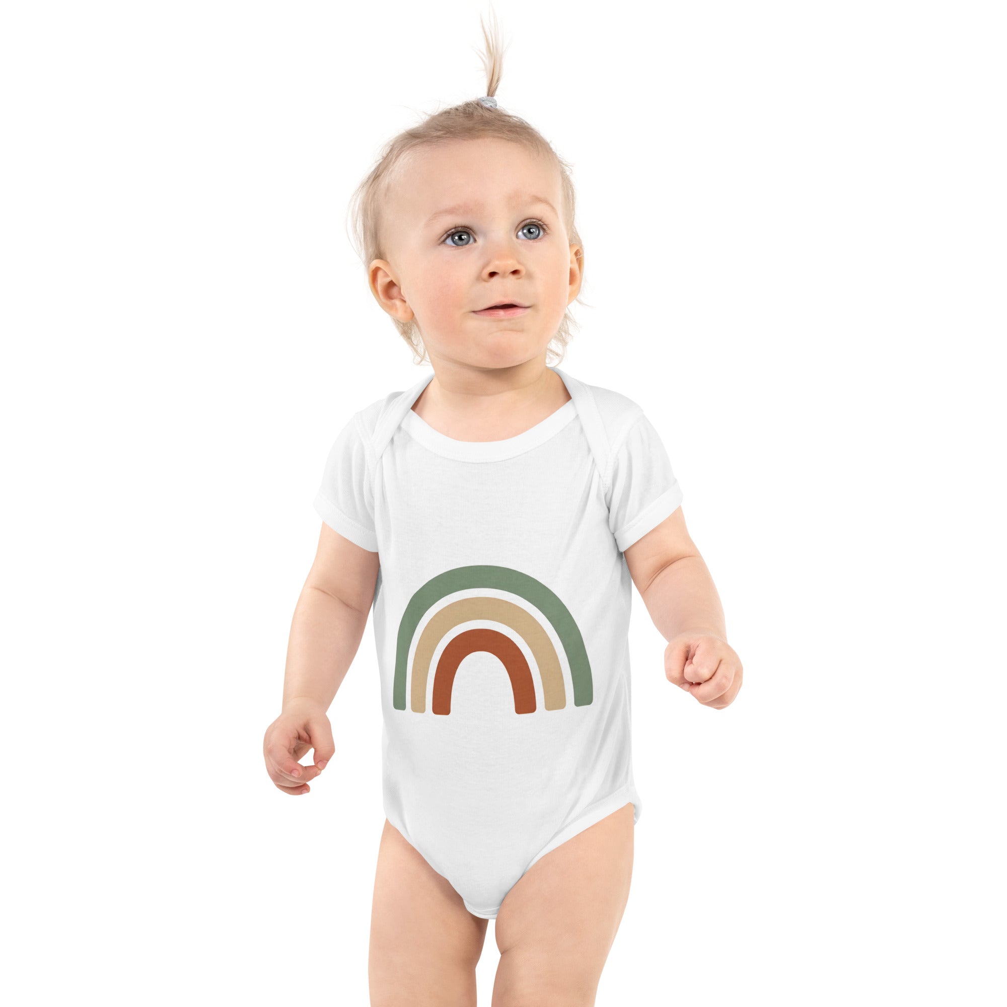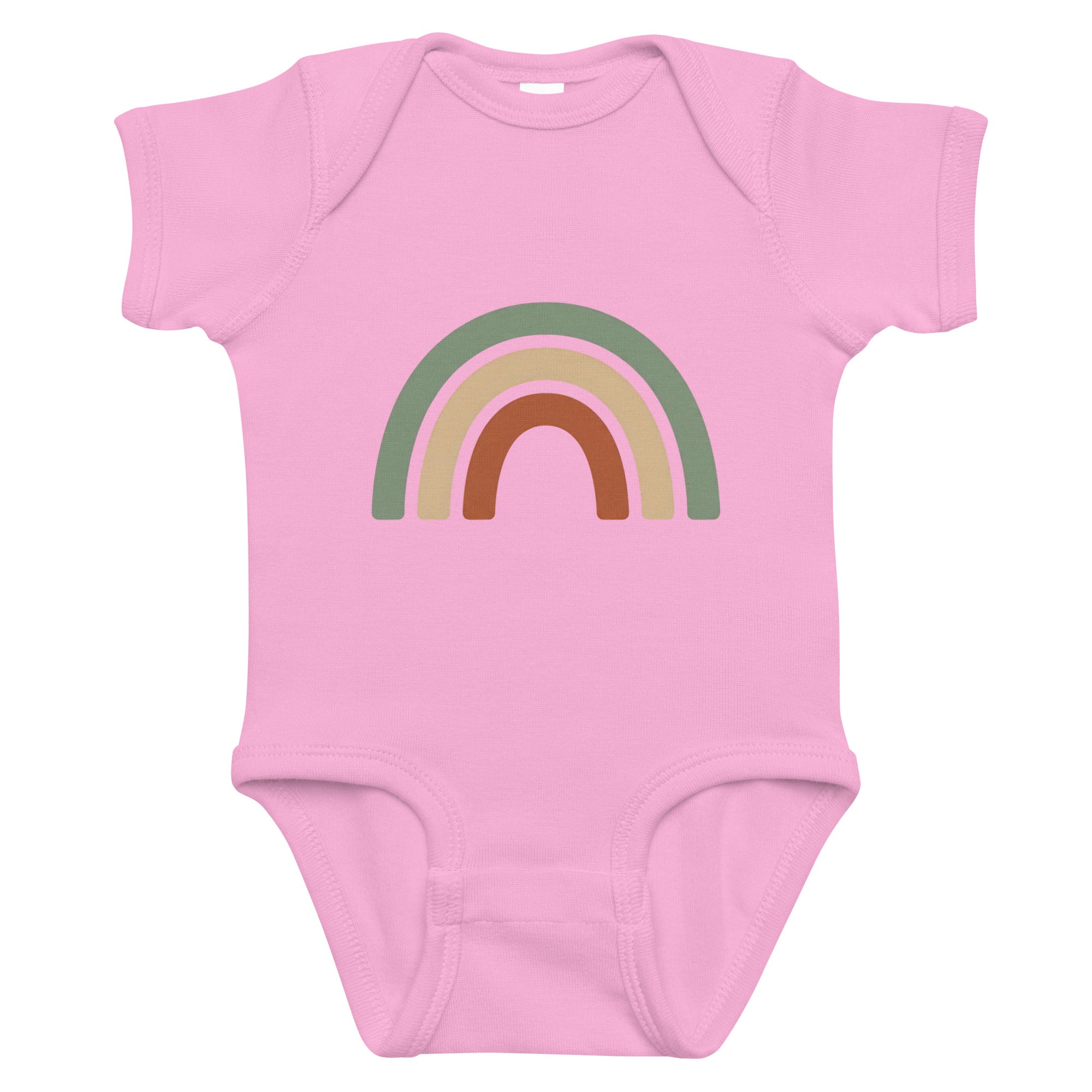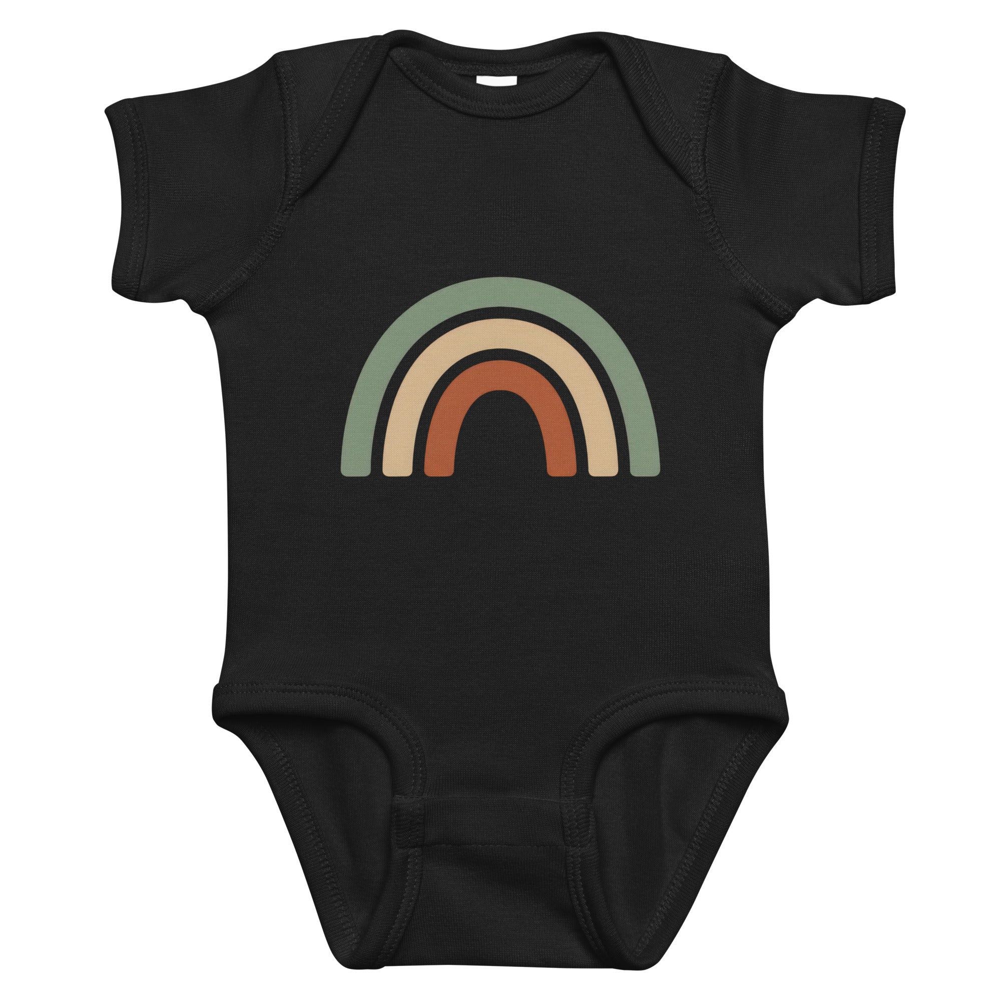 Featuring a charming three-arch rainbow graphic, this design showcases a soothing palette of sage green, muted tan, and burnt orange, perfect for a gentle and natural aesthetic. This simple yet eye-catching print brings a touch of calm to your little one's wardrobe. Crafted for everyday comfort, it's an ideal choice for playful days or cozy naps. Your baby will love the soft feel of this Baby Short Sleeve Bodysuit.