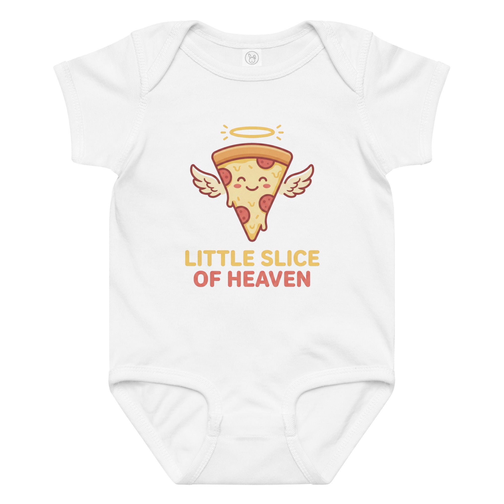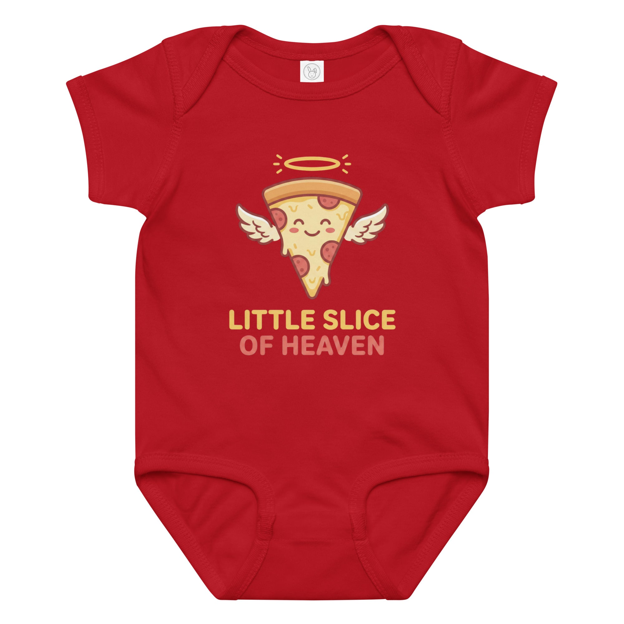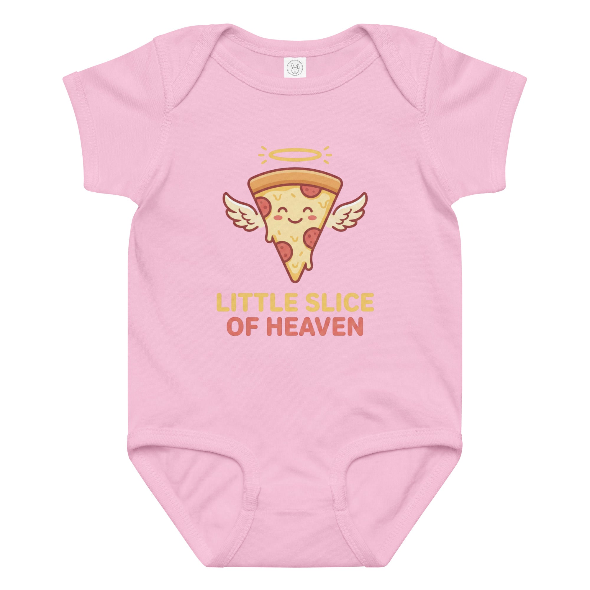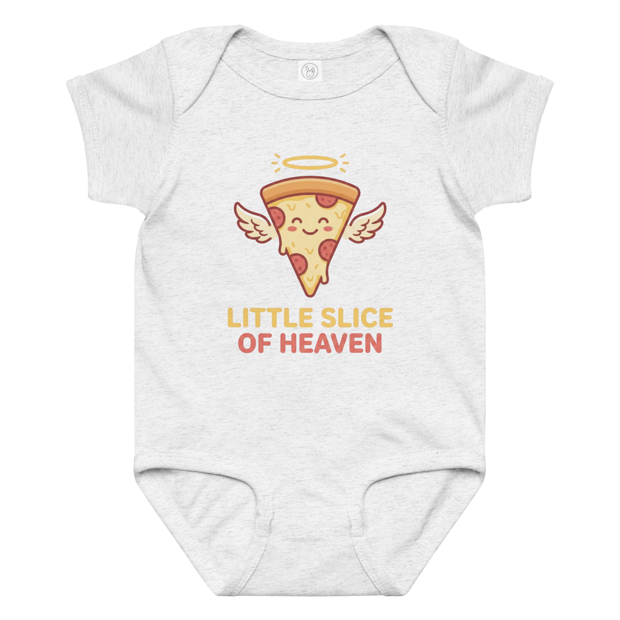 Wrap your little one in celestial cuteness with this adorable baby bodysuit, featuring a sweet, smiling pizza slice with tiny angel wings and a glowing halo. Below the charming graphic, the playful phrase 'LITTLE SLICE OF HEAVEN' is printed in warm orange and red hues, adding to its delightful appeal. This design combines whimsical imagery with a heartfelt message, making it a truly special piece. Enjoy premium comfort and fuss-free wear with this soft and durable Baby Jersey Bodysuit.