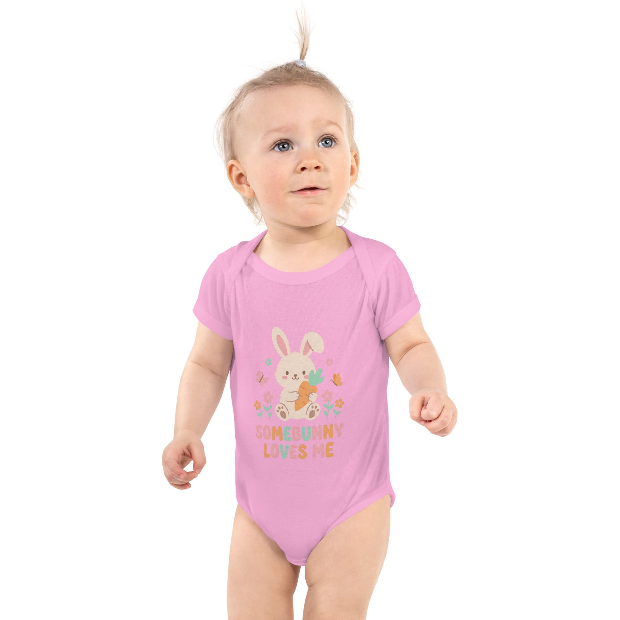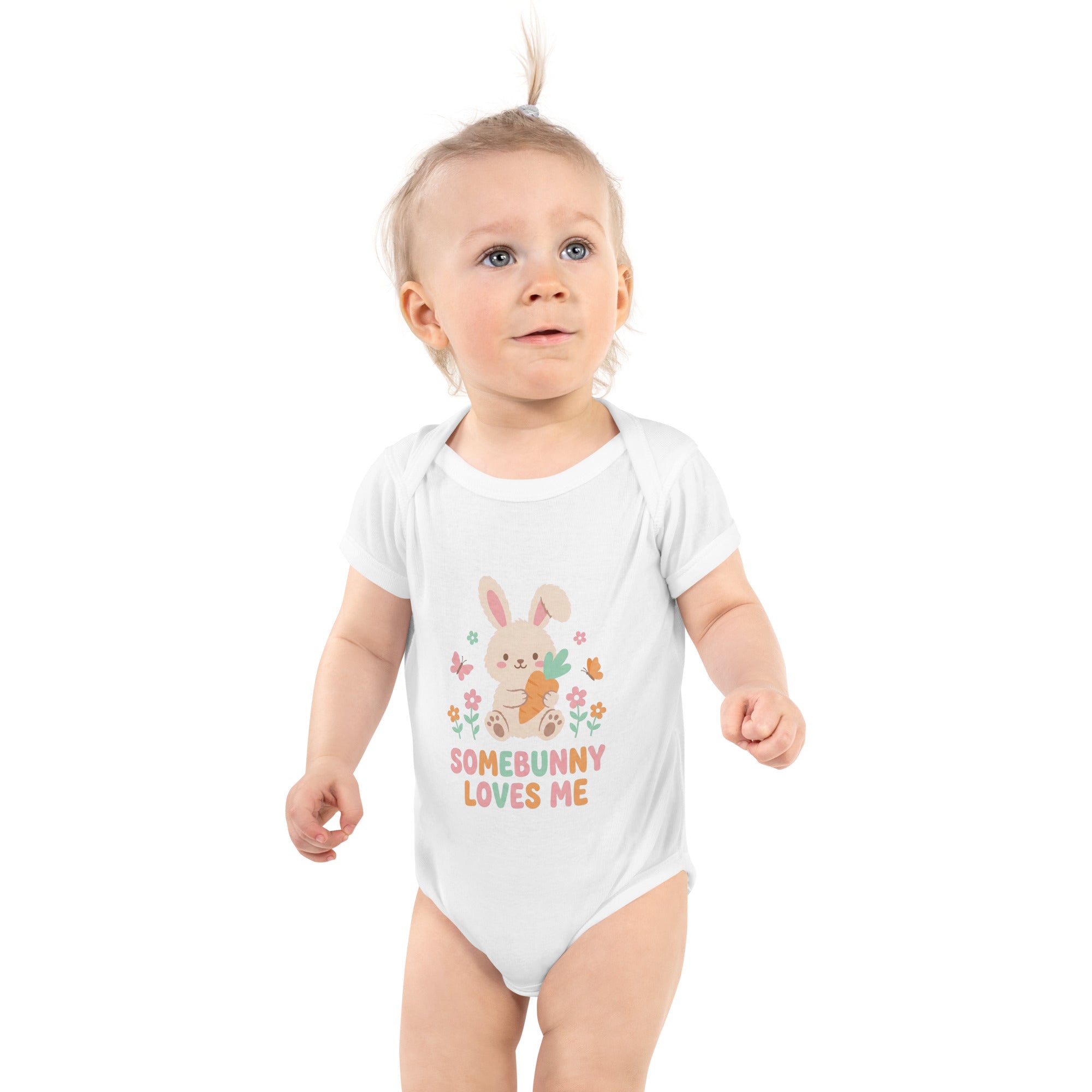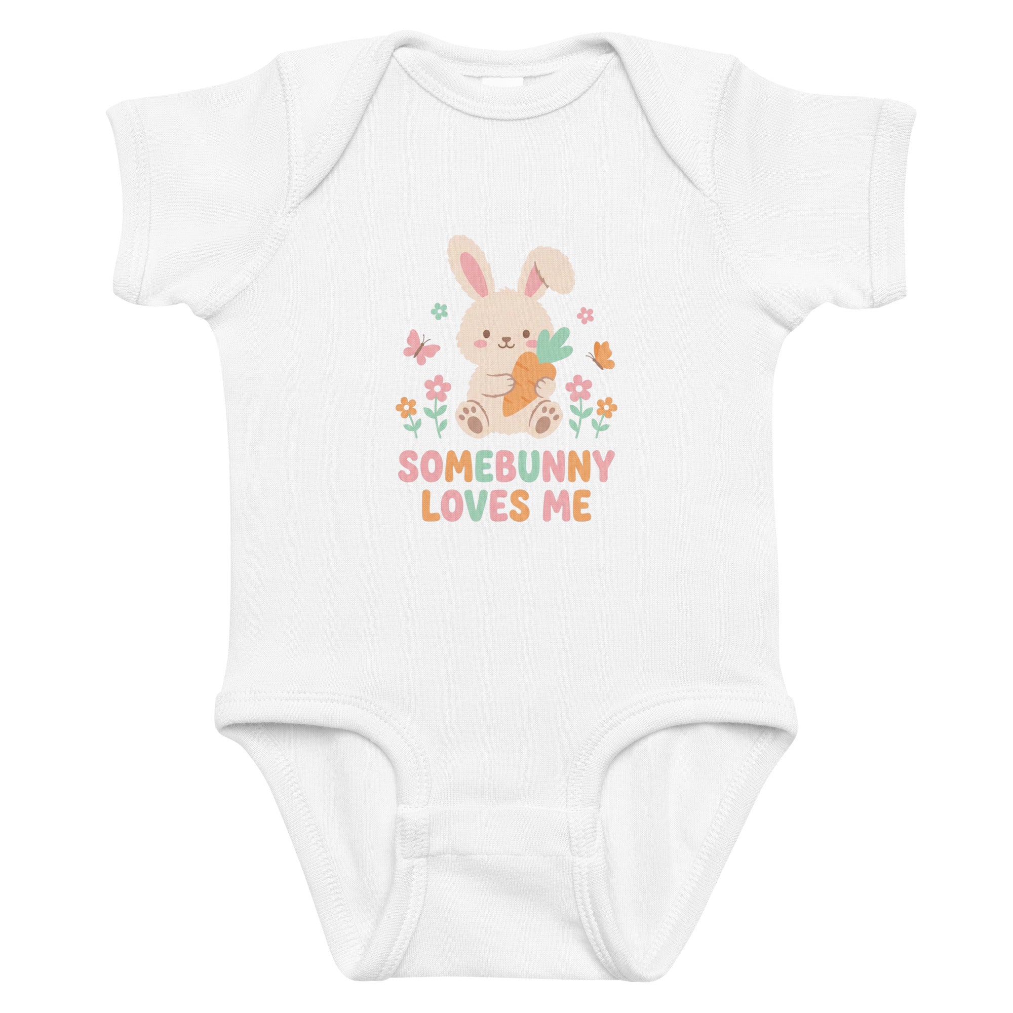 This adorable baby bodysuit features a sweet, fluffy light pink bunny holding a carrot, surrounded by charming pastel flowers and butterflies. Below the whimsical scene, the loving phrase 'SOMEBUNNY LOVES ME' is printed in playful pastel pink, light blue, and orange lettering. Perfect for everyday wear or as a thoughtful gift, this design brings warmth and joy. Crafted for softness and ease of movement, it's designed to keep your little one cozy in this Baby Short Sleeve Bodysuit.