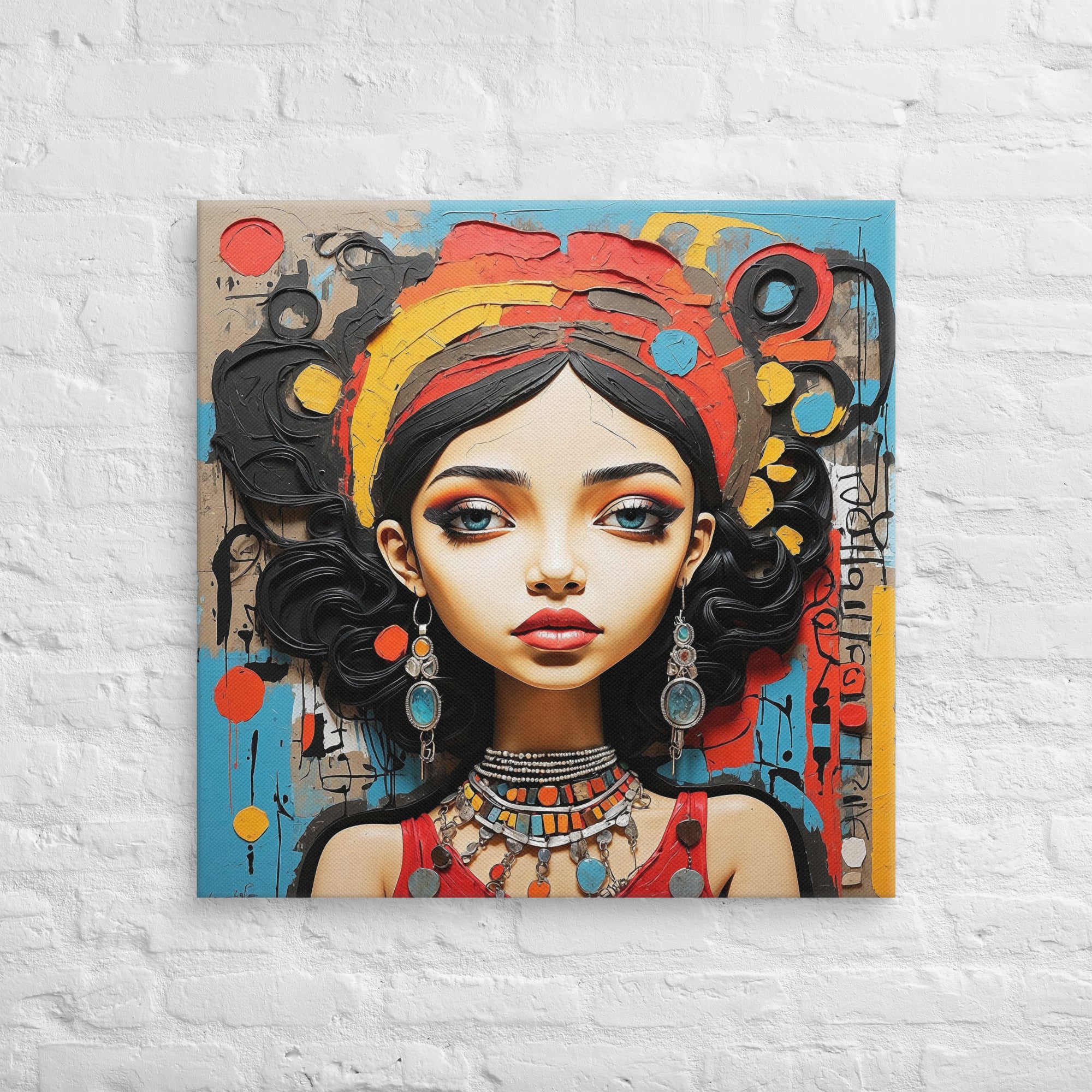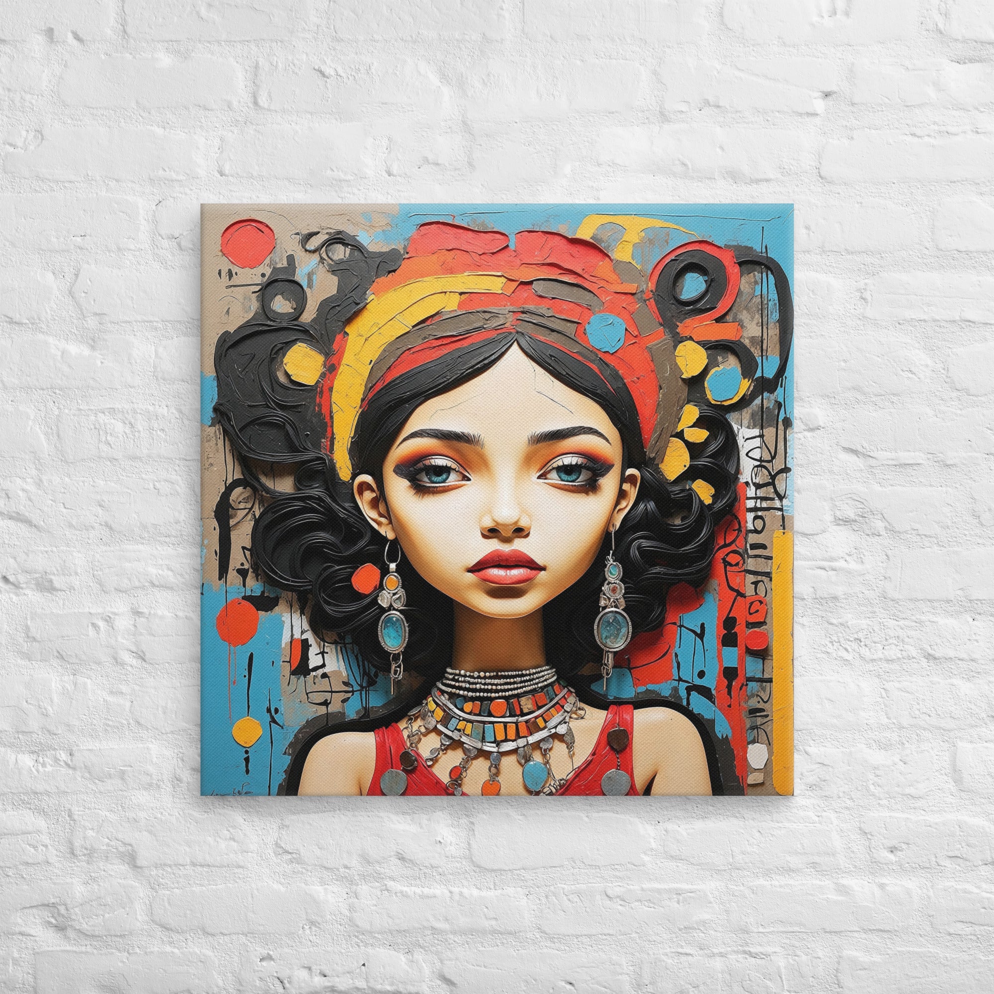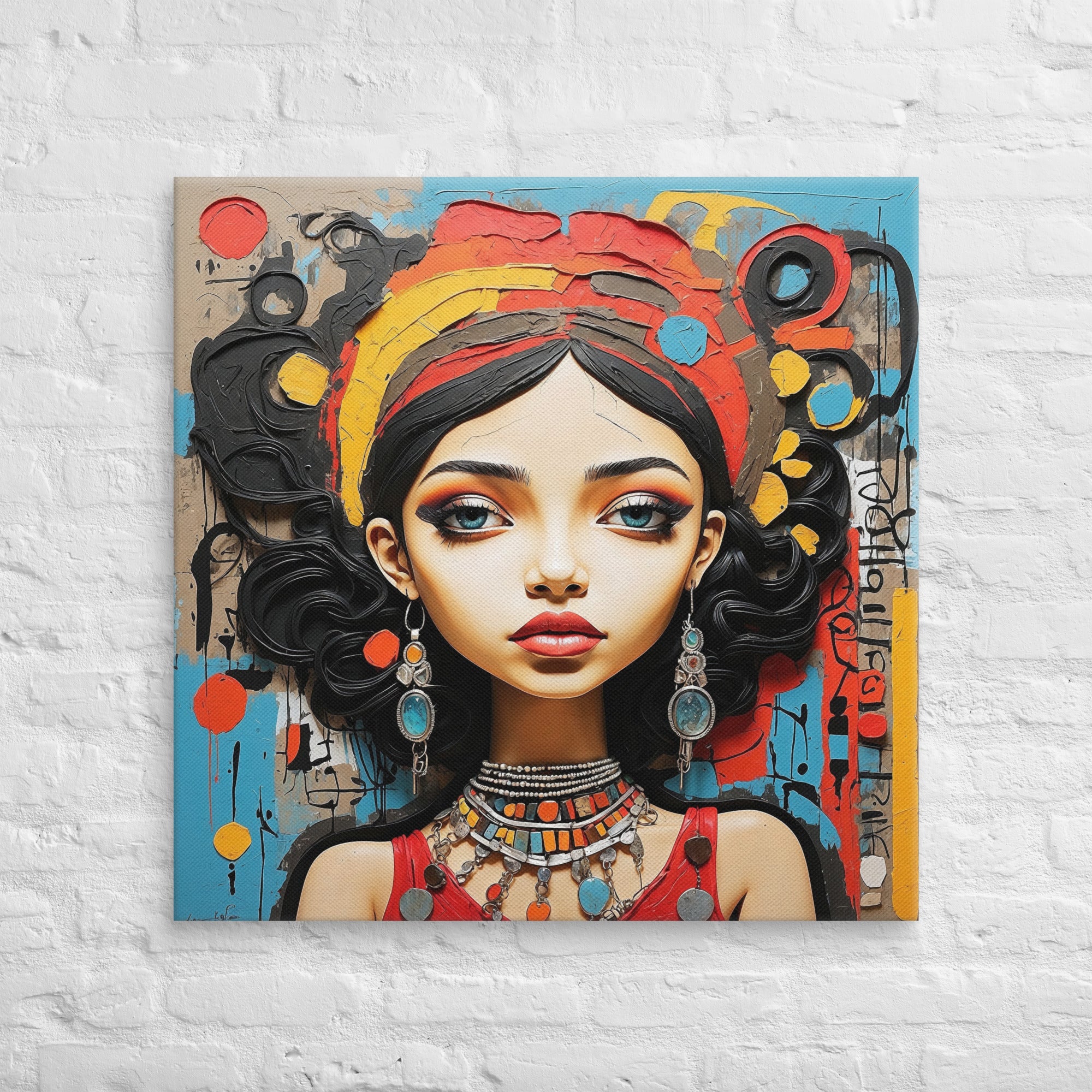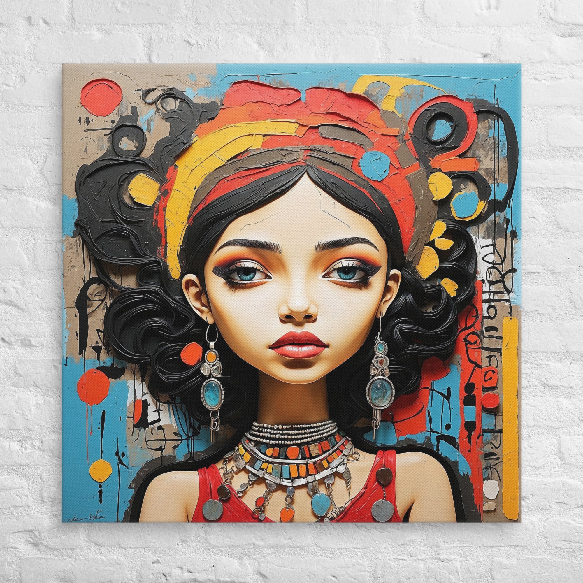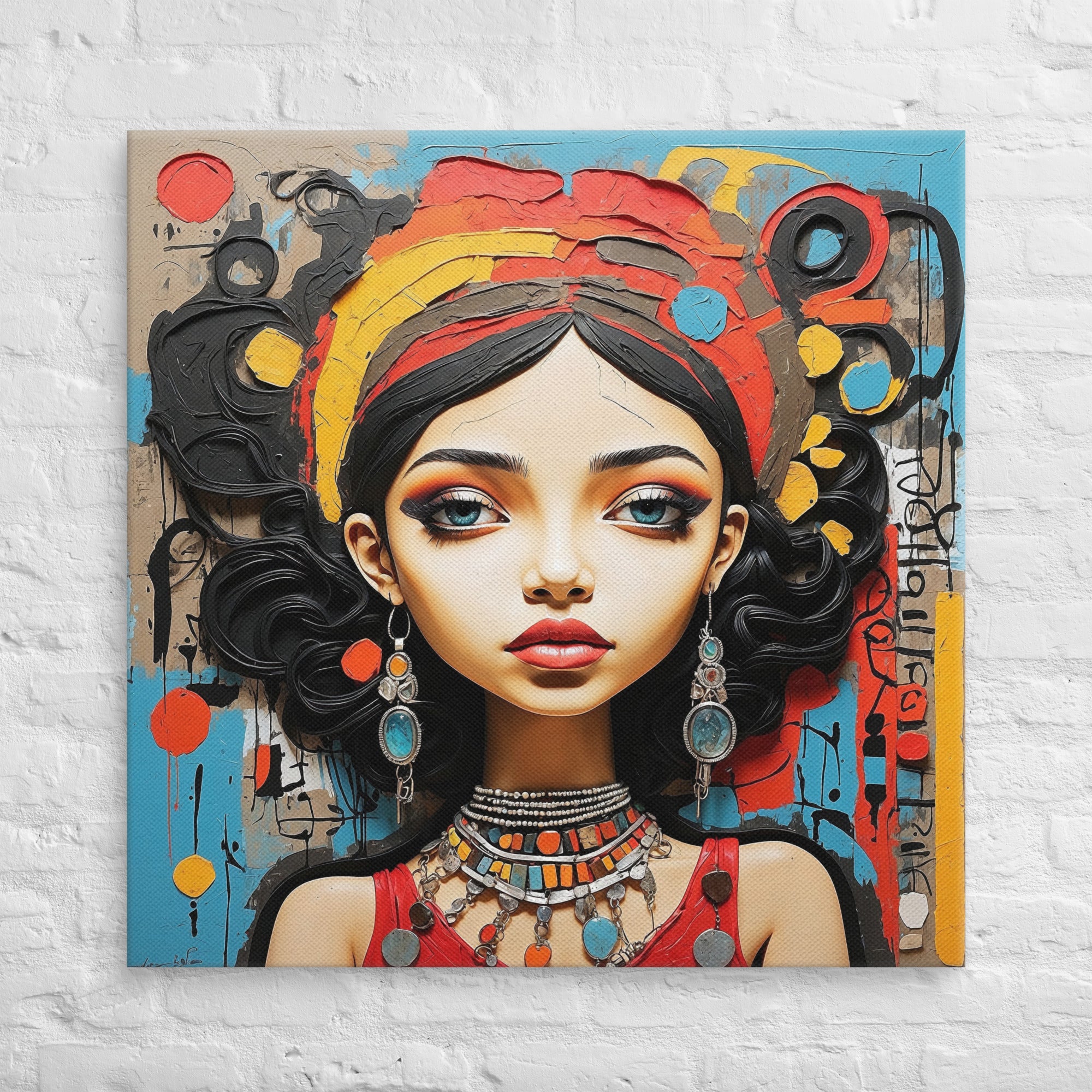 This captivating artwork portrays a striking woman adorned with colorful jewelry and intricate textures, set against an expressive abstract backdrop. Warm reds, turquoise, and ochre hues blend harmoniously, adding a sense of vibrancy and culture to any modern or boho-inspired room.