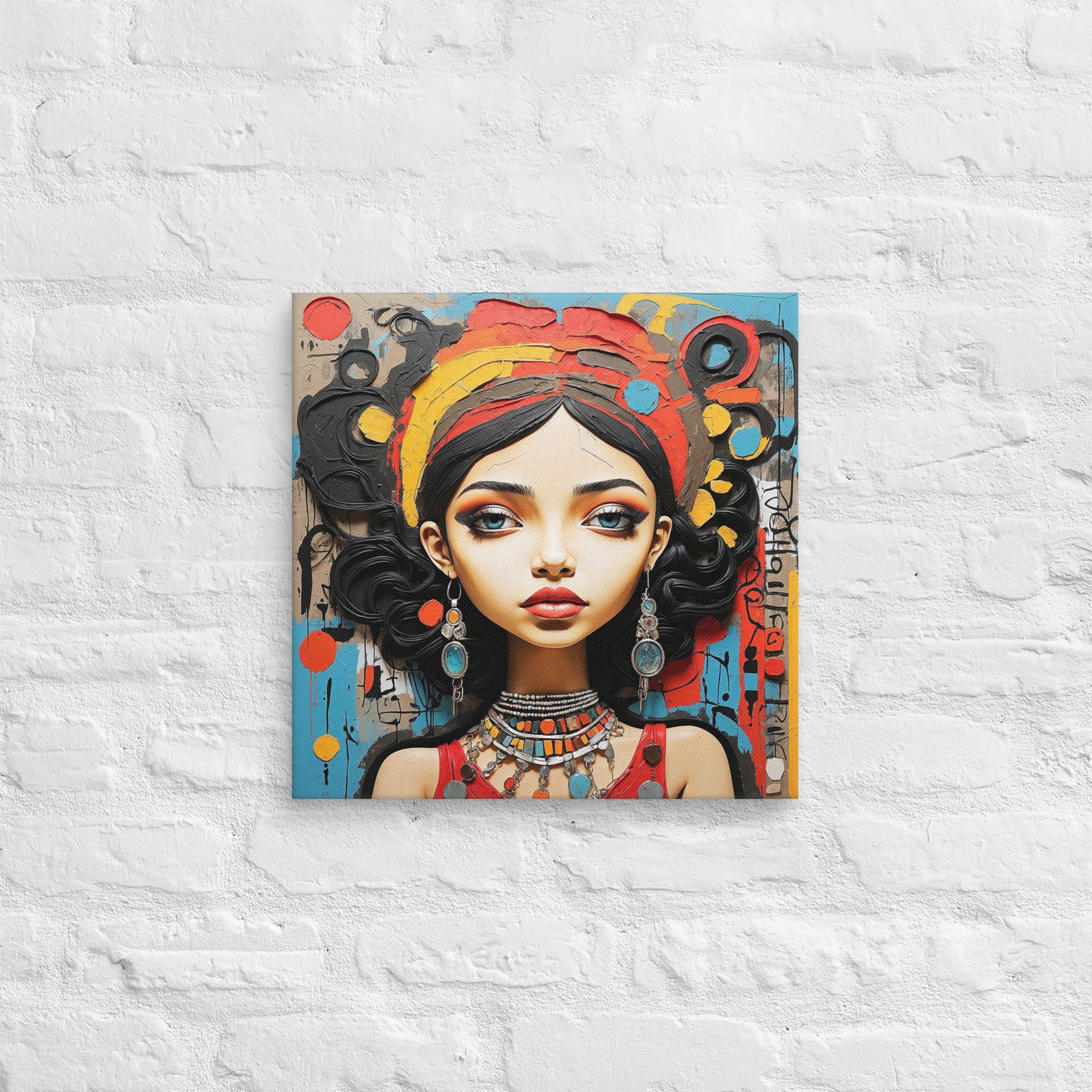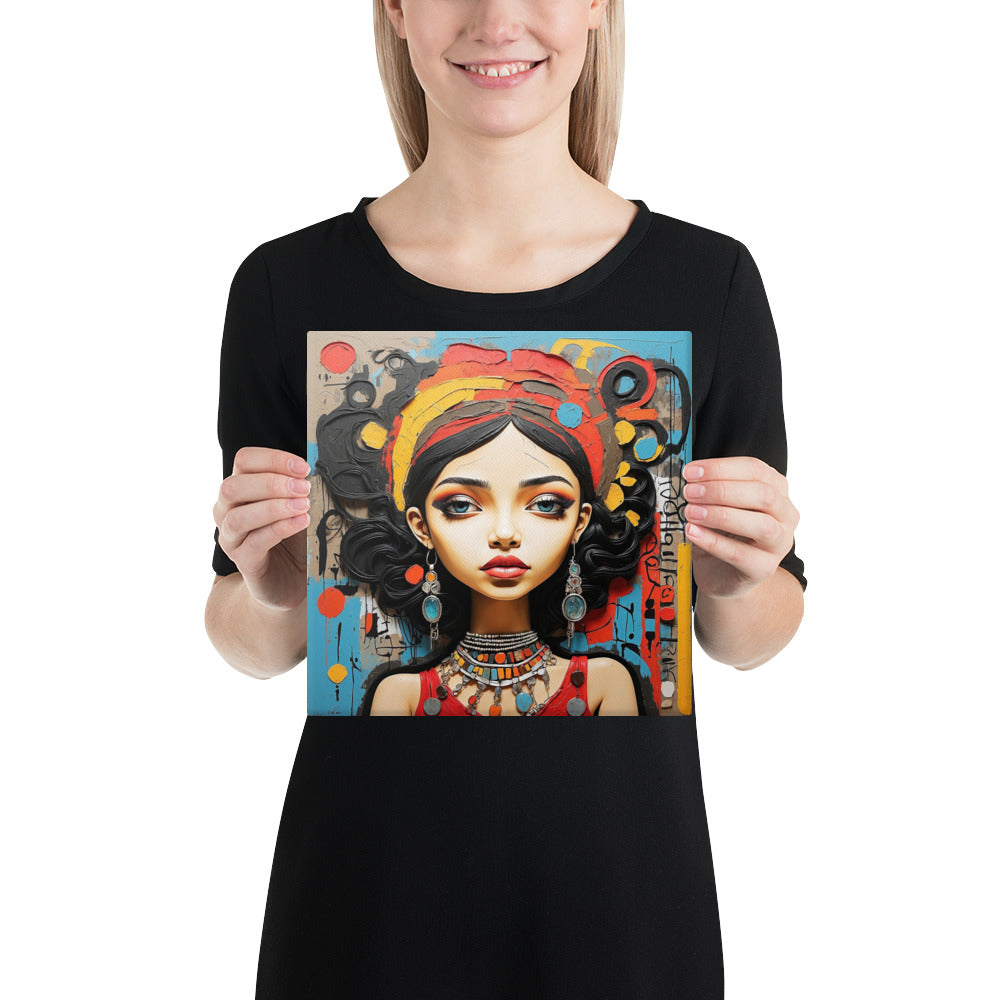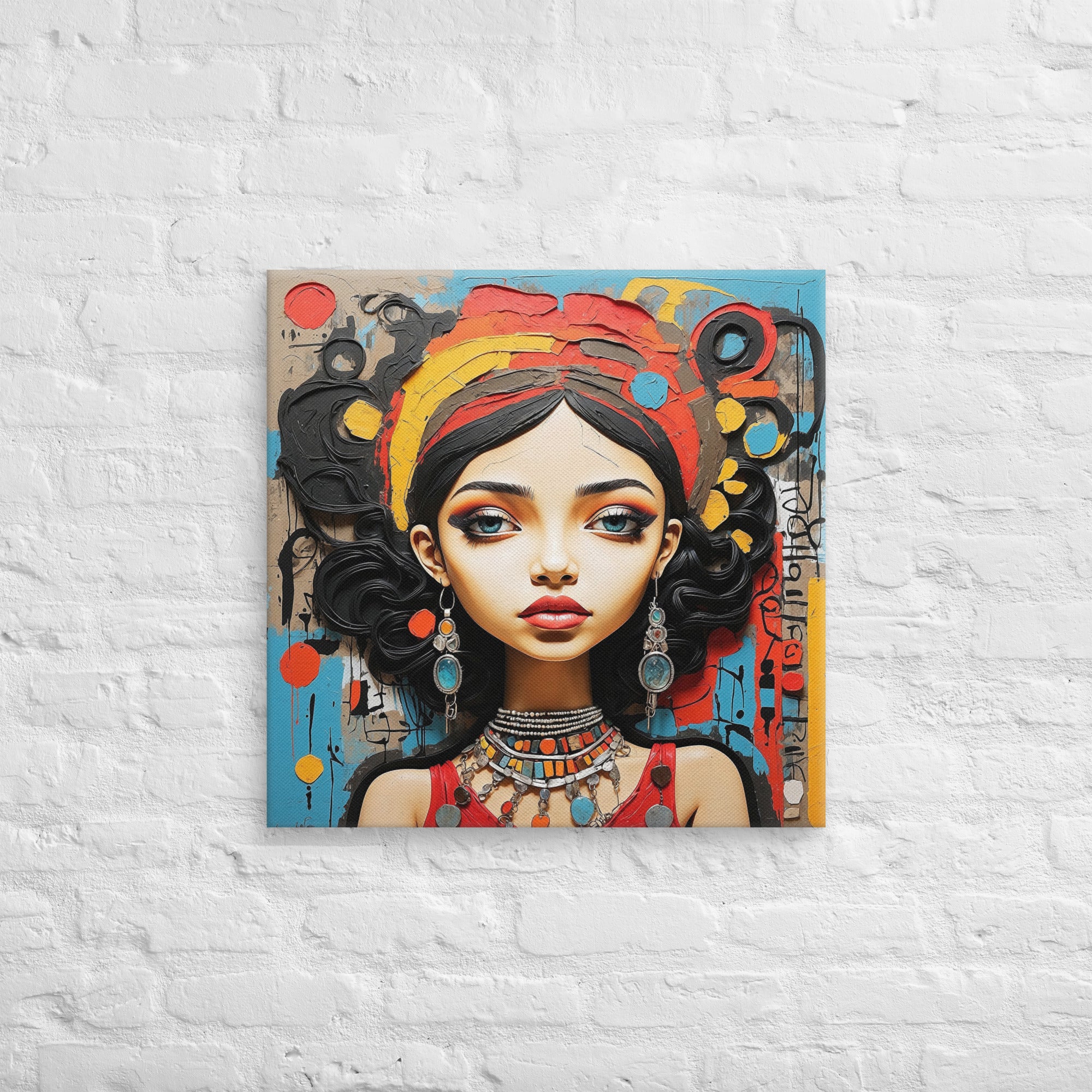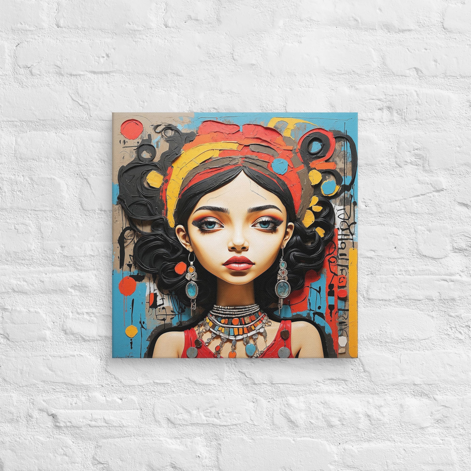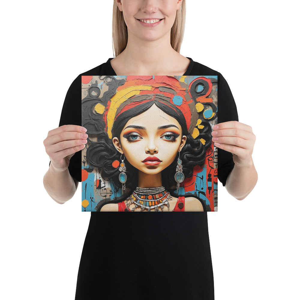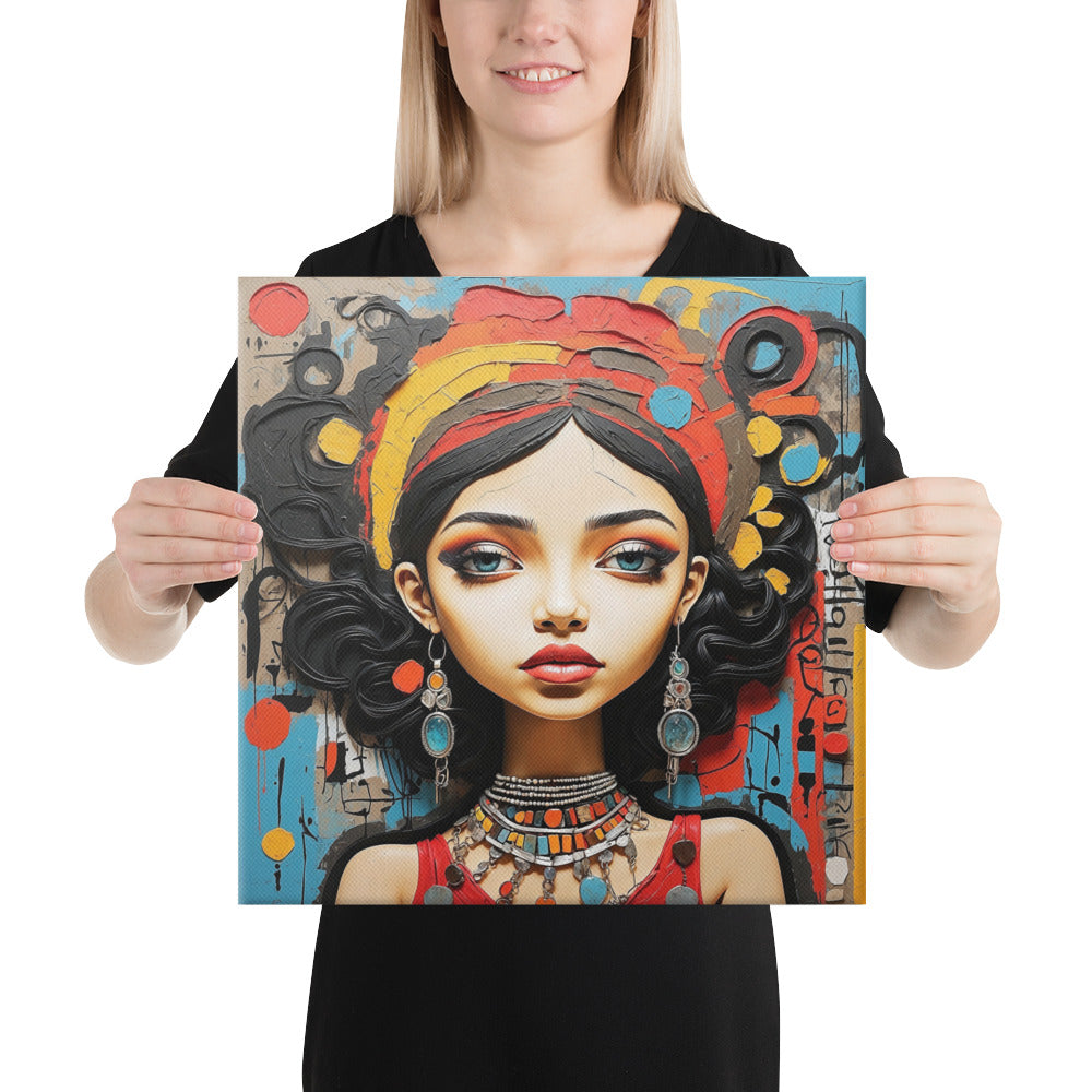 This captivating artwork portrays a striking woman adorned with colorful jewelry and intricate textures, set against an expressive abstract backdrop. Warm reds, turquoise, and ochre hues blend harmoniously, adding a sense of vibrancy and culture to any modern or boho-inspired room.
