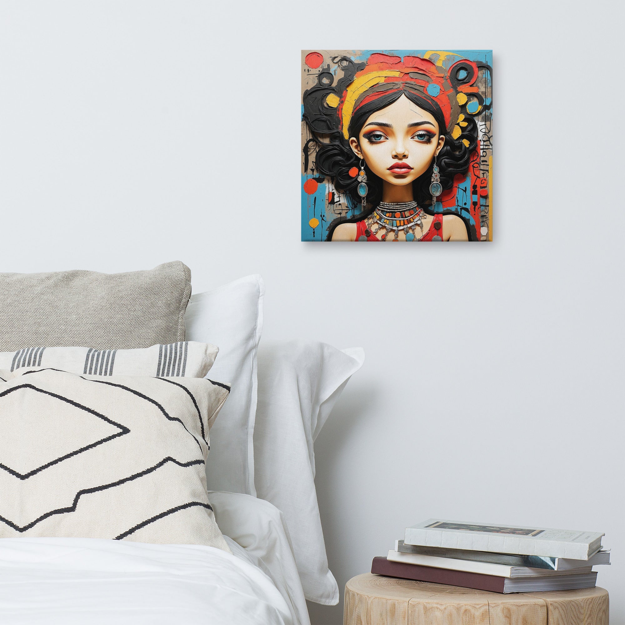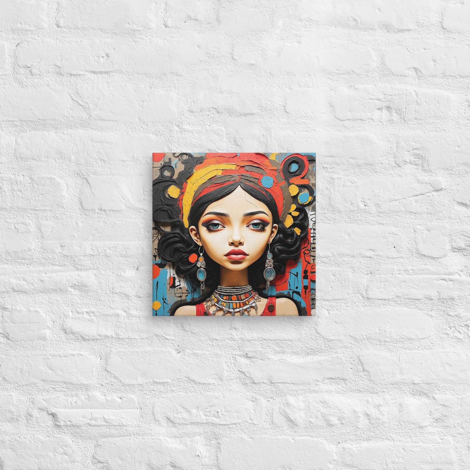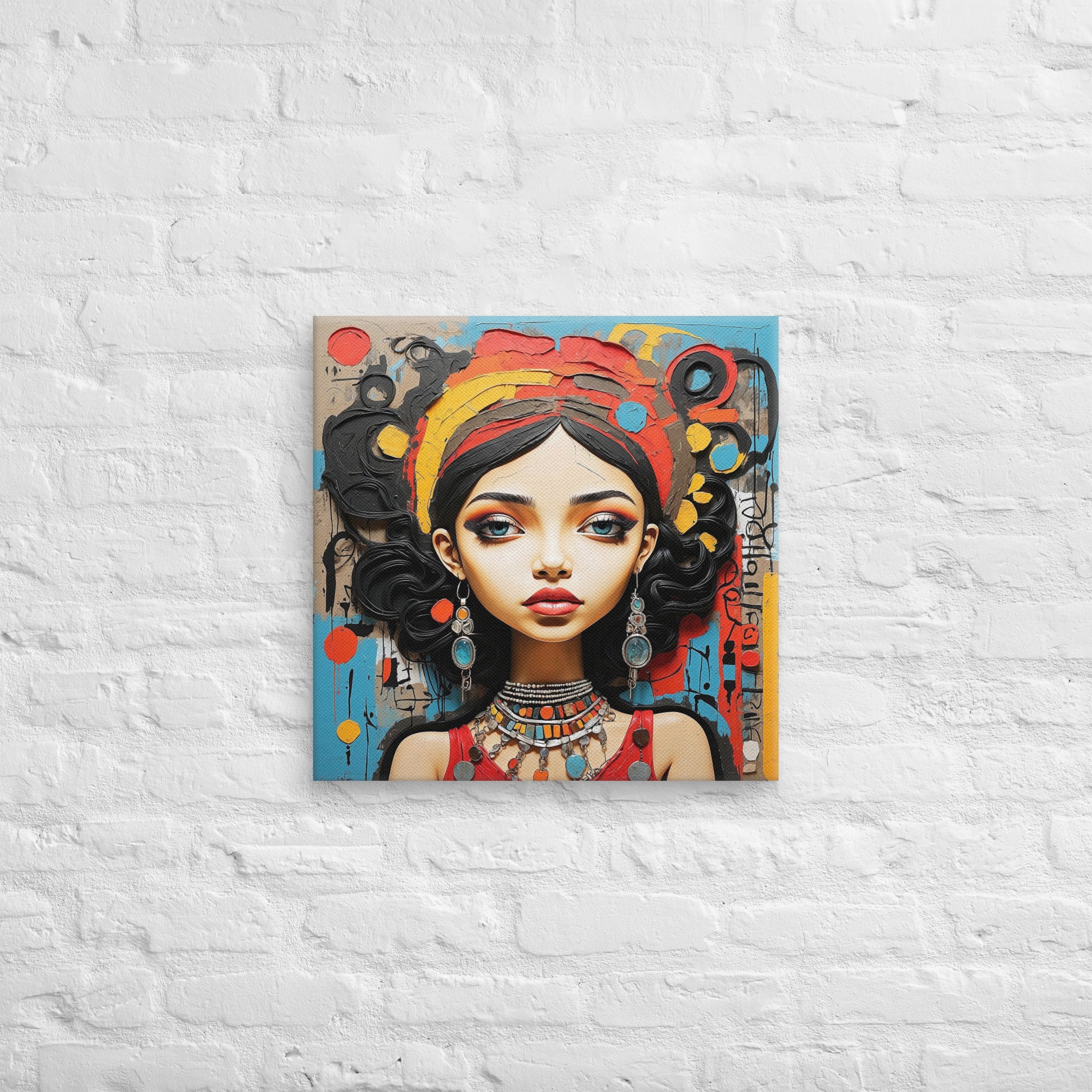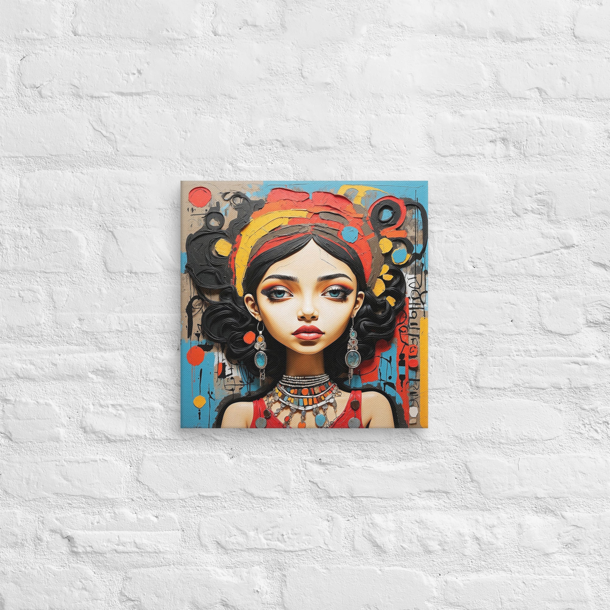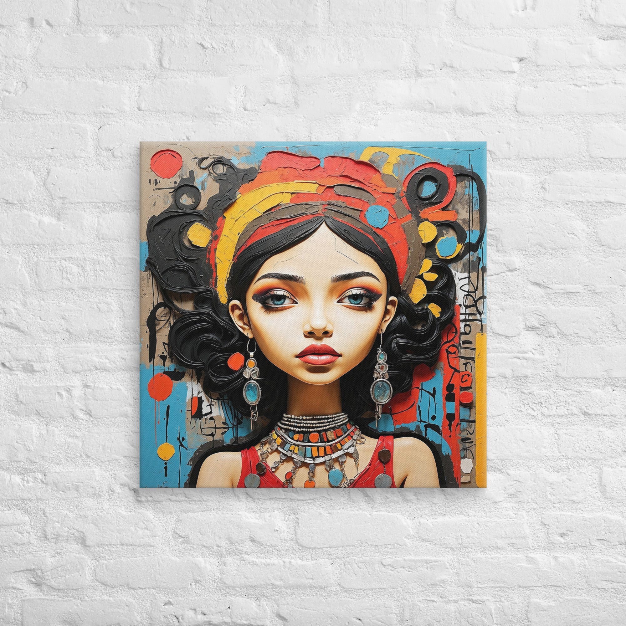 This captivating artwork portrays a striking woman adorned with colorful jewelry and intricate textures, set against an expressive abstract backdrop. Warm reds, turquoise, and ochre hues blend harmoniously, adding a sense of vibrancy and culture to any modern or boho-inspired room.