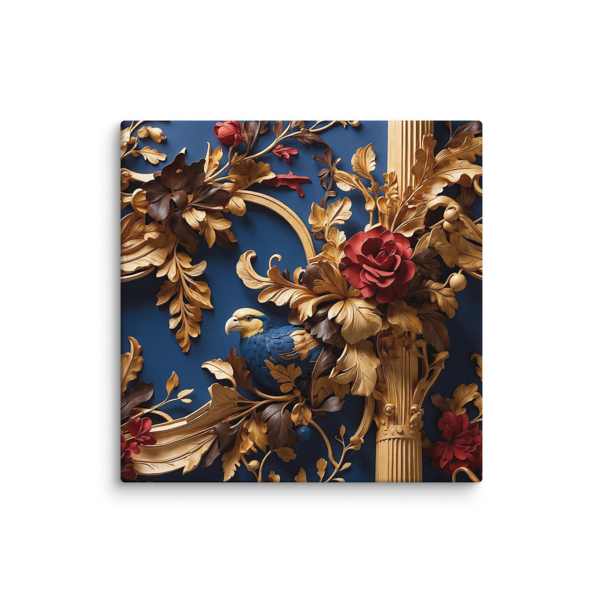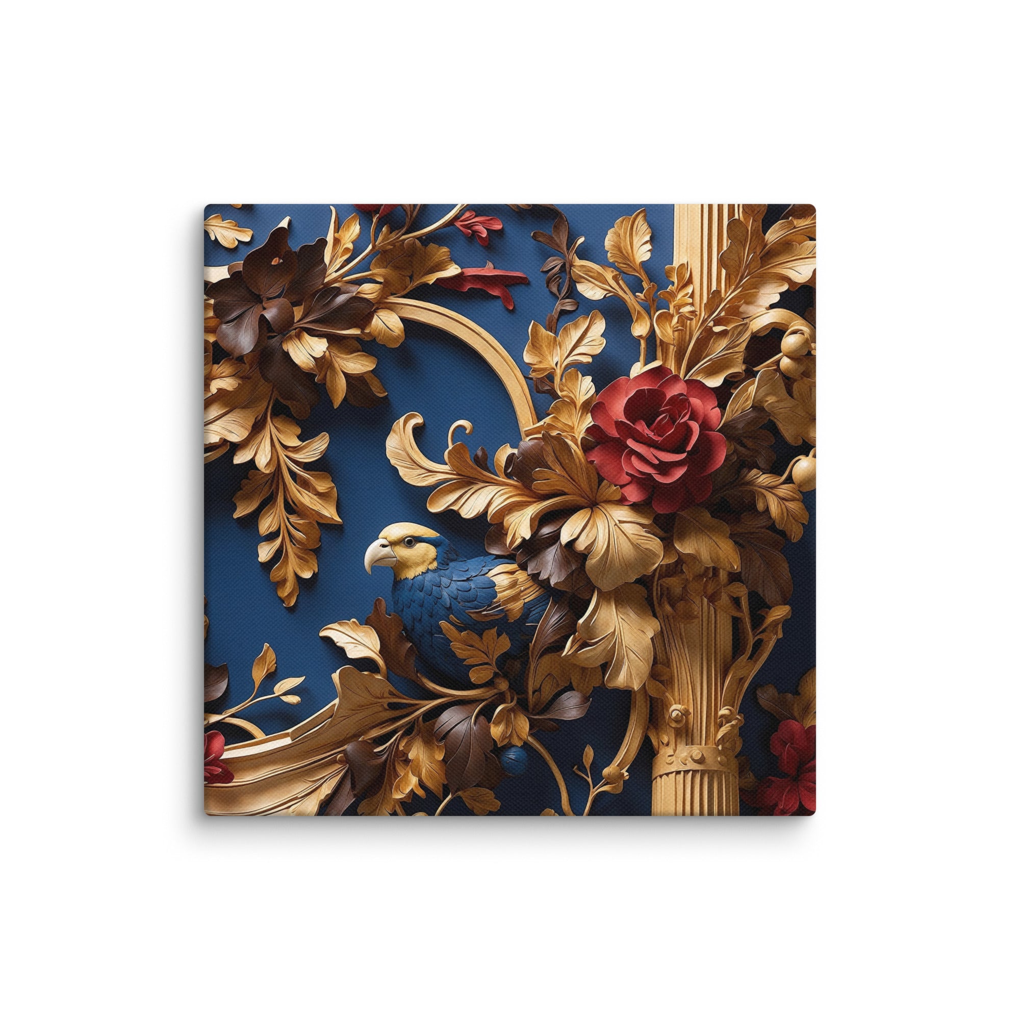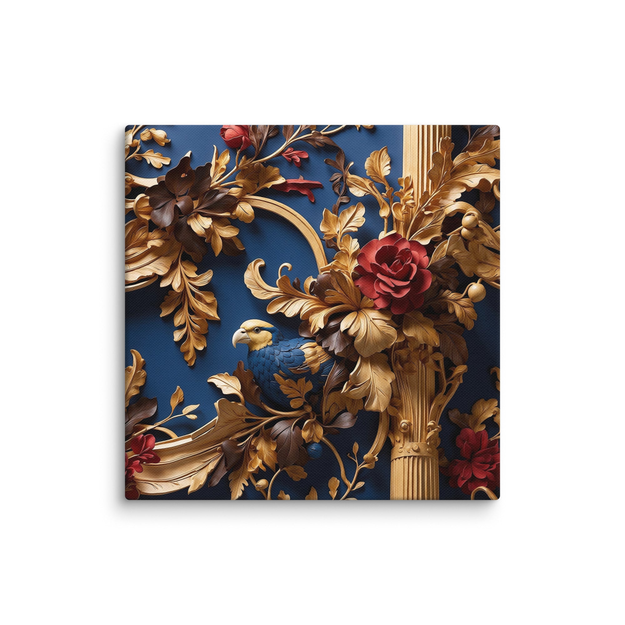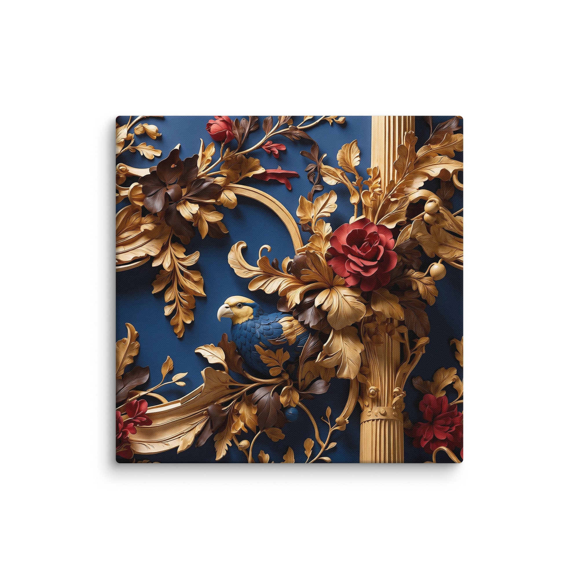 This exquisite artwork showcases a richly detailed golden framework adorned with blooming red roses and a graceful bird nestled among ornate leaves. Set against a deep blue backdrop, it evokes elegance and refinement—perfect for luxury interiors or statement walls.