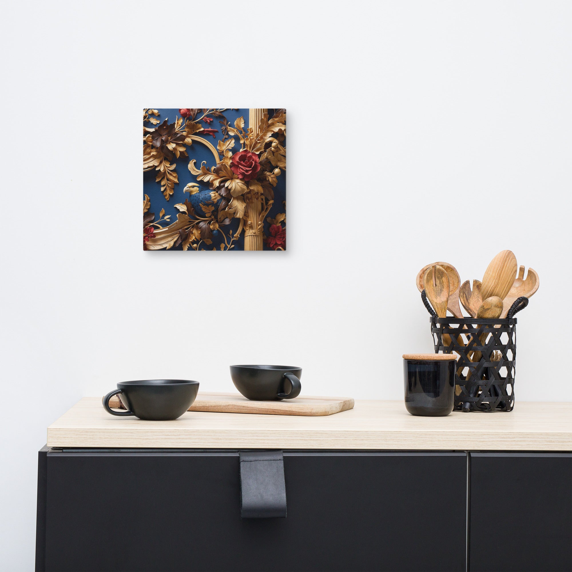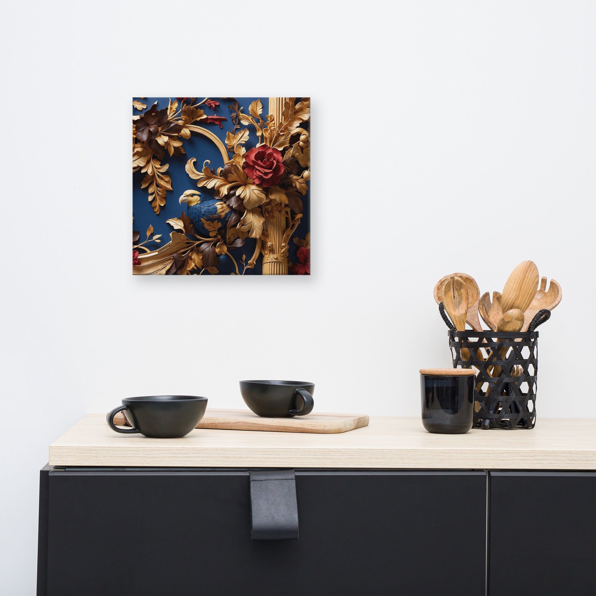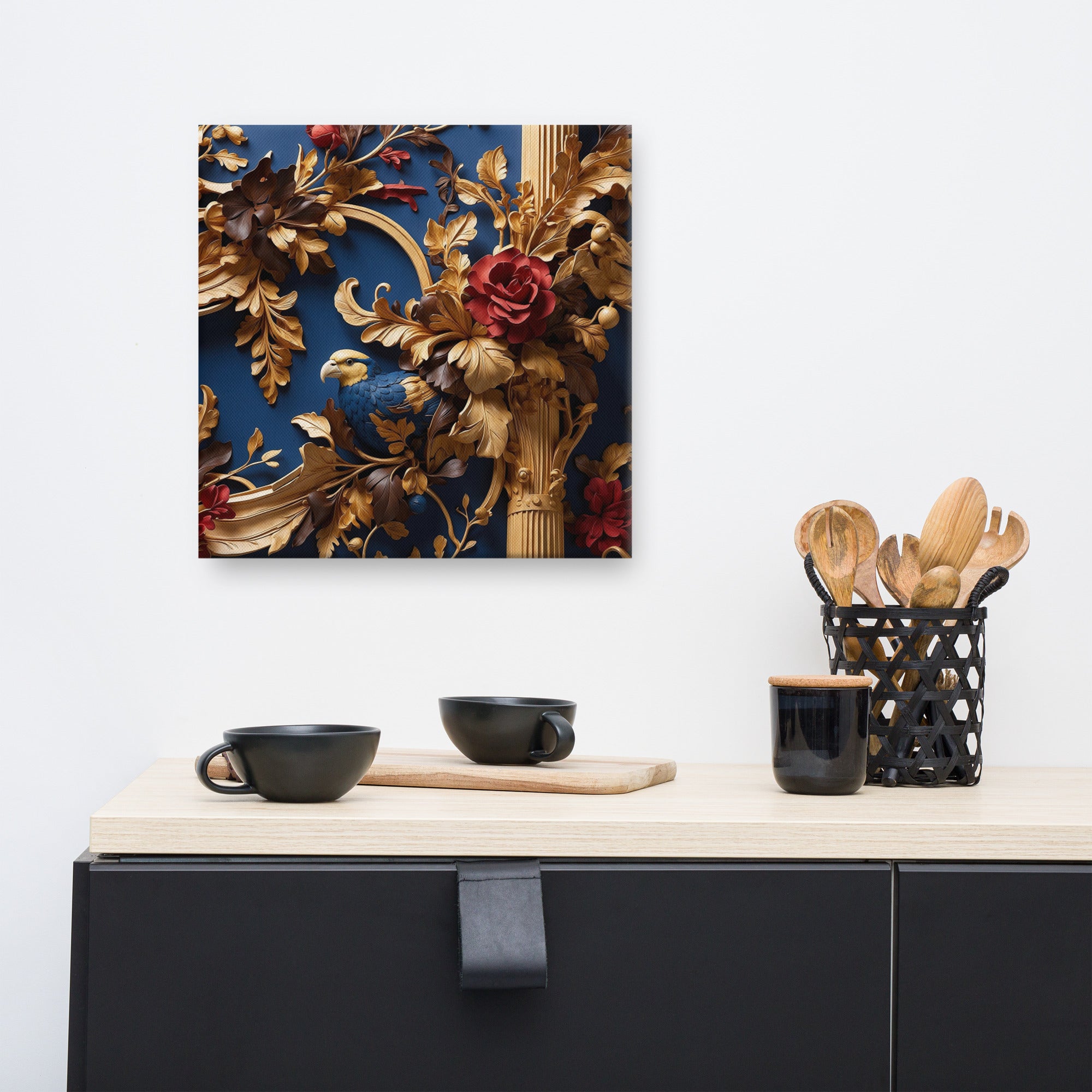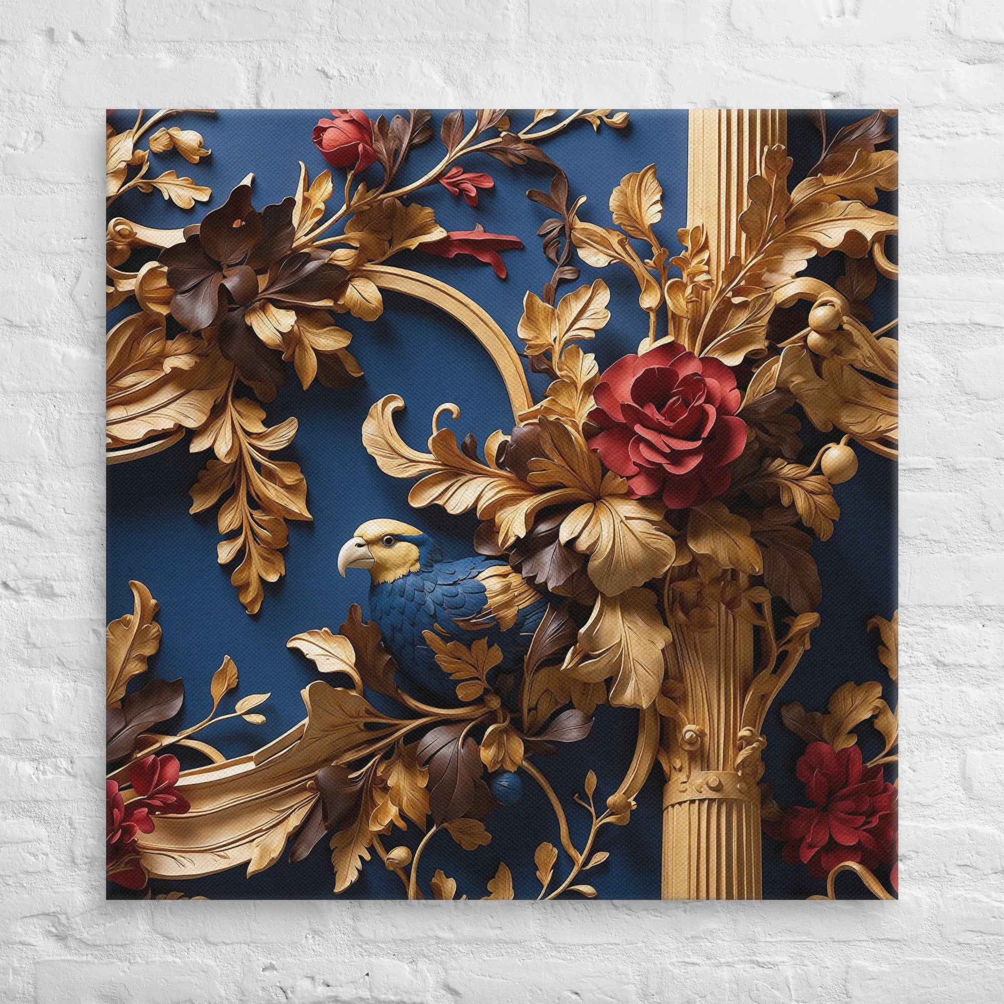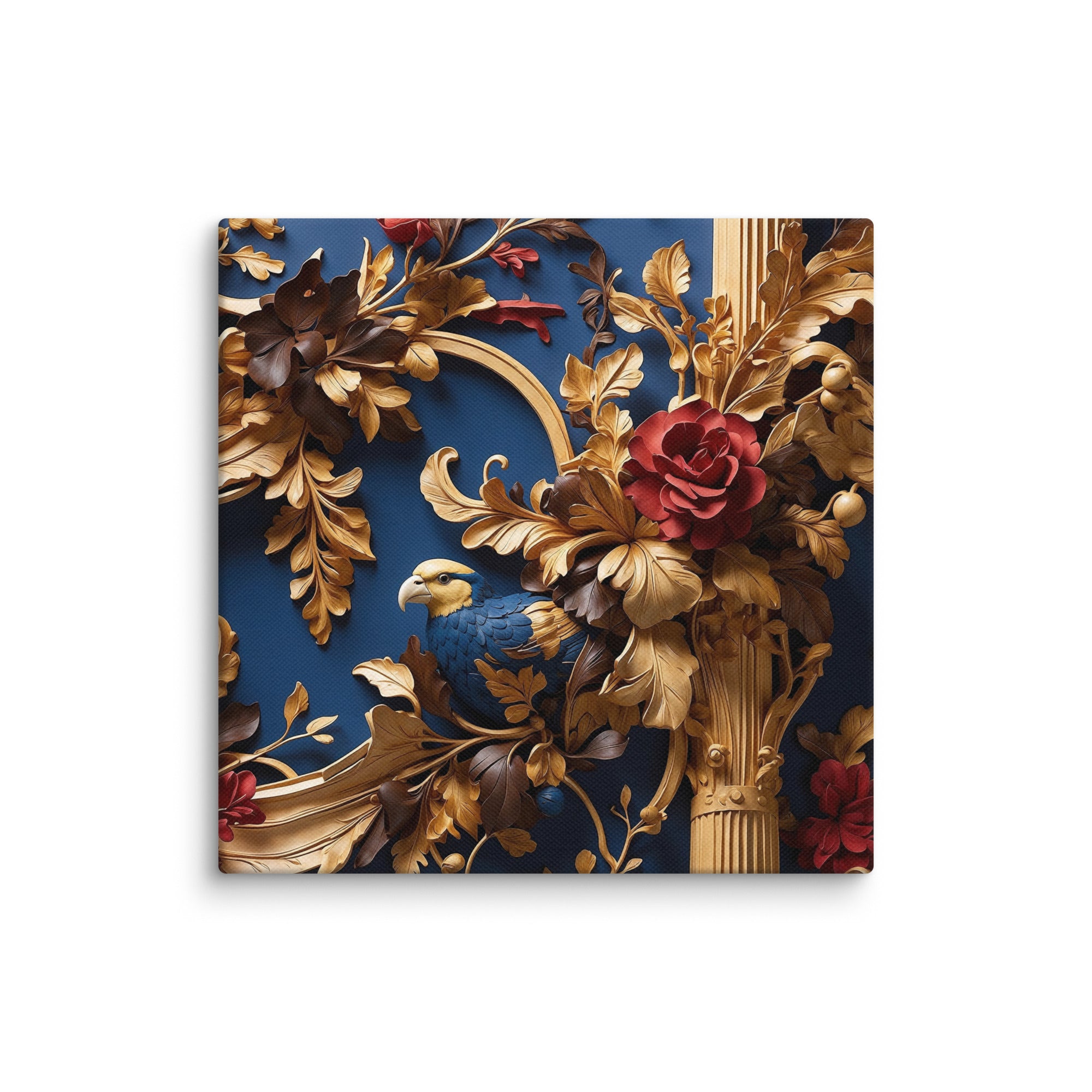 This exquisite artwork showcases a richly detailed golden framework adorned with blooming red roses and a graceful bird nestled among ornate leaves. Set against a deep blue backdrop, it evokes elegance and refinement—perfect for luxury interiors or statement walls.