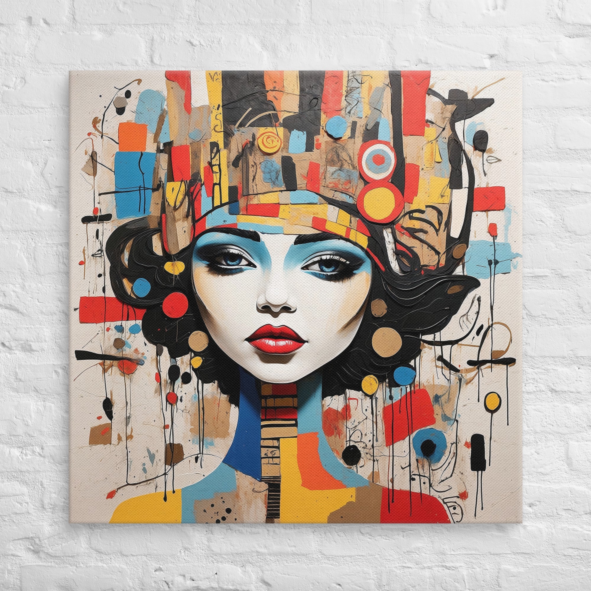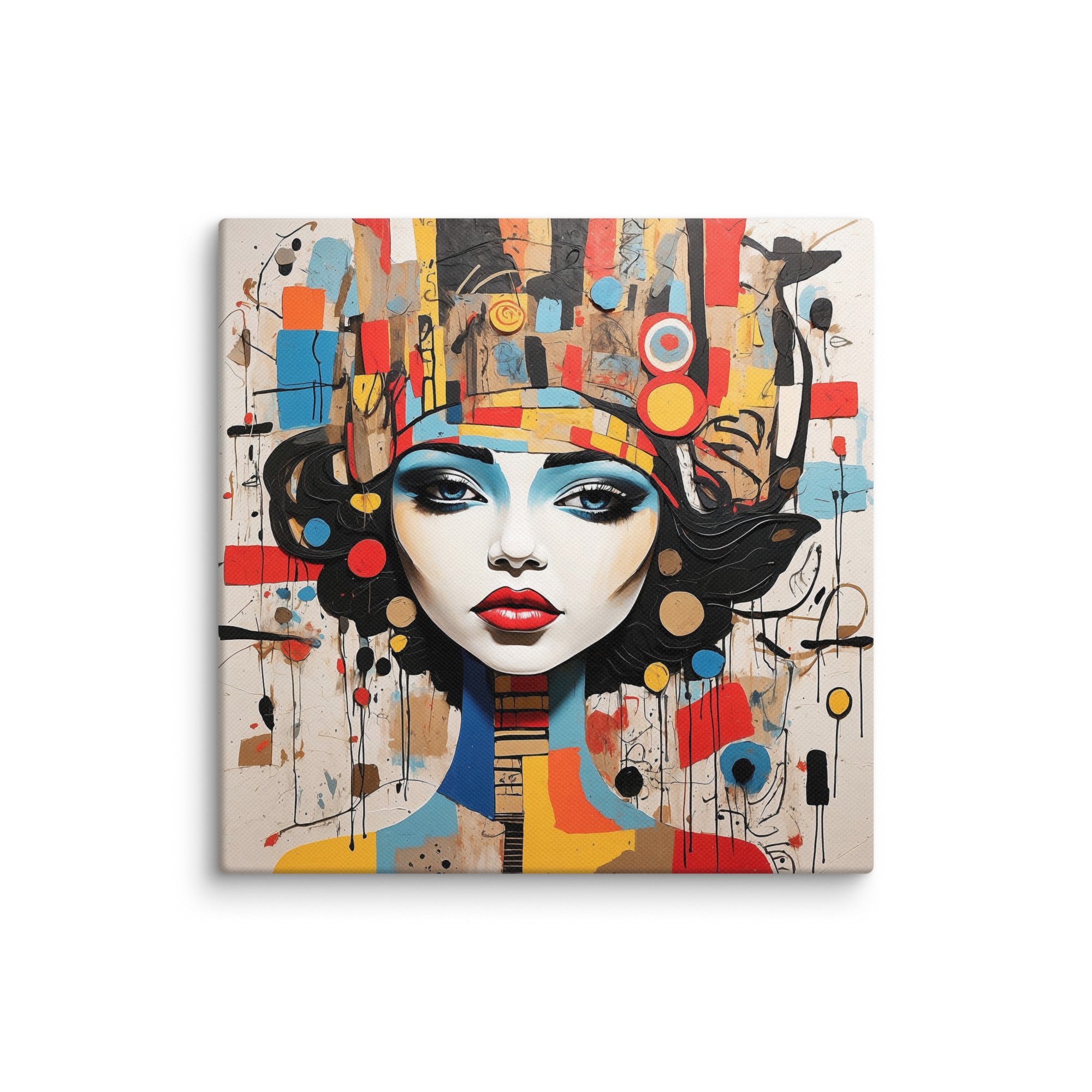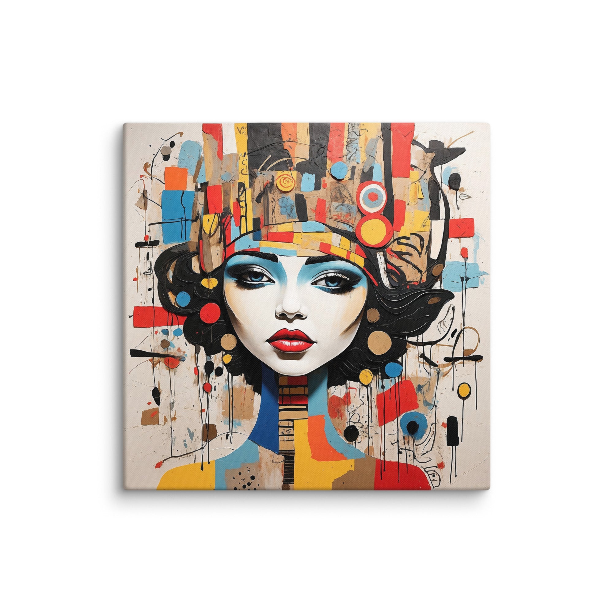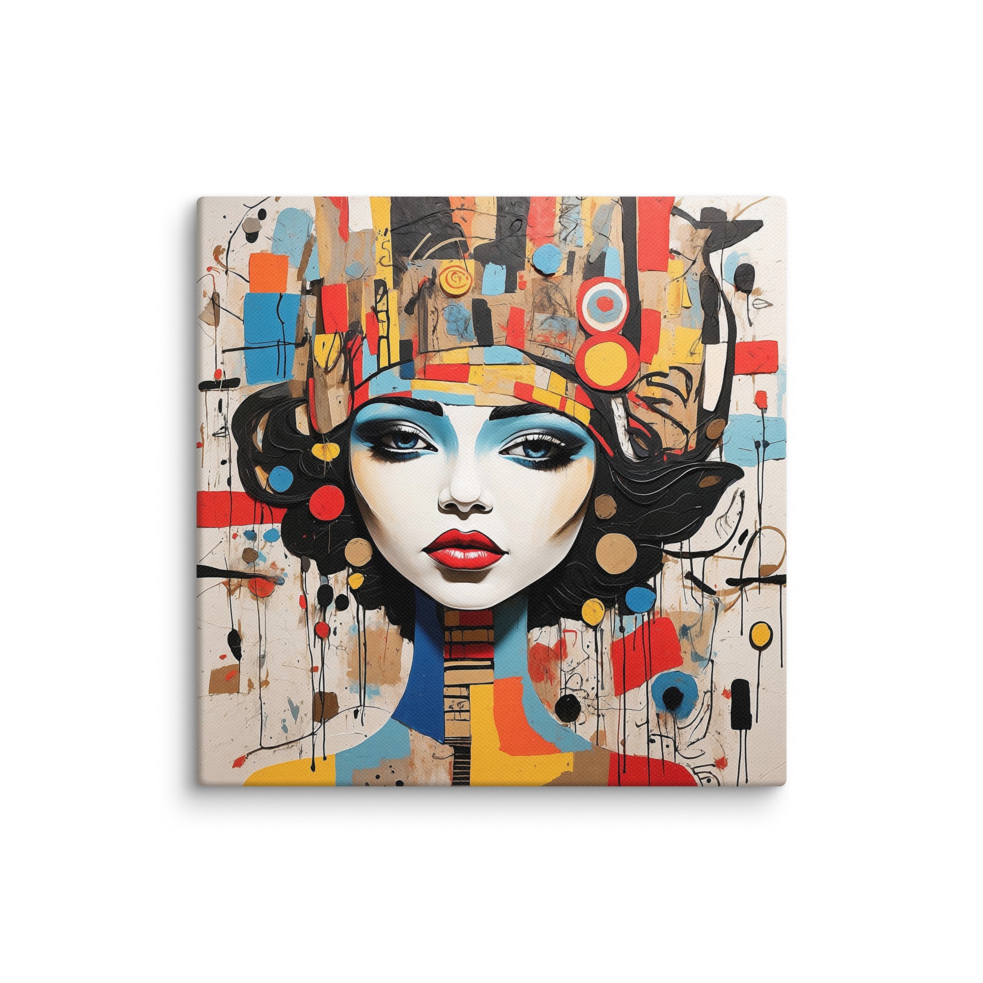 This mesmerizing artwork portrays a contemporary female figure crowned with colorful geometric patterns in rich reds, yellows, blues, and earthy tones. A fusion of abstraction and expression, it brings a bold, artistic energy to modern, eclectic, or boho-inspired interiors.