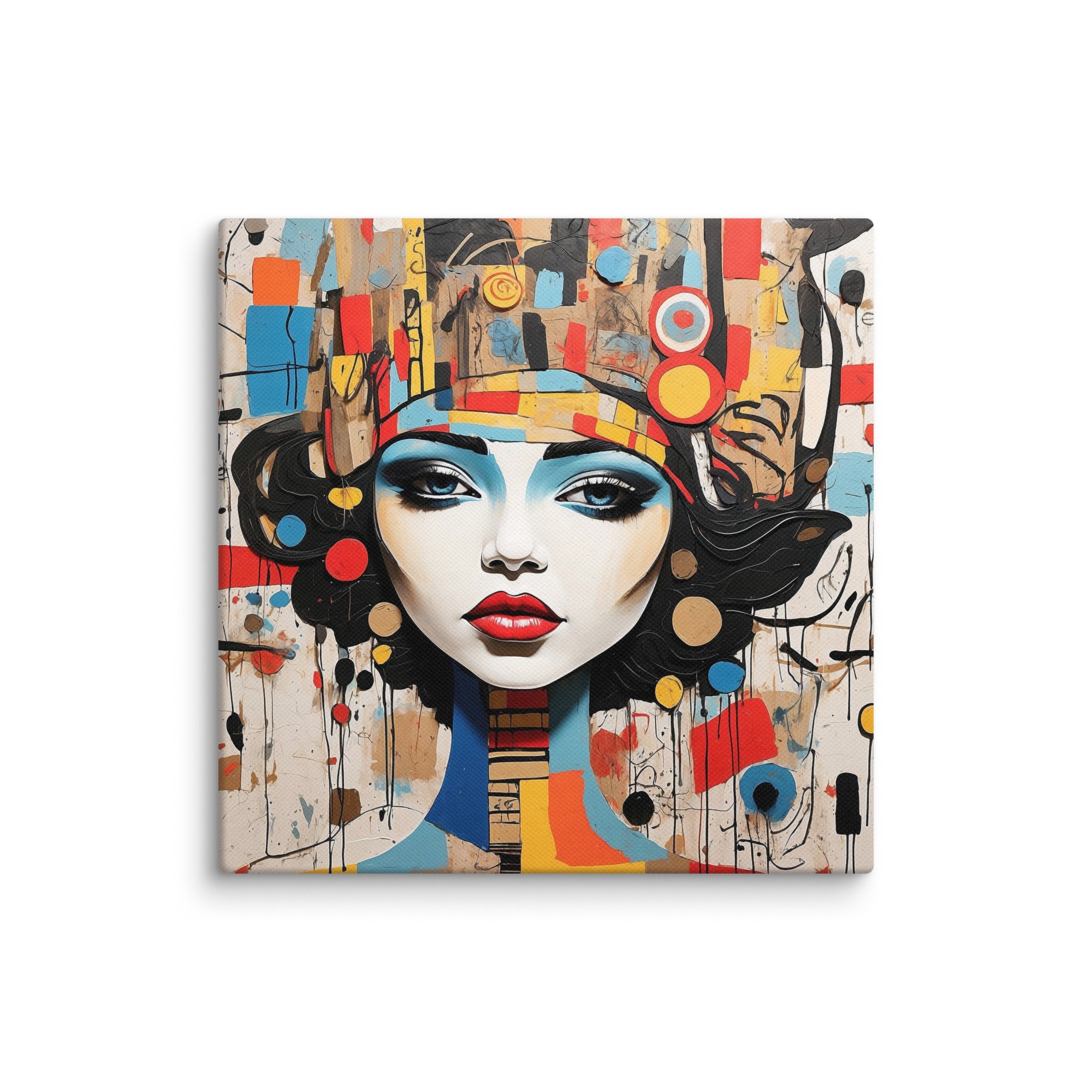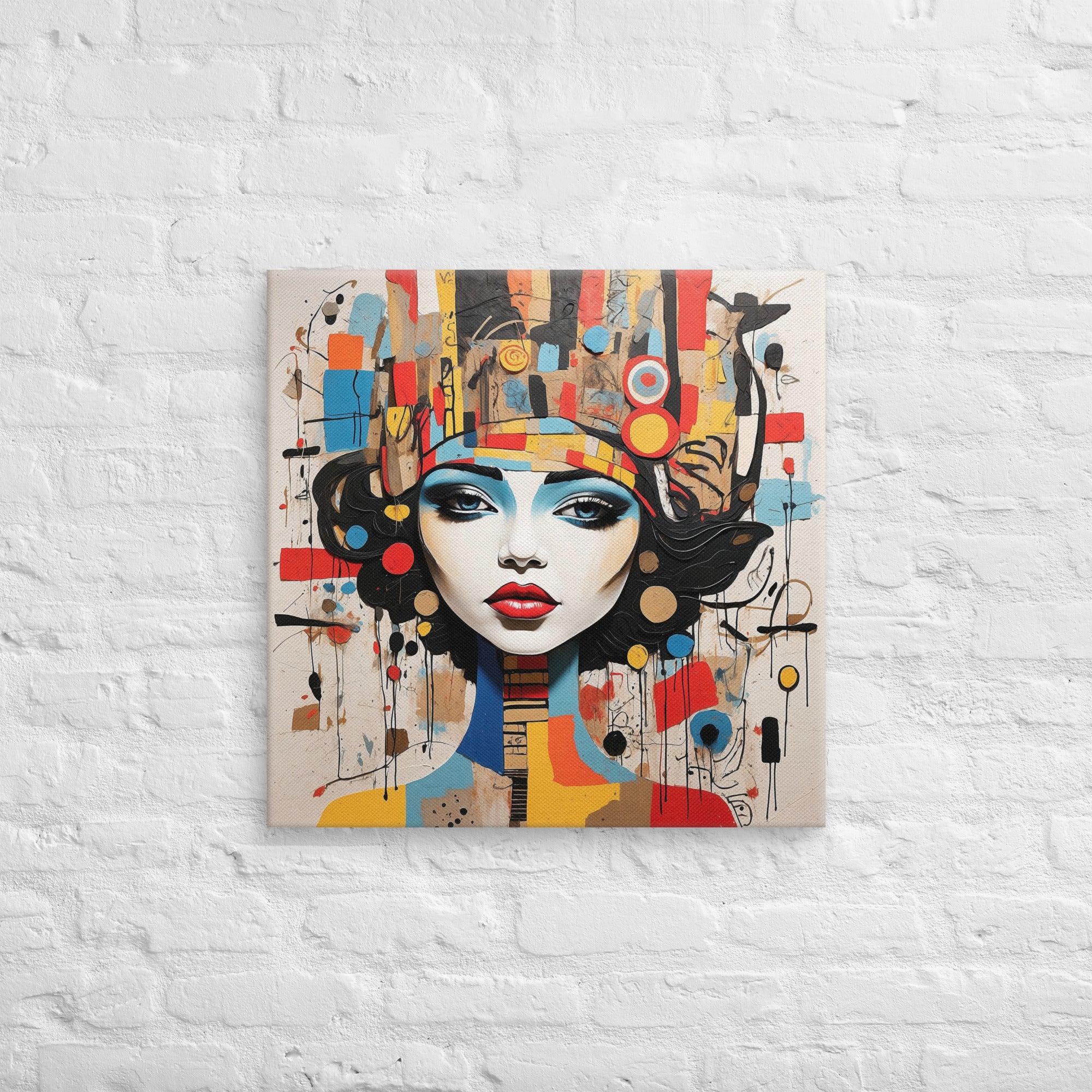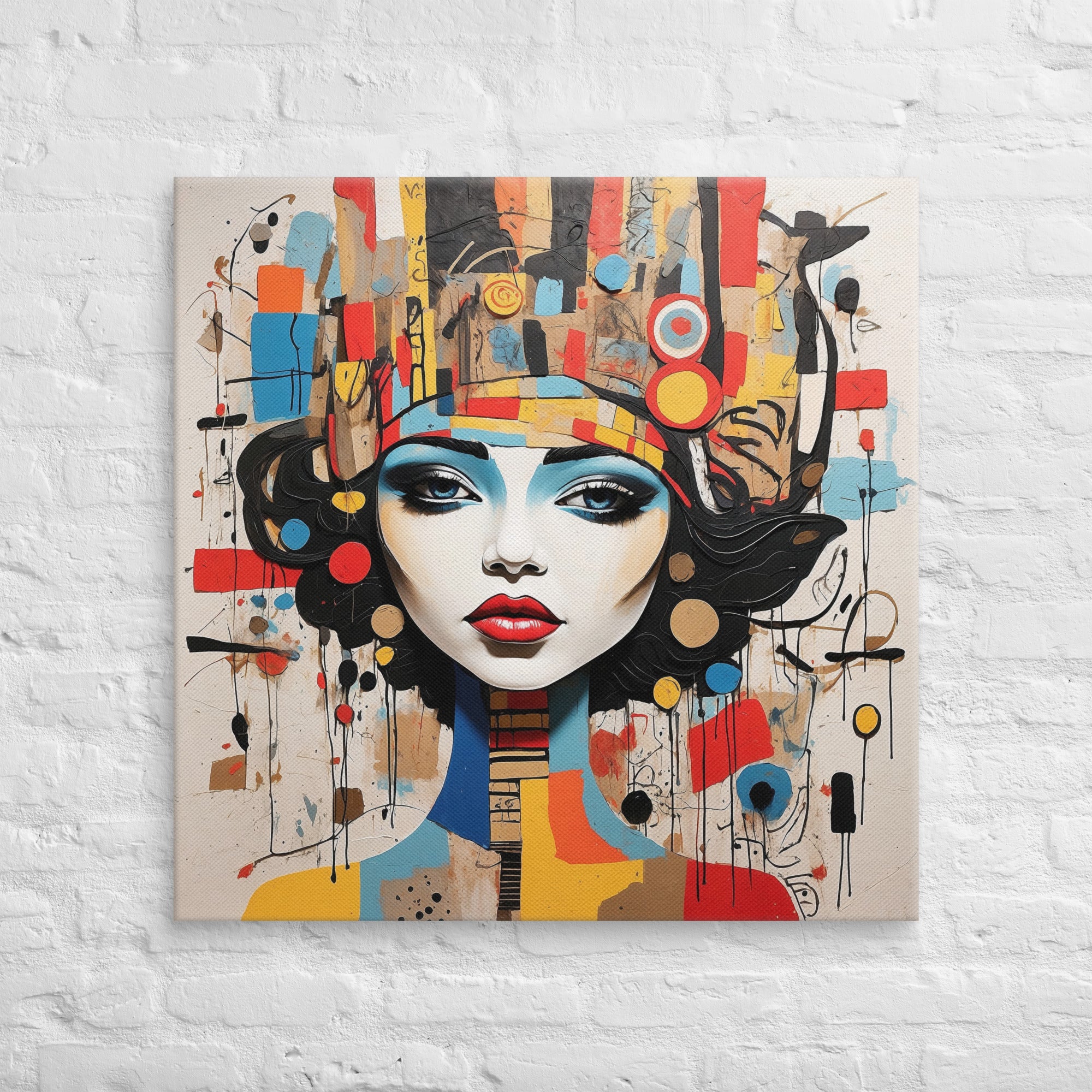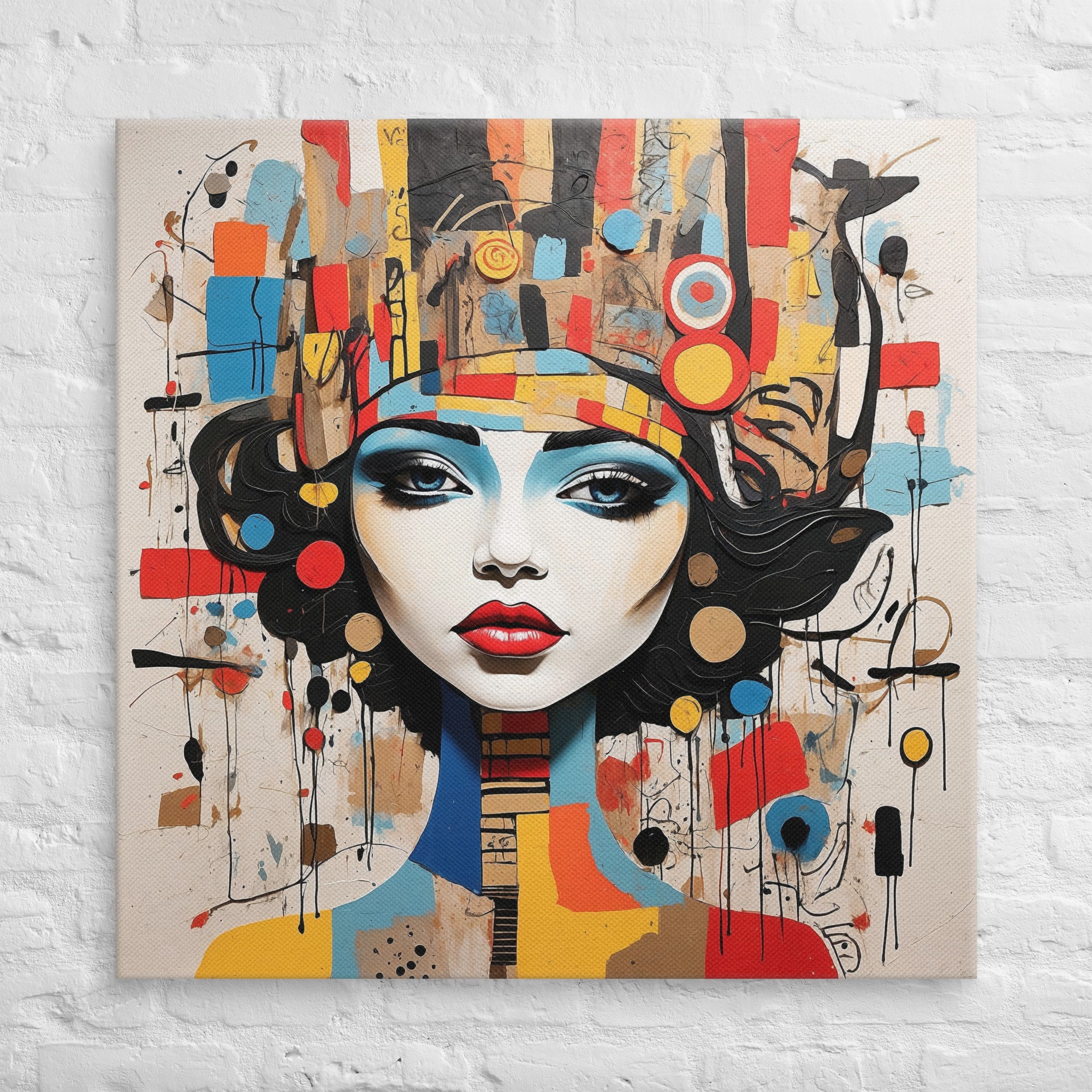 This mesmerizing artwork portrays a contemporary female figure crowned with colorful geometric patterns in rich reds, yellows, blues, and earthy tones. A fusion of abstraction and expression, it brings a bold, artistic energy to modern, eclectic, or boho-inspired interiors.