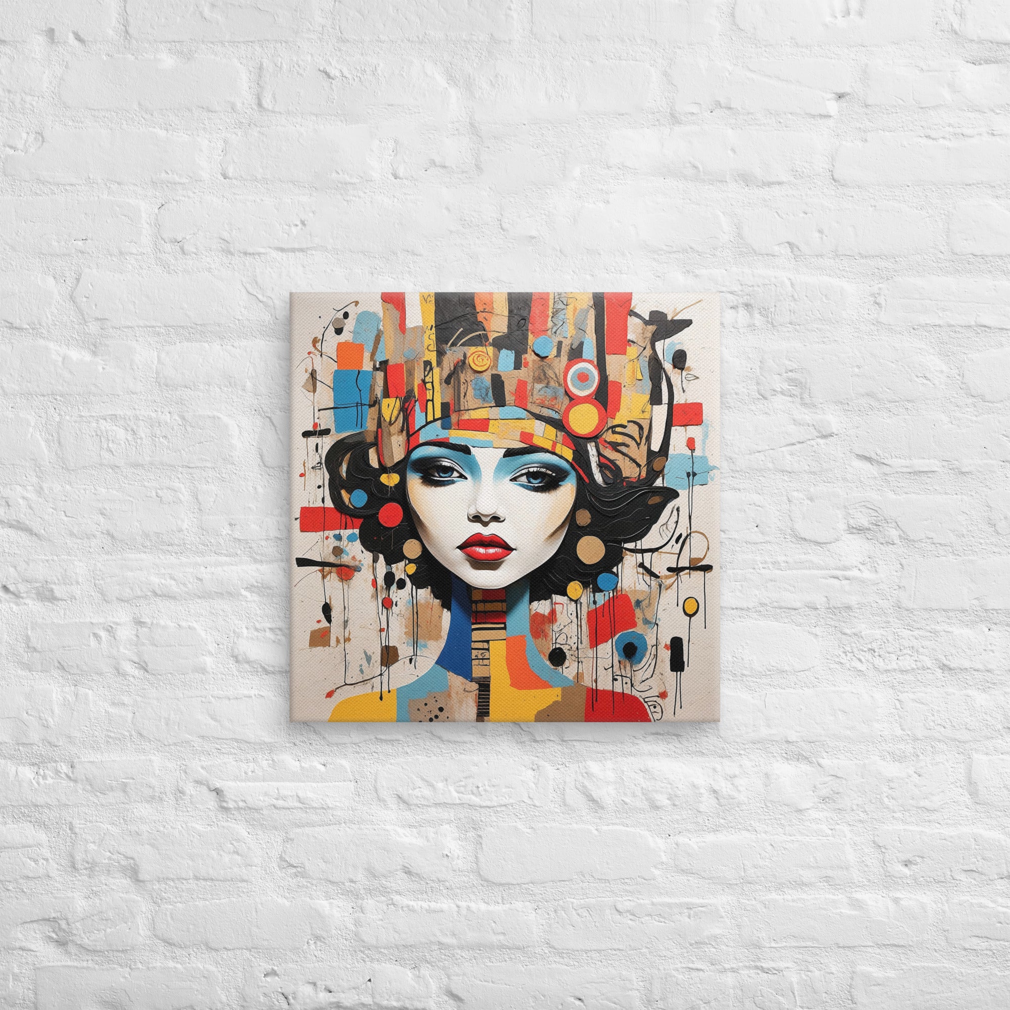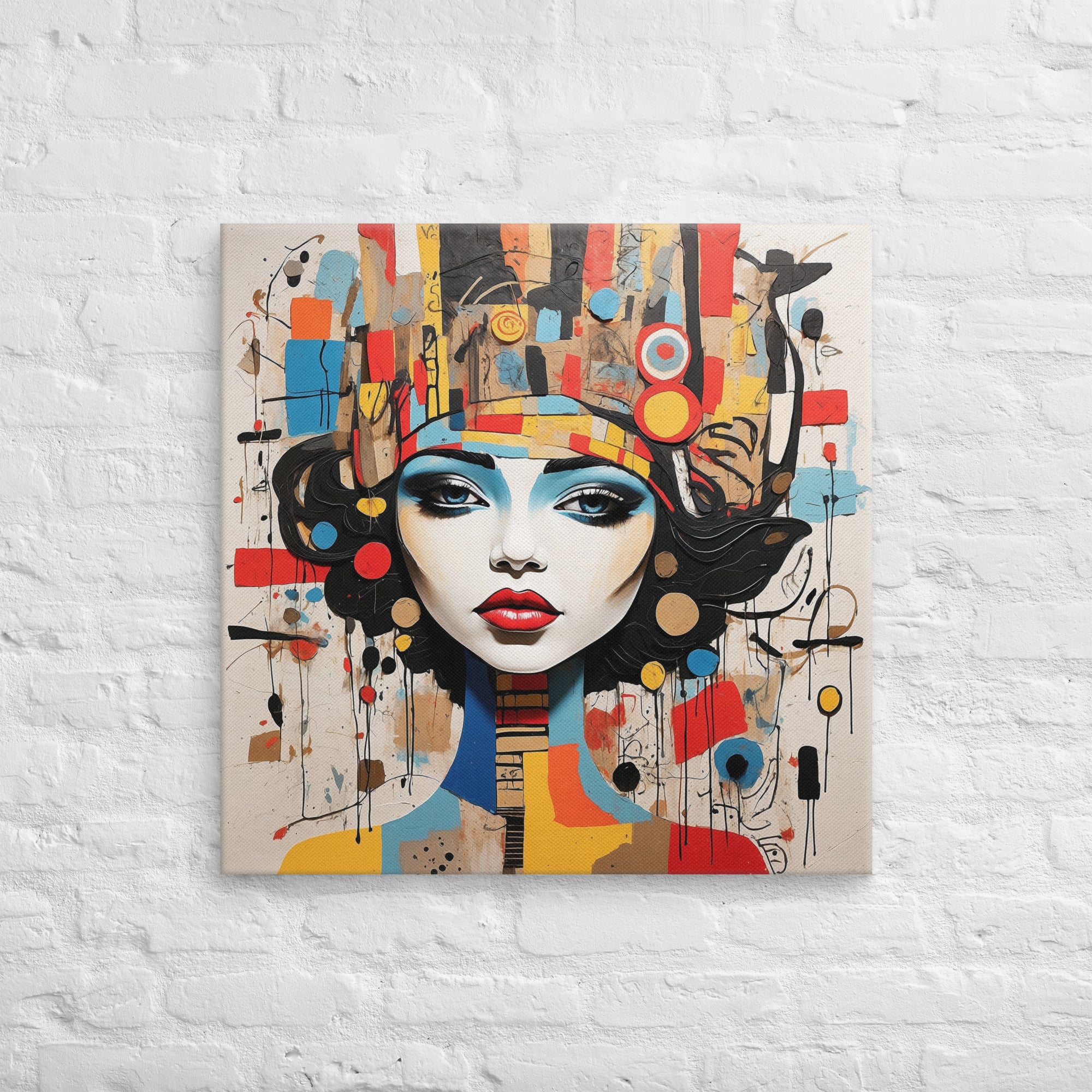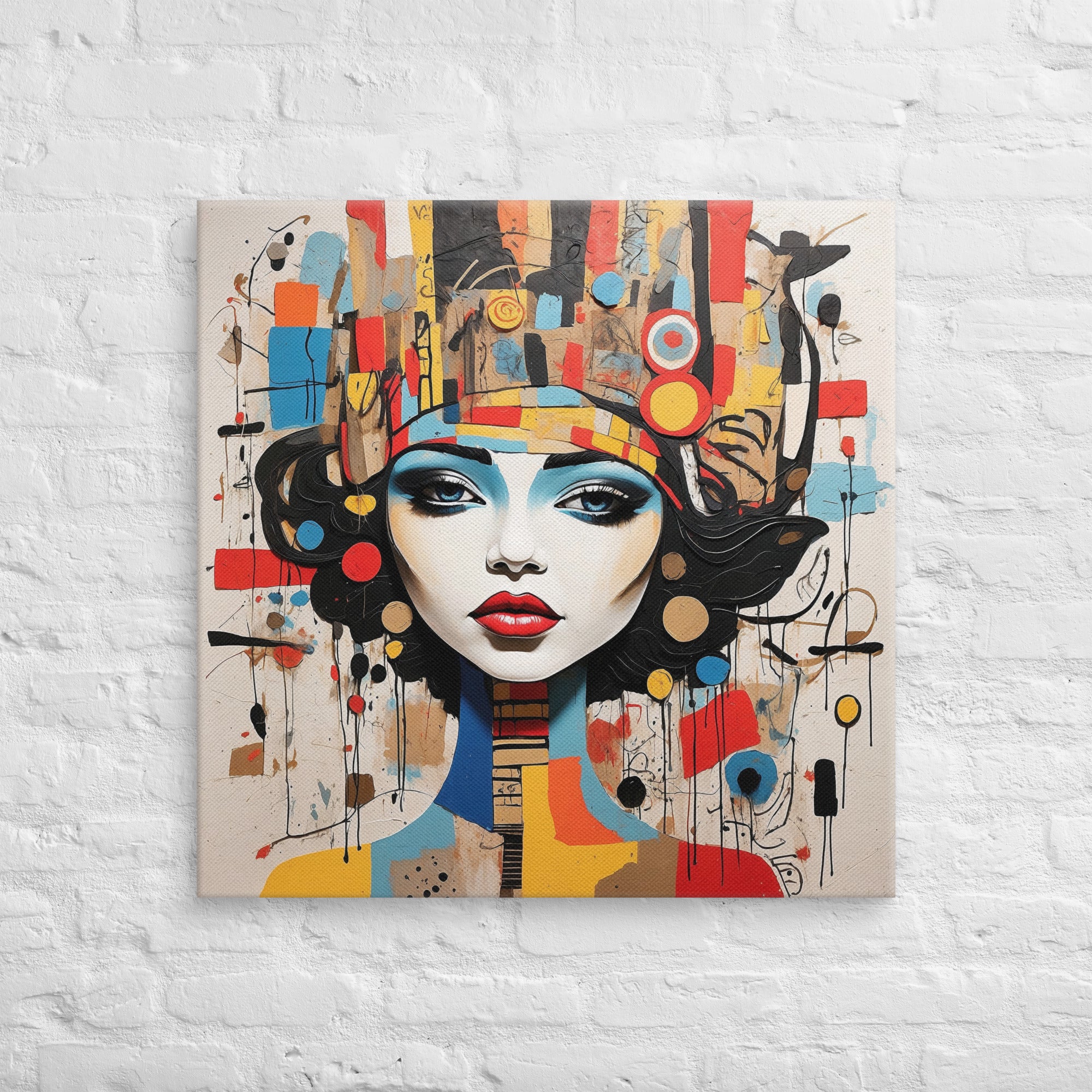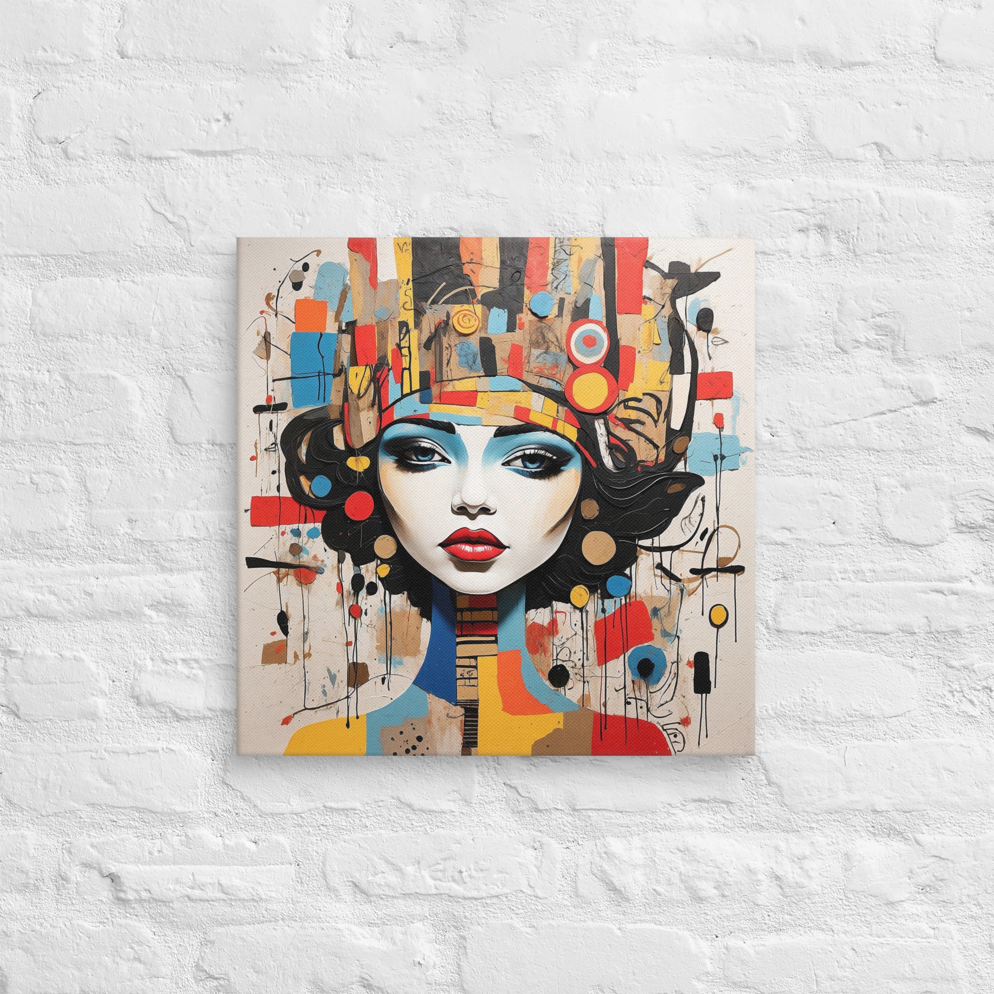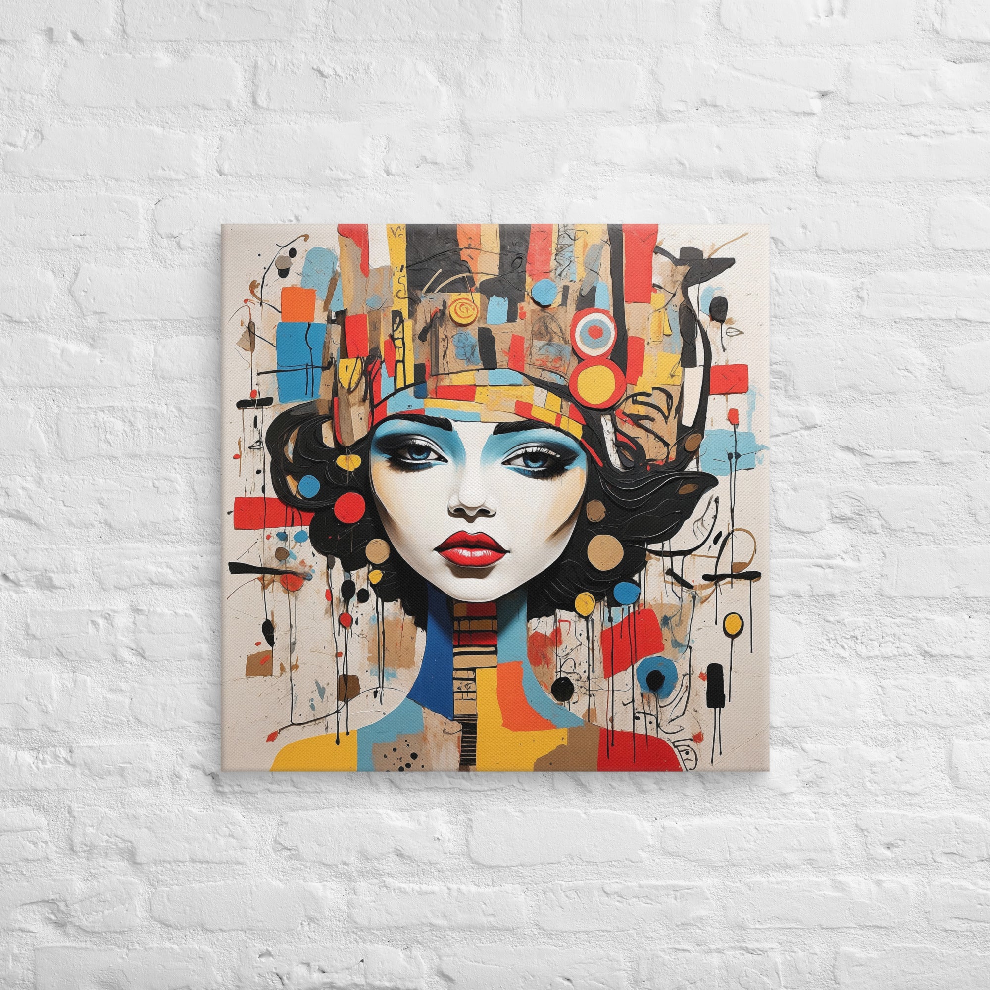 This mesmerizing artwork portrays a contemporary female figure crowned with colorful geometric patterns in rich reds, yellows, blues, and earthy tones. A fusion of abstraction and expression, it brings a bold, artistic energy to modern, eclectic, or boho-inspired interiors.