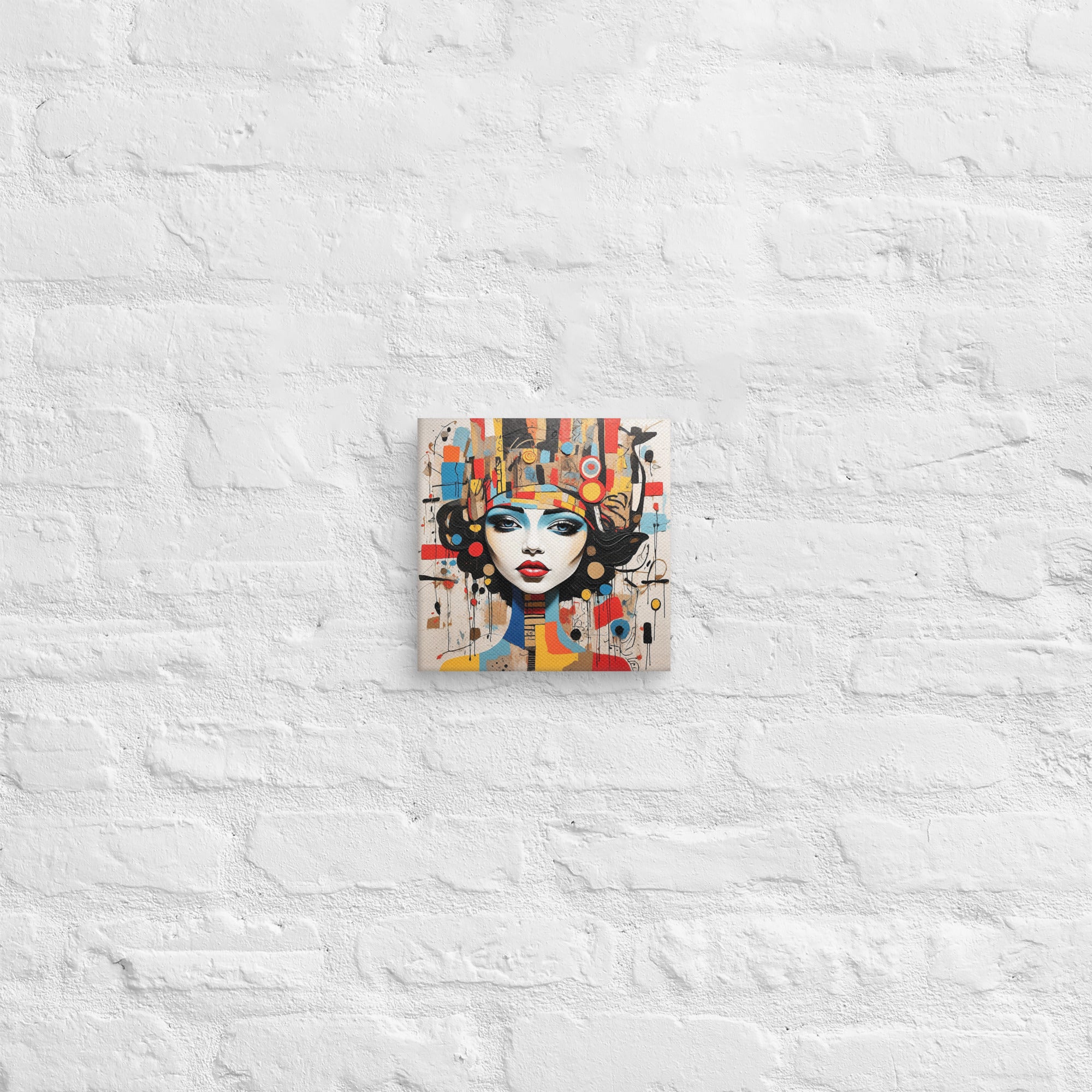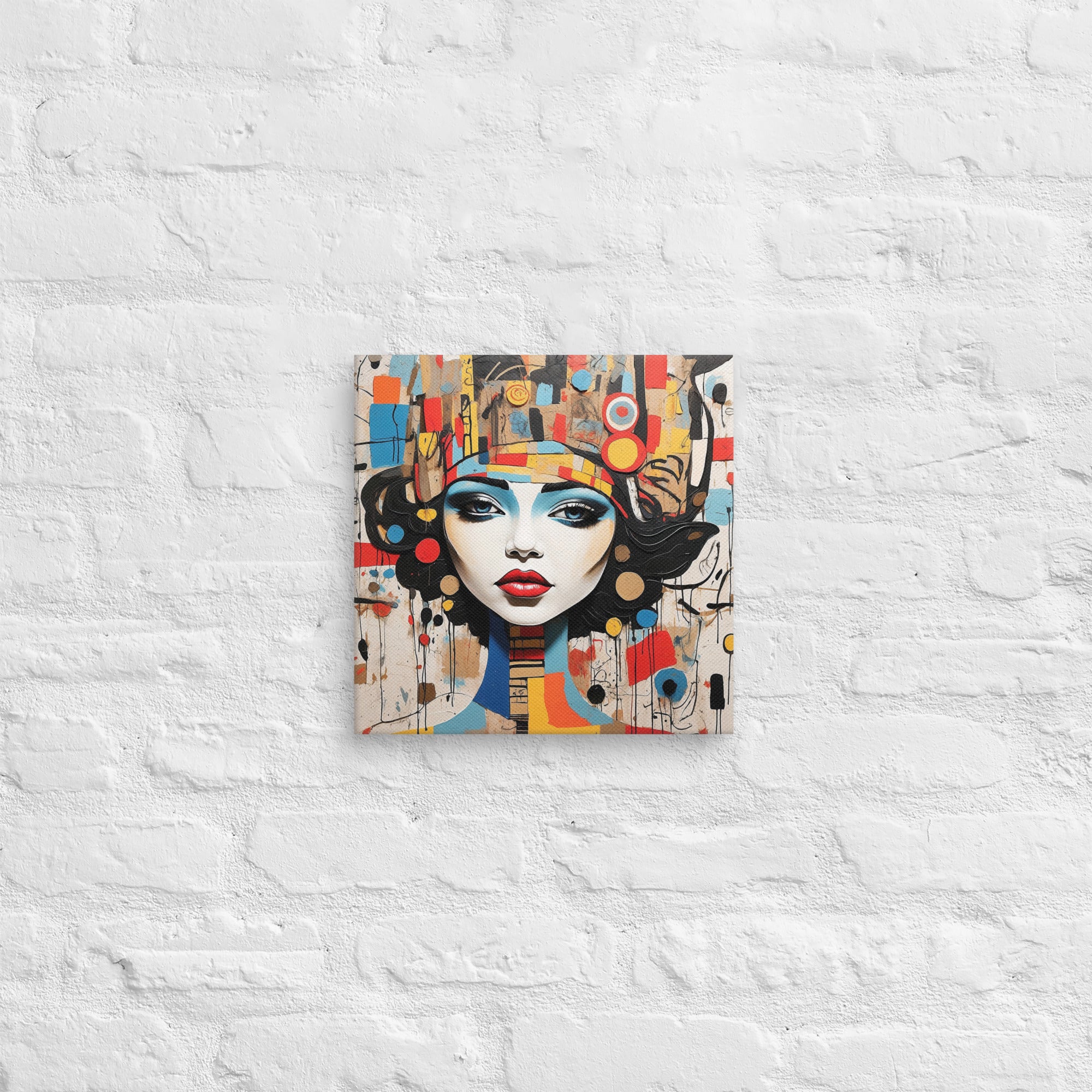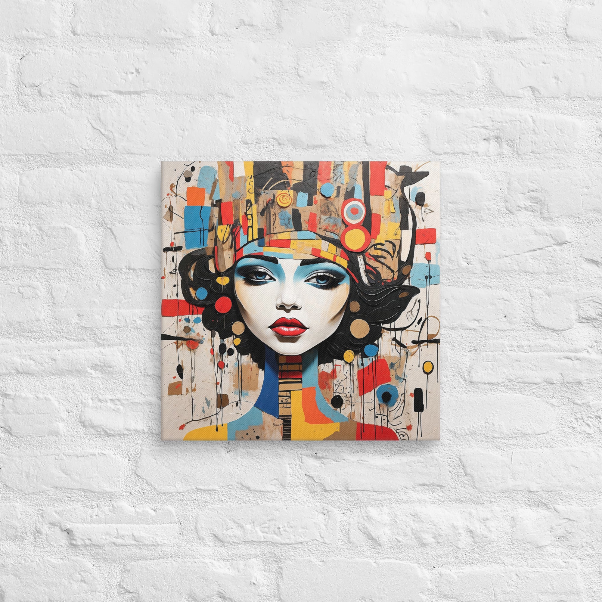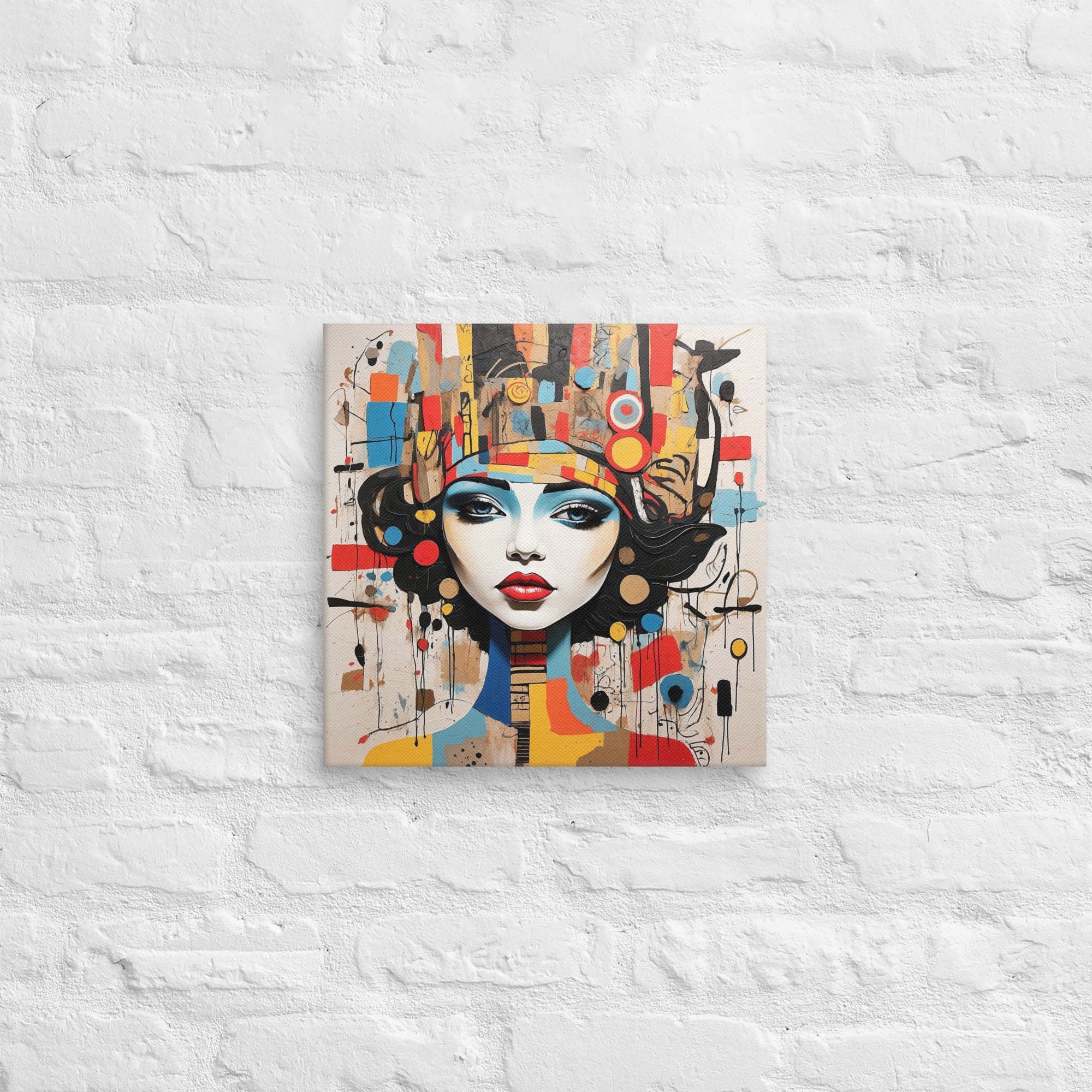 This mesmerizing artwork portrays a contemporary female figure crowned with colorful geometric patterns in rich reds, yellows, blues, and earthy tones. A fusion of abstraction and expression, it brings a bold, artistic energy to modern, eclectic, or boho-inspired interiors.