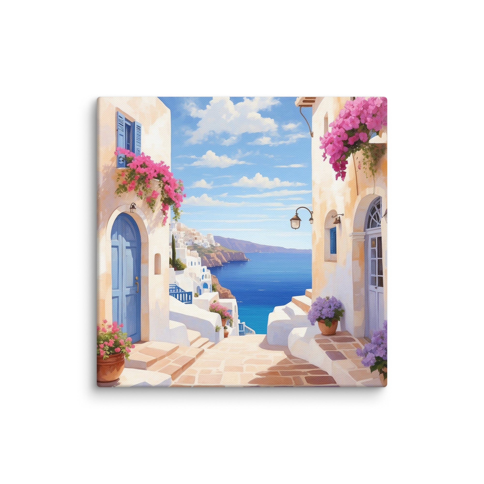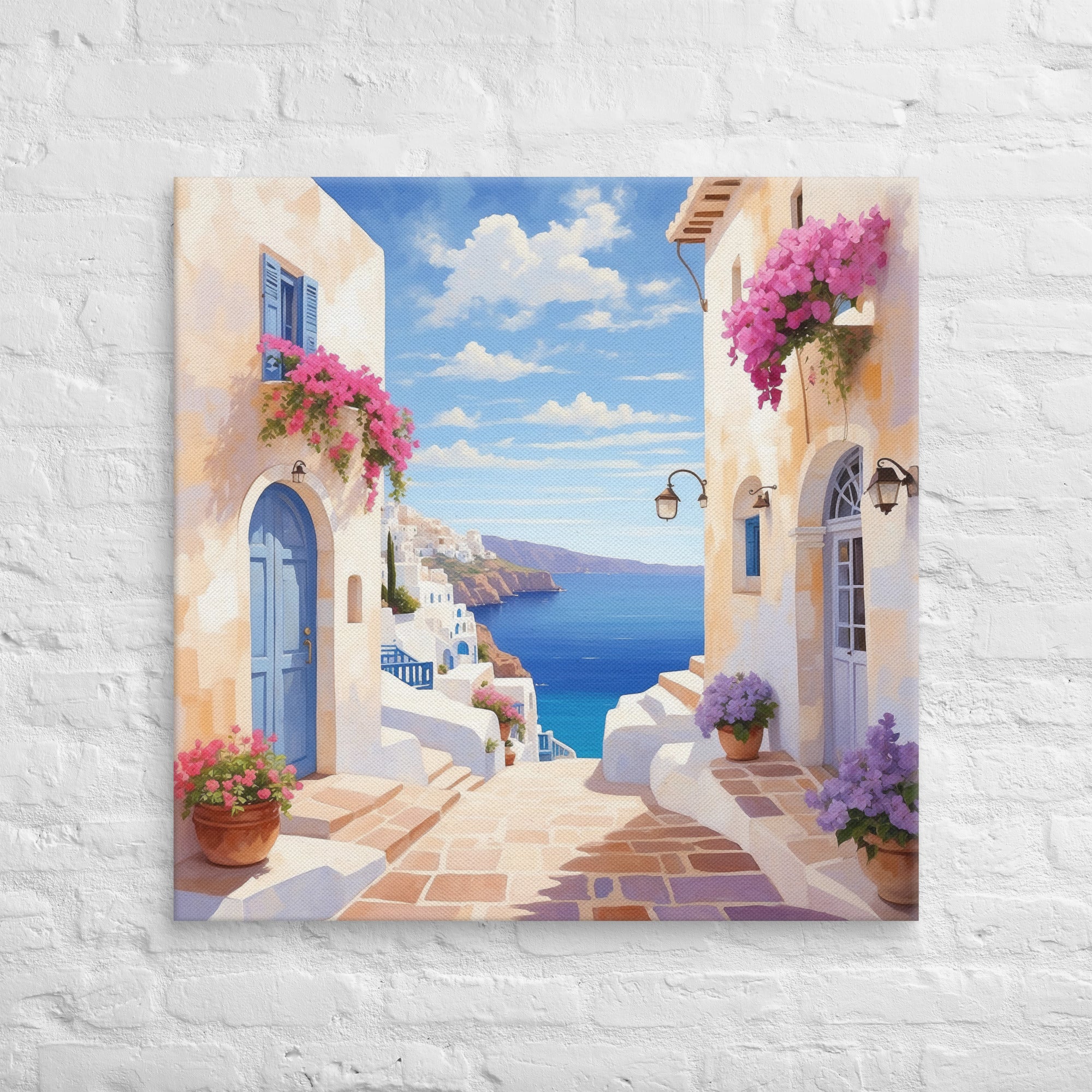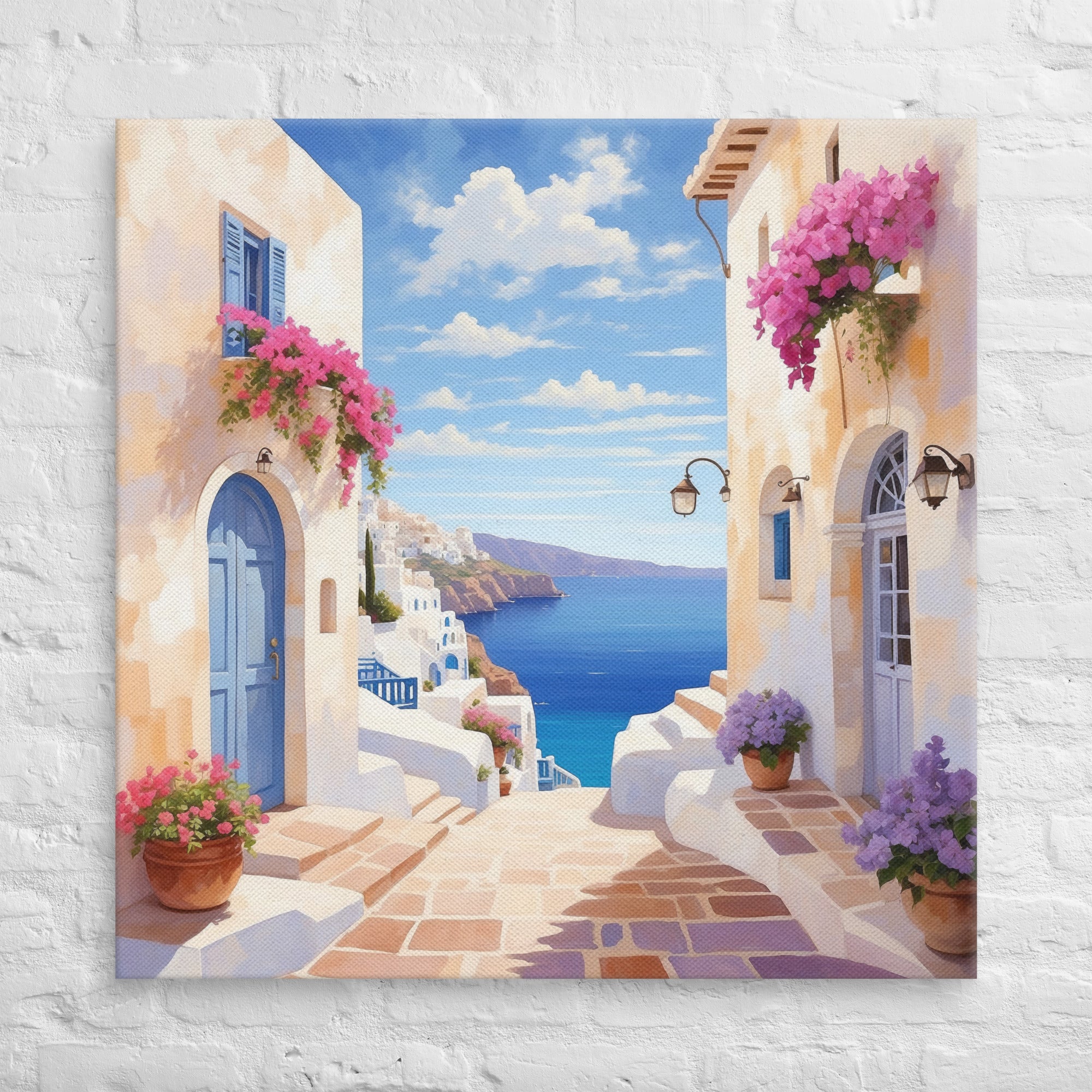 This bright and inviting artwork captures a picturesque Santorini alley lined with whitewashed houses, blooming flowers, and vibrant blue doors overlooking the Aegean Sea. The scene radiates Mediterranean charm, making it perfect for adding warmth and serenity to any space.