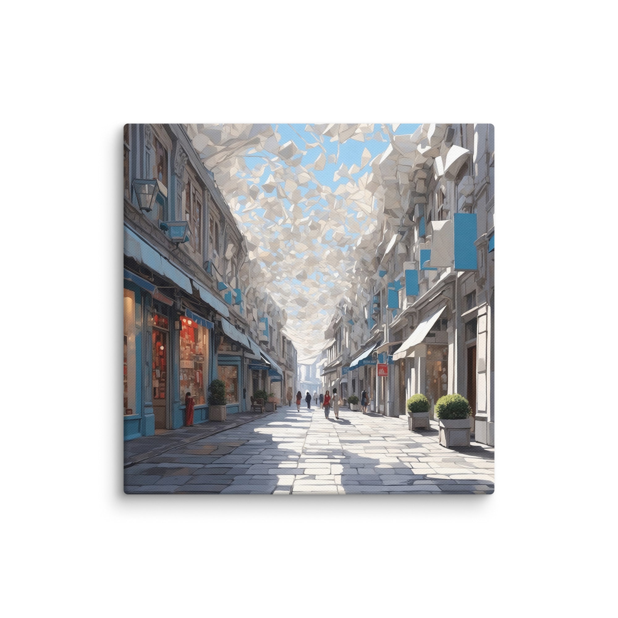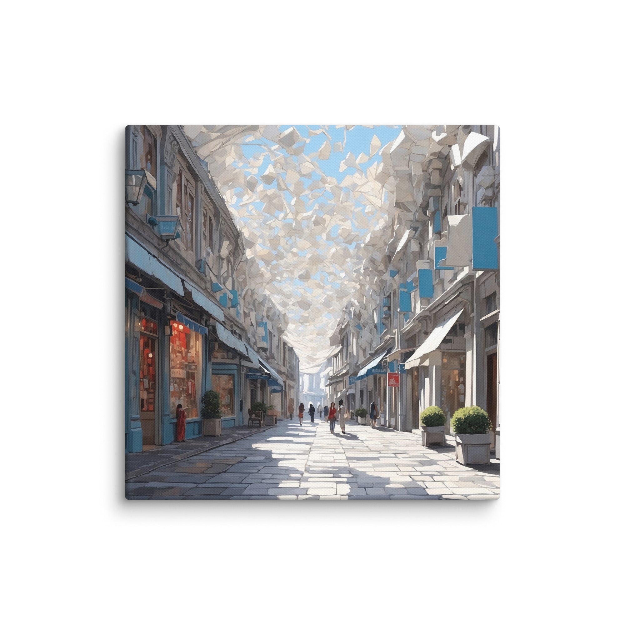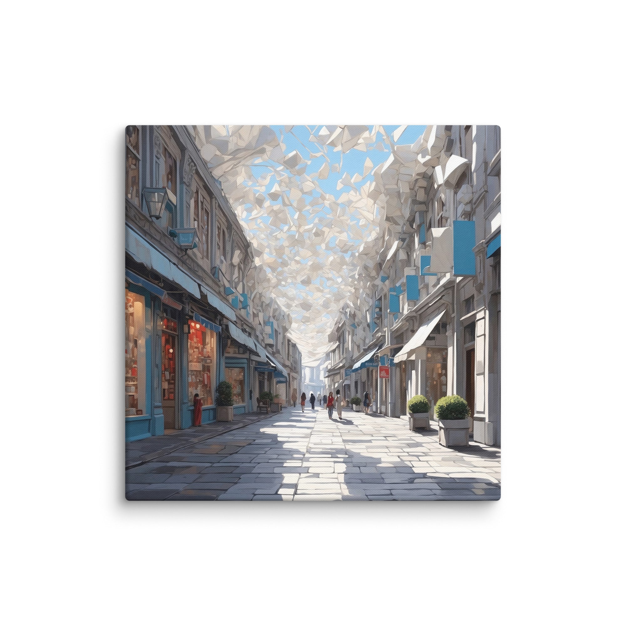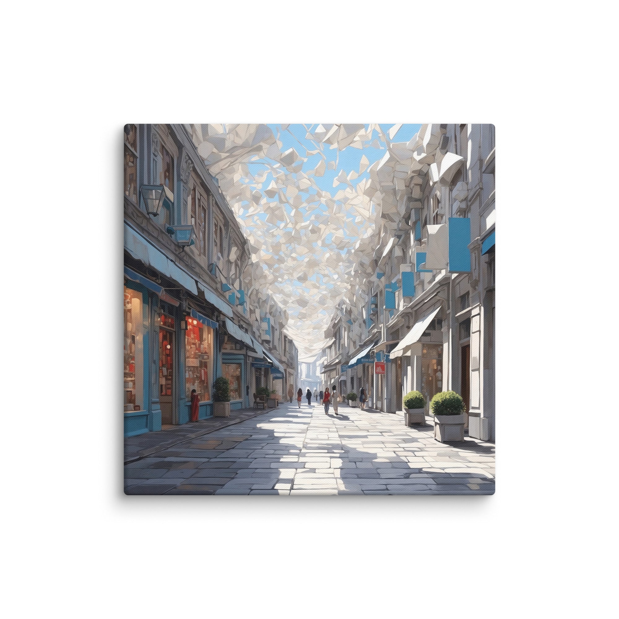 This charming artwork captures a sunlit European shopping street adorned with hanging white canopies and warm architectural tones. The inviting light and calm atmosphere evoke leisurely strolls and timeless elegance, perfect for brightening living rooms, hallways, or studios.