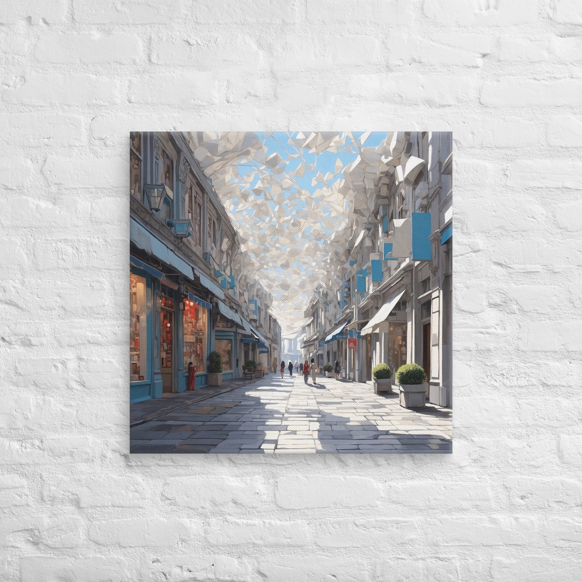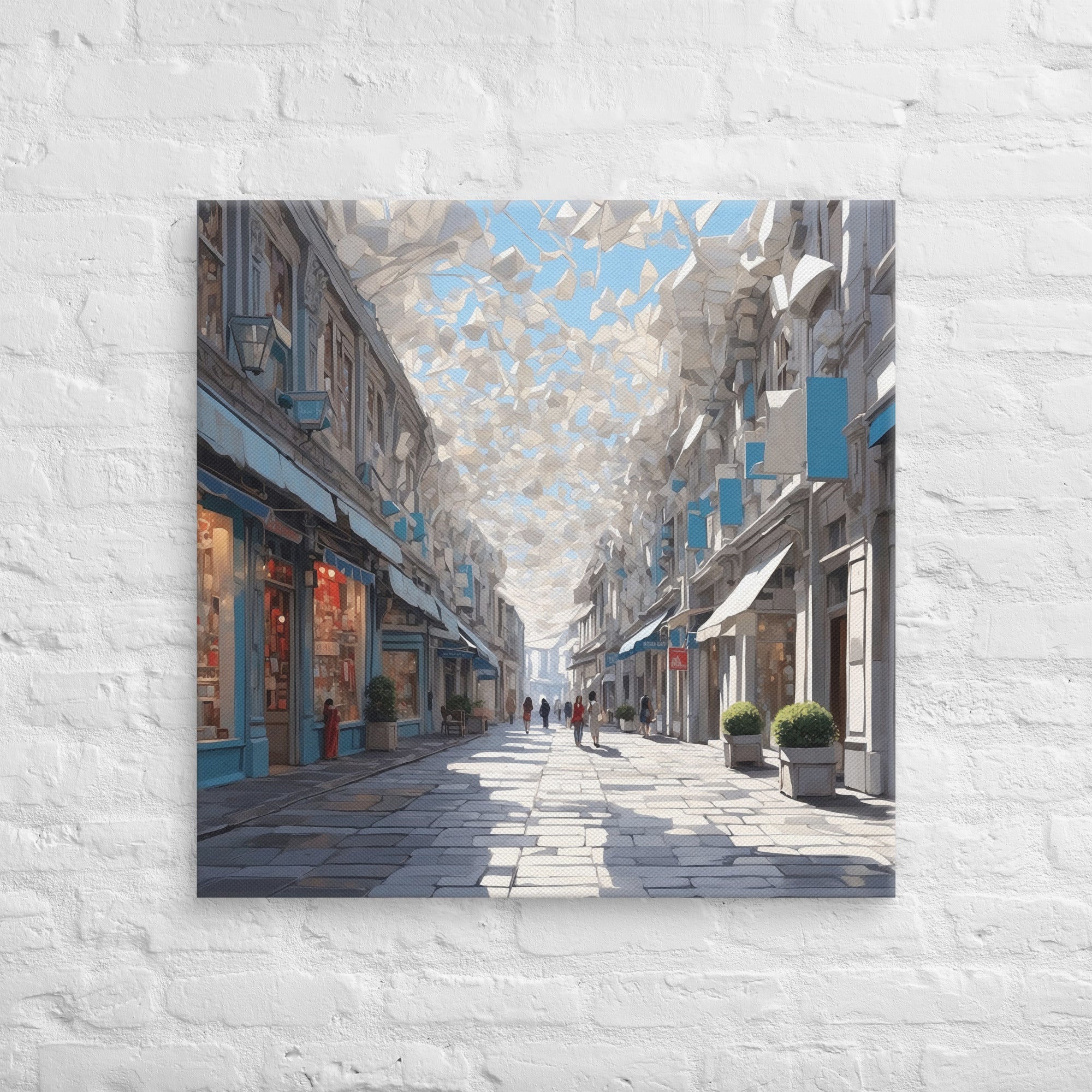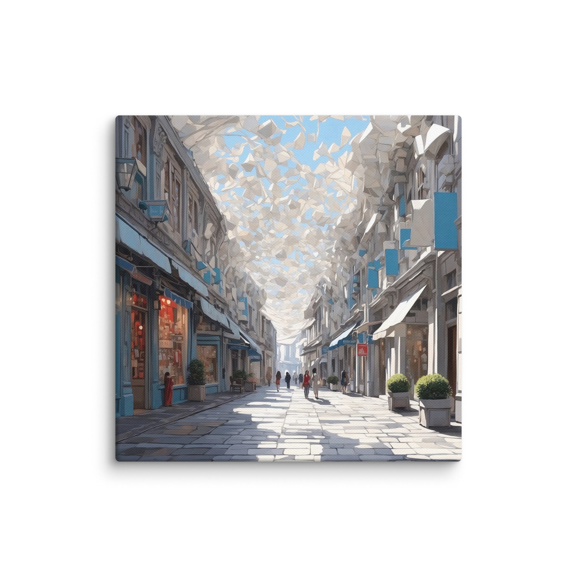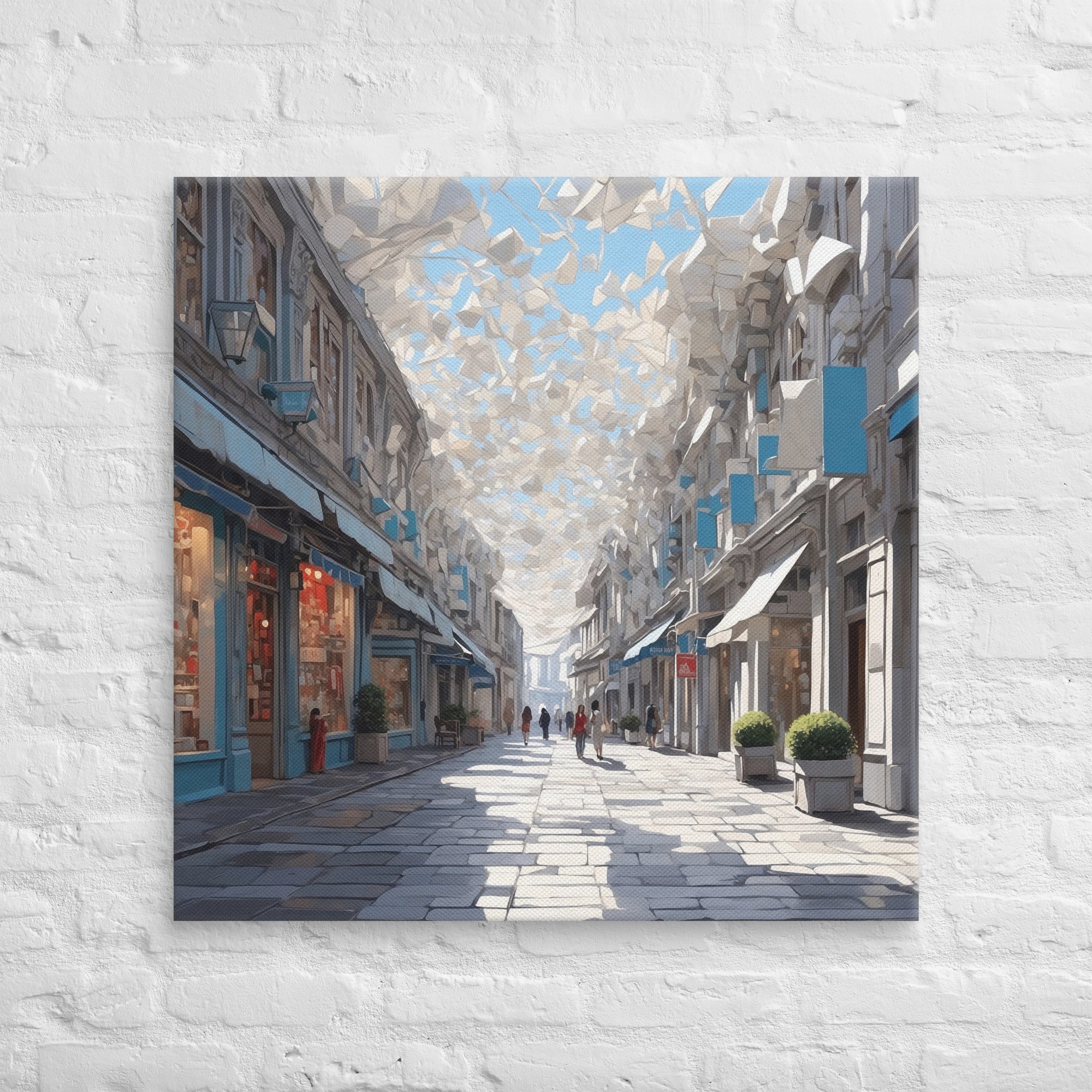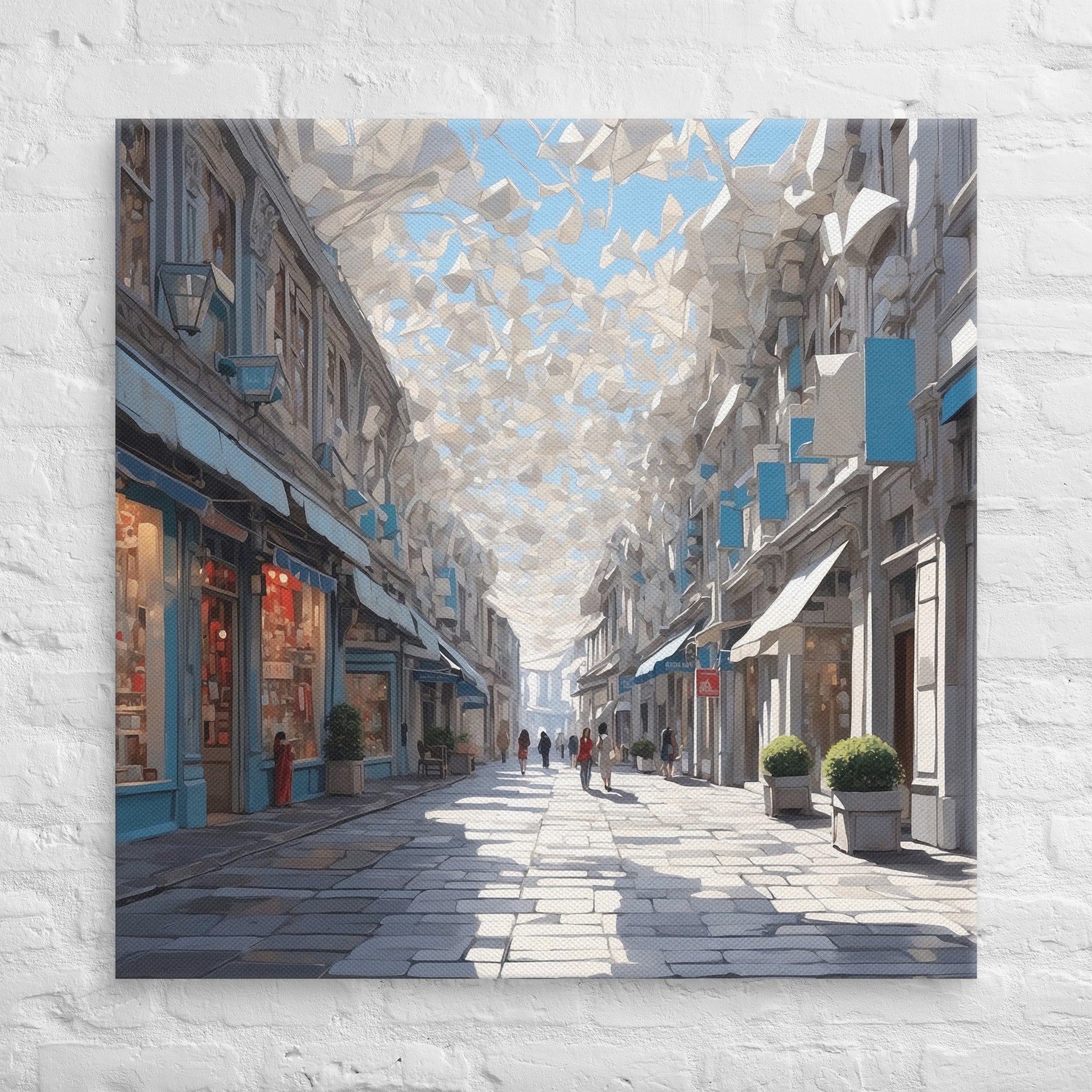 This charming artwork captures a sunlit European shopping street adorned with hanging white canopies and warm architectural tones. The inviting light and calm atmosphere evoke leisurely strolls and timeless elegance, perfect for brightening living rooms, hallways, or studios.