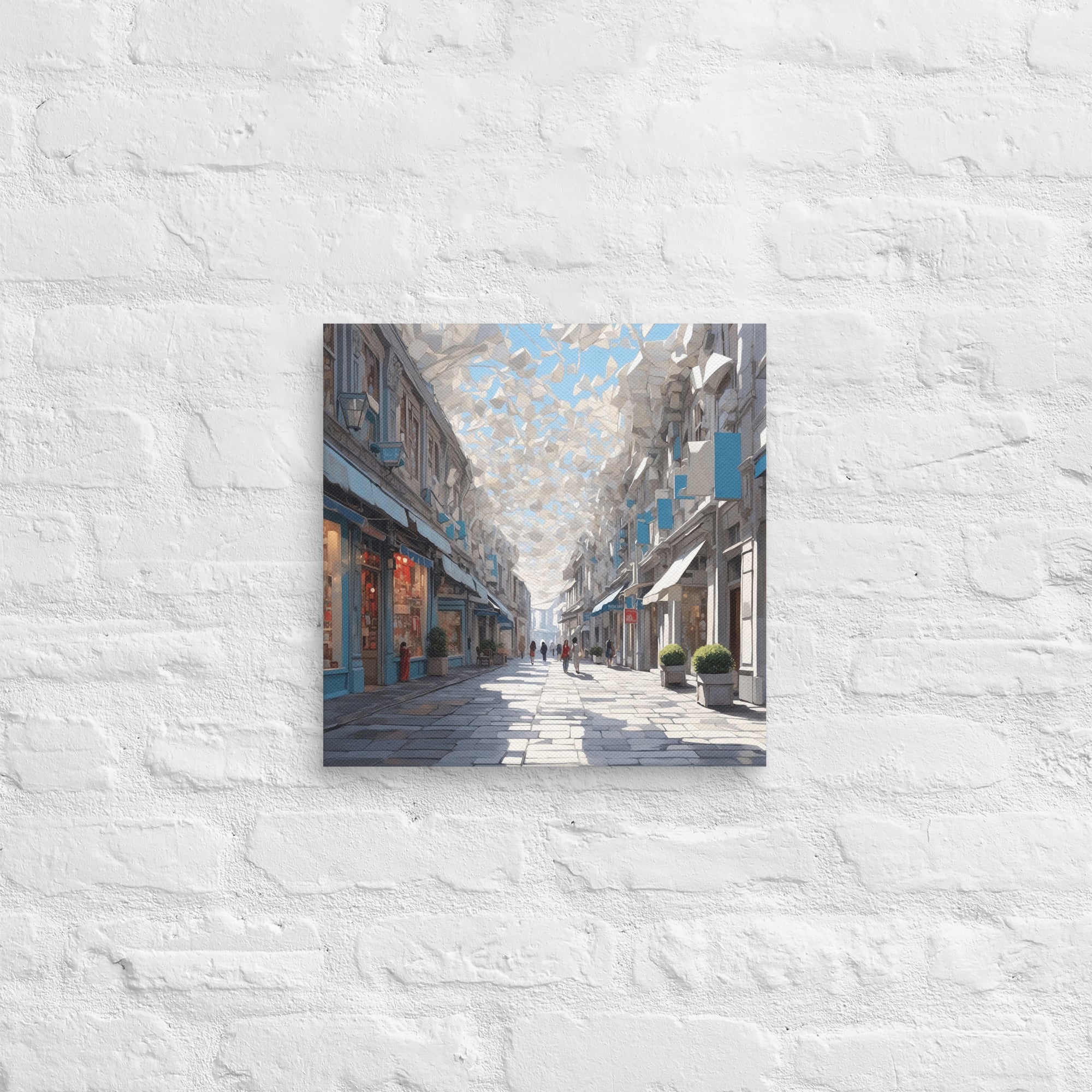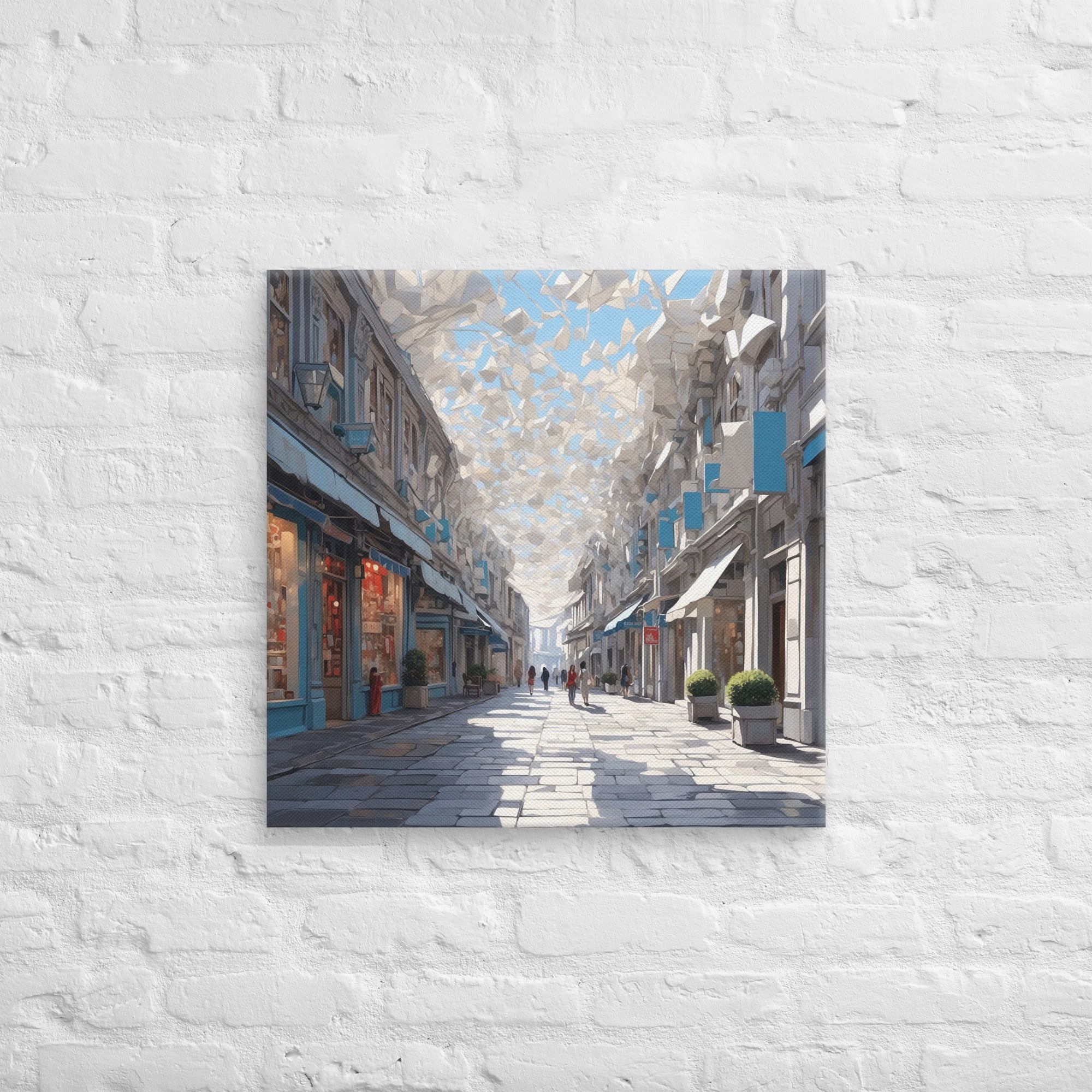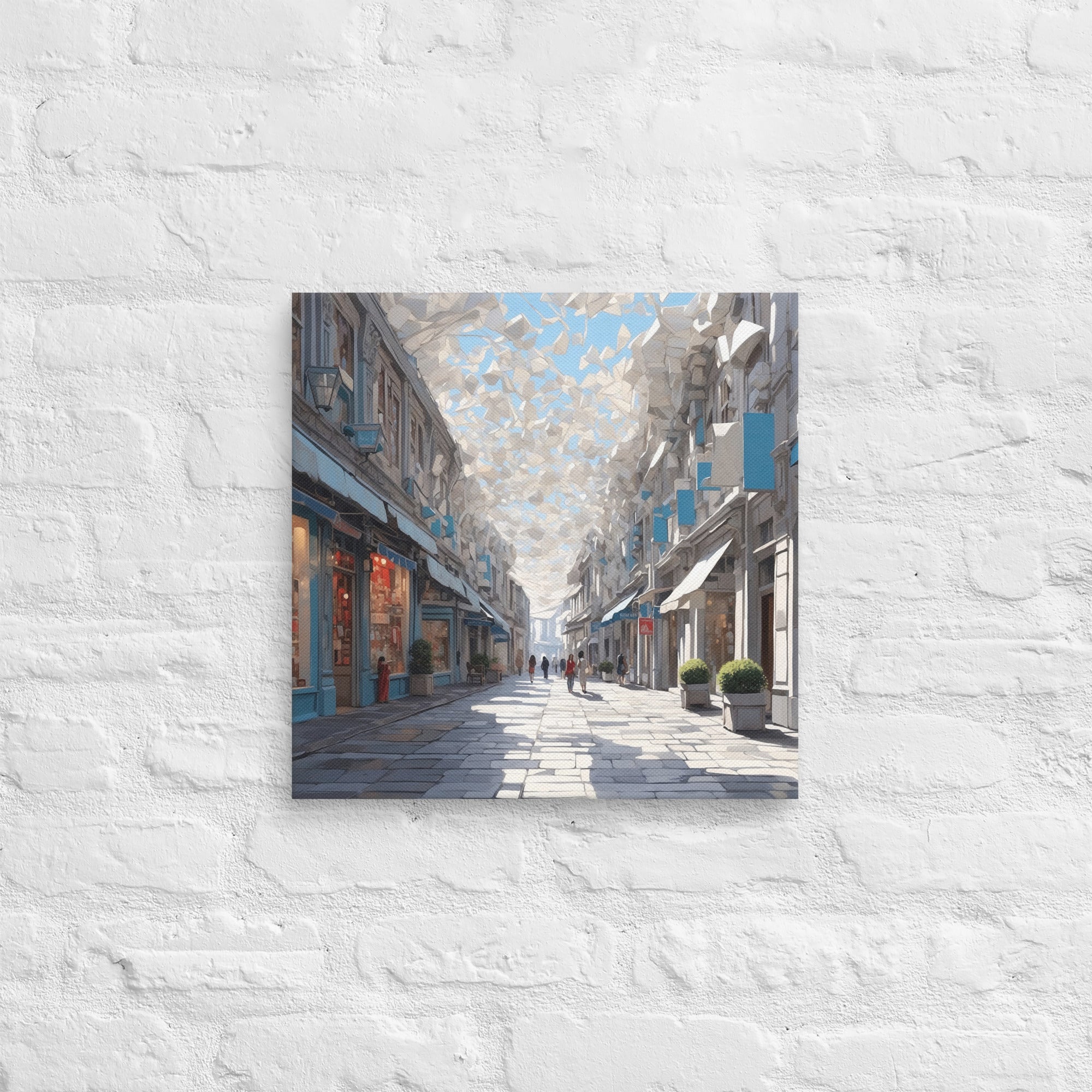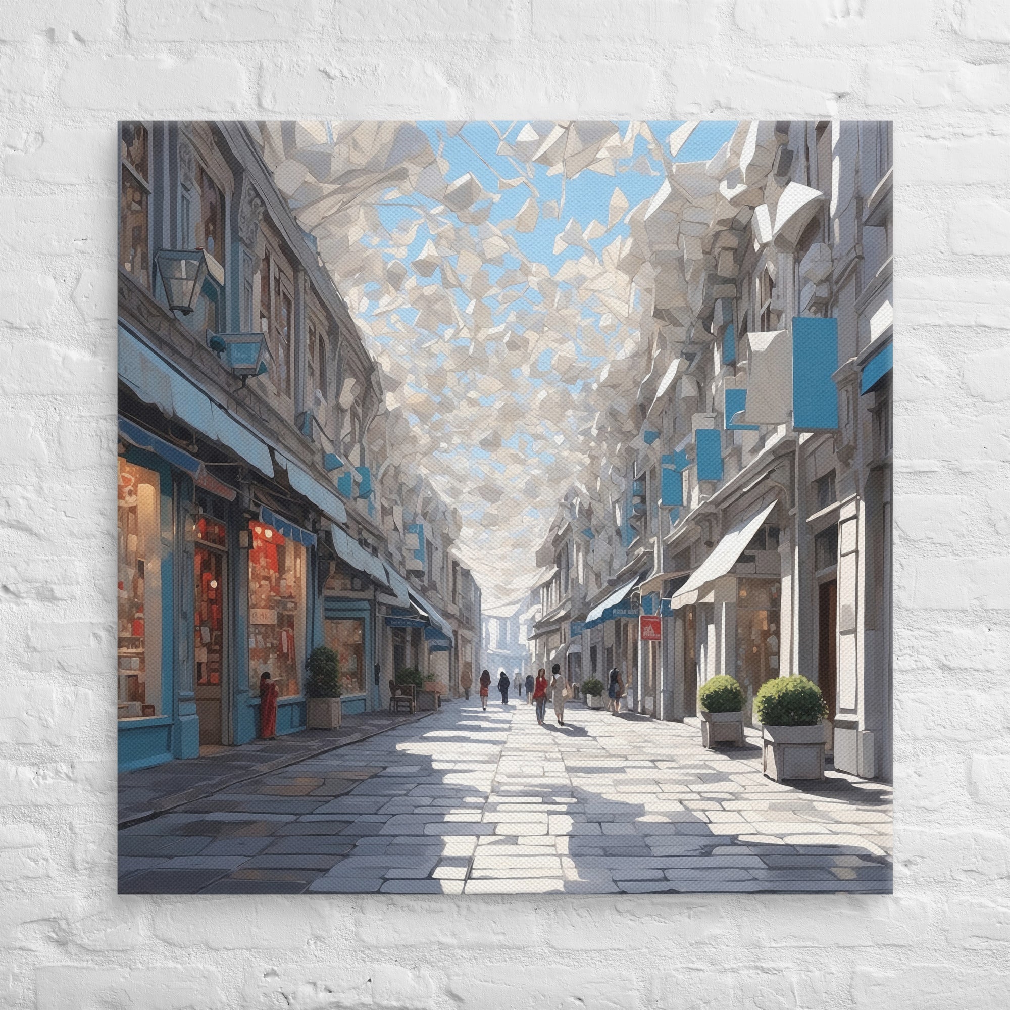 This charming artwork captures a sunlit European shopping street adorned with hanging white canopies and warm architectural tones. The inviting light and calm atmosphere evoke leisurely strolls and timeless elegance, perfect for brightening living rooms, hallways, or studios.